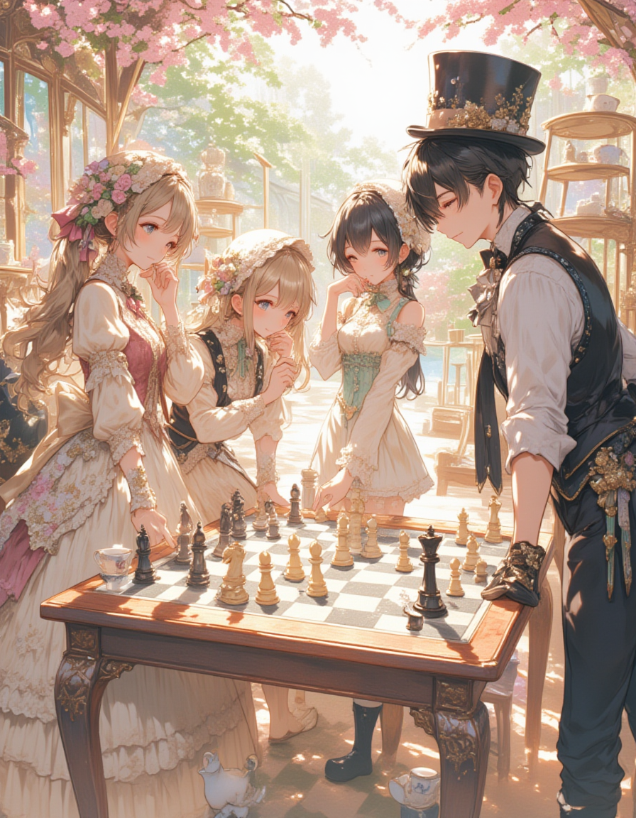 A refined tea party gathering in a whimsical,elegant setting,where characters in Lolita fashion engage in a graceful chess match,sipping tea and enjoying delicate pastries. The chess game adds an intellectual and sophisticated touch to the kawaii atmosphere,with characters focused on the board or exchanging playful glances during the match.,