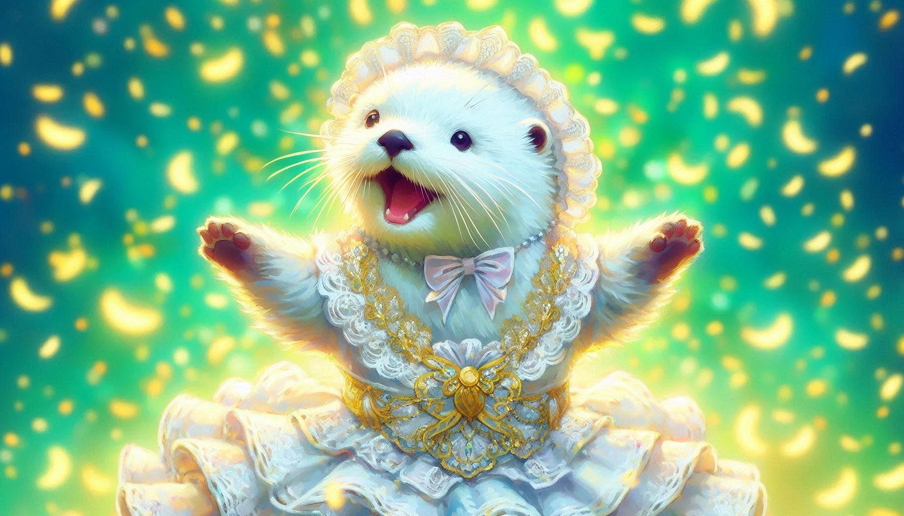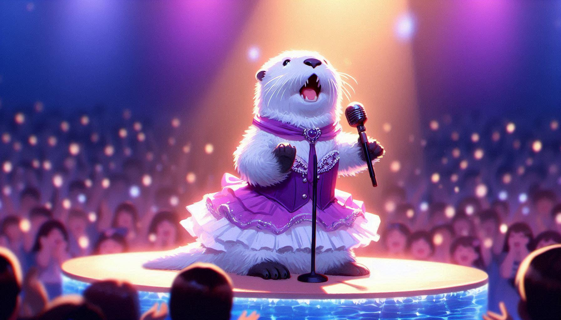 担当マネージャーさんに言われるがまま、ドレスを着て下手な歌を披露する白ラッコ。