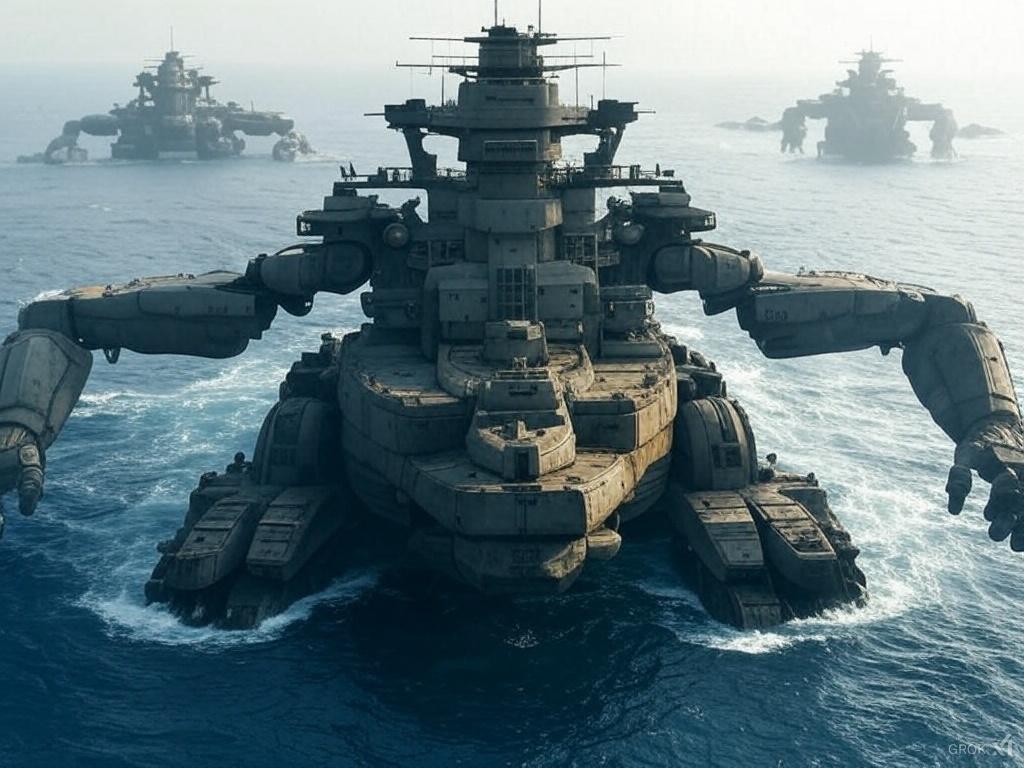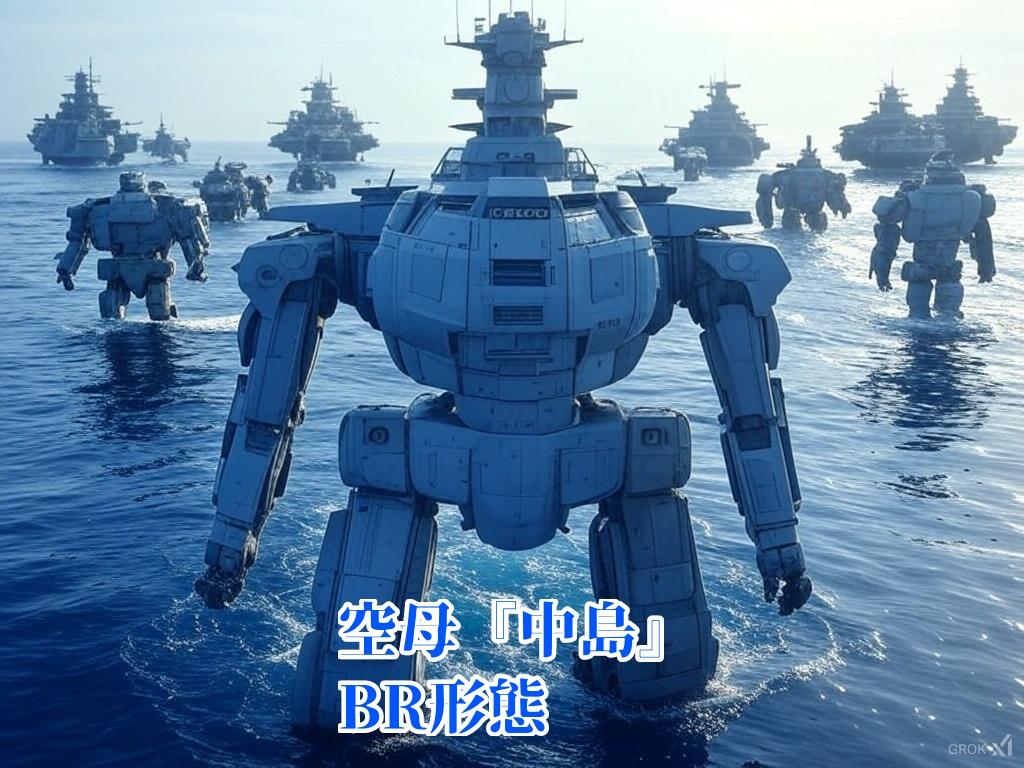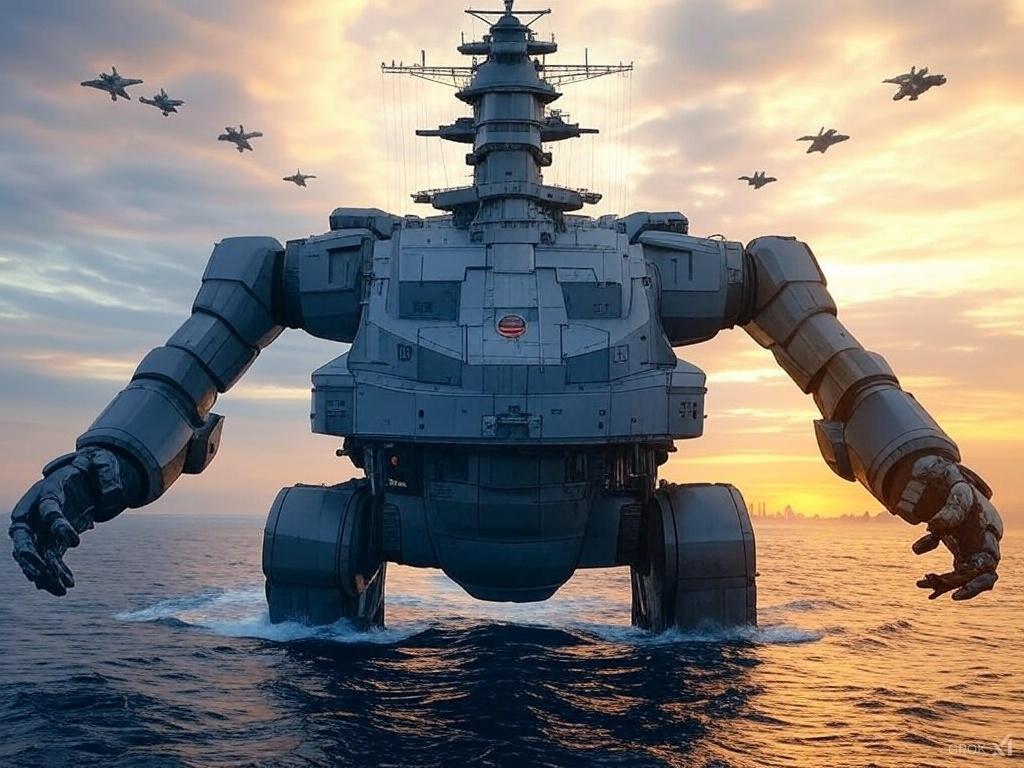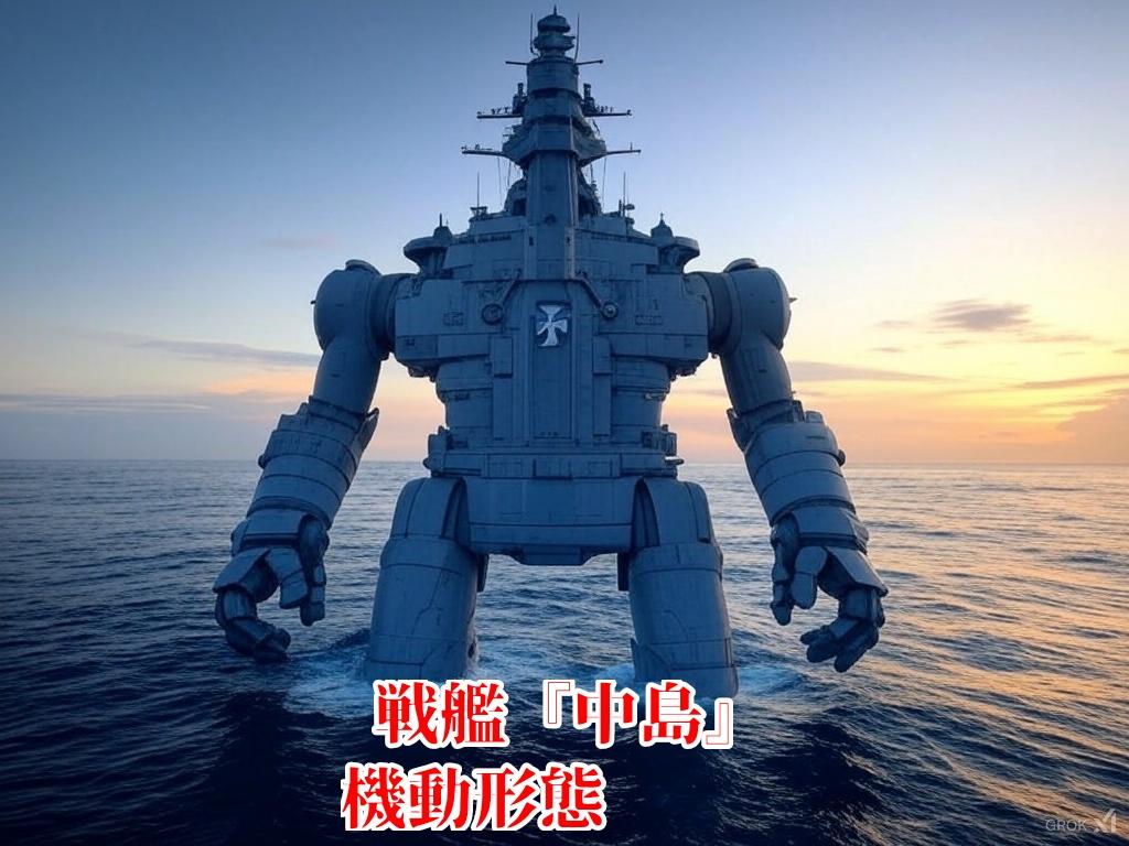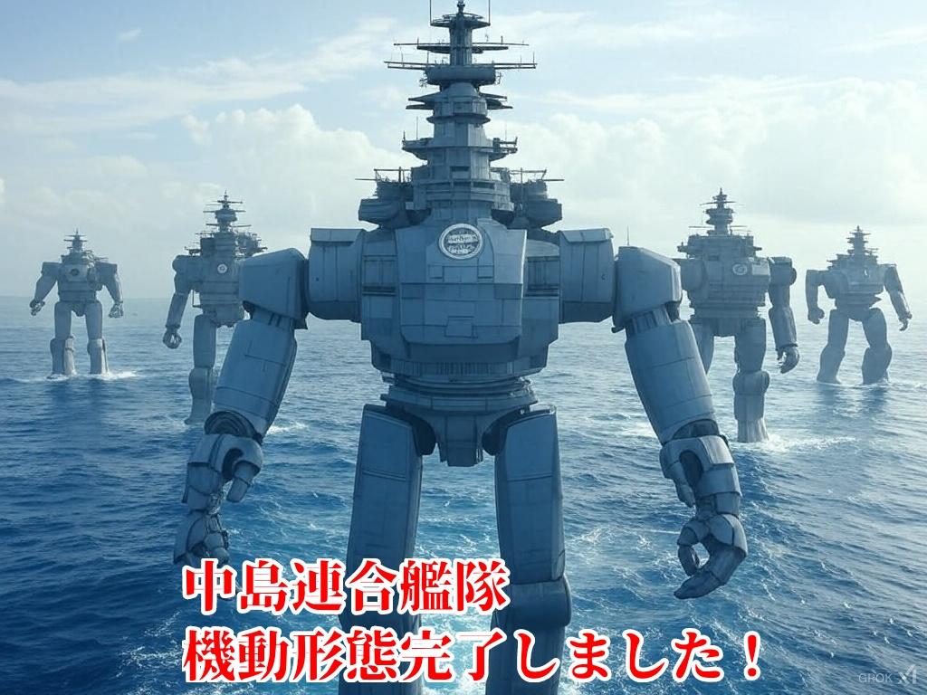 次第に戦艦や空母の形が巨大なロボへと変わる…