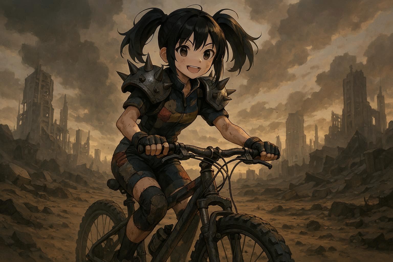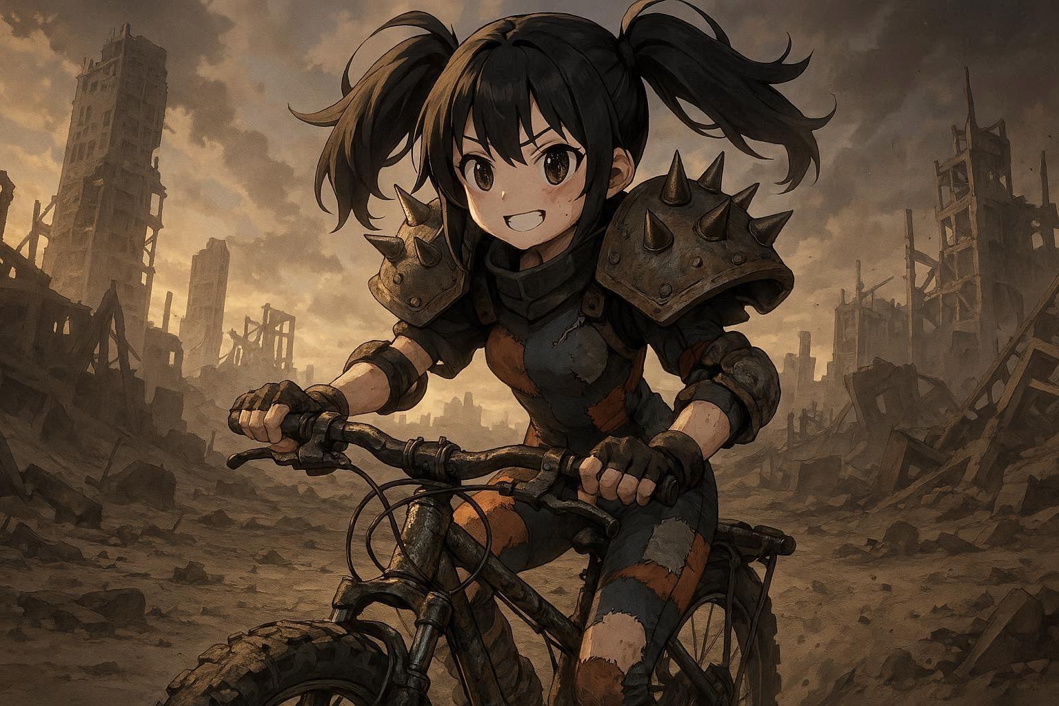 笑顔で自転車を漕ぐ姿がキュート。肩パッドは大きめで世紀末感を演出するが、少女自身は可愛くポジティブ。