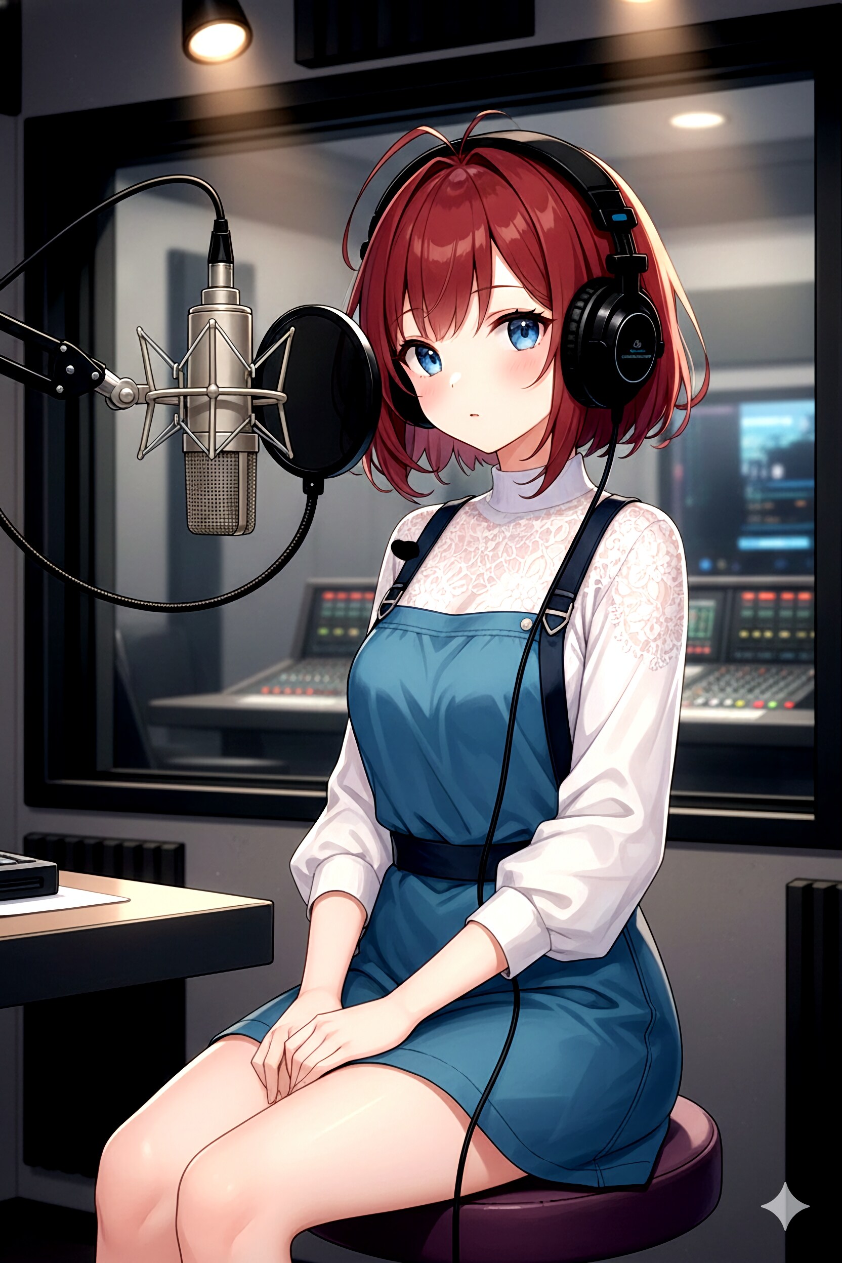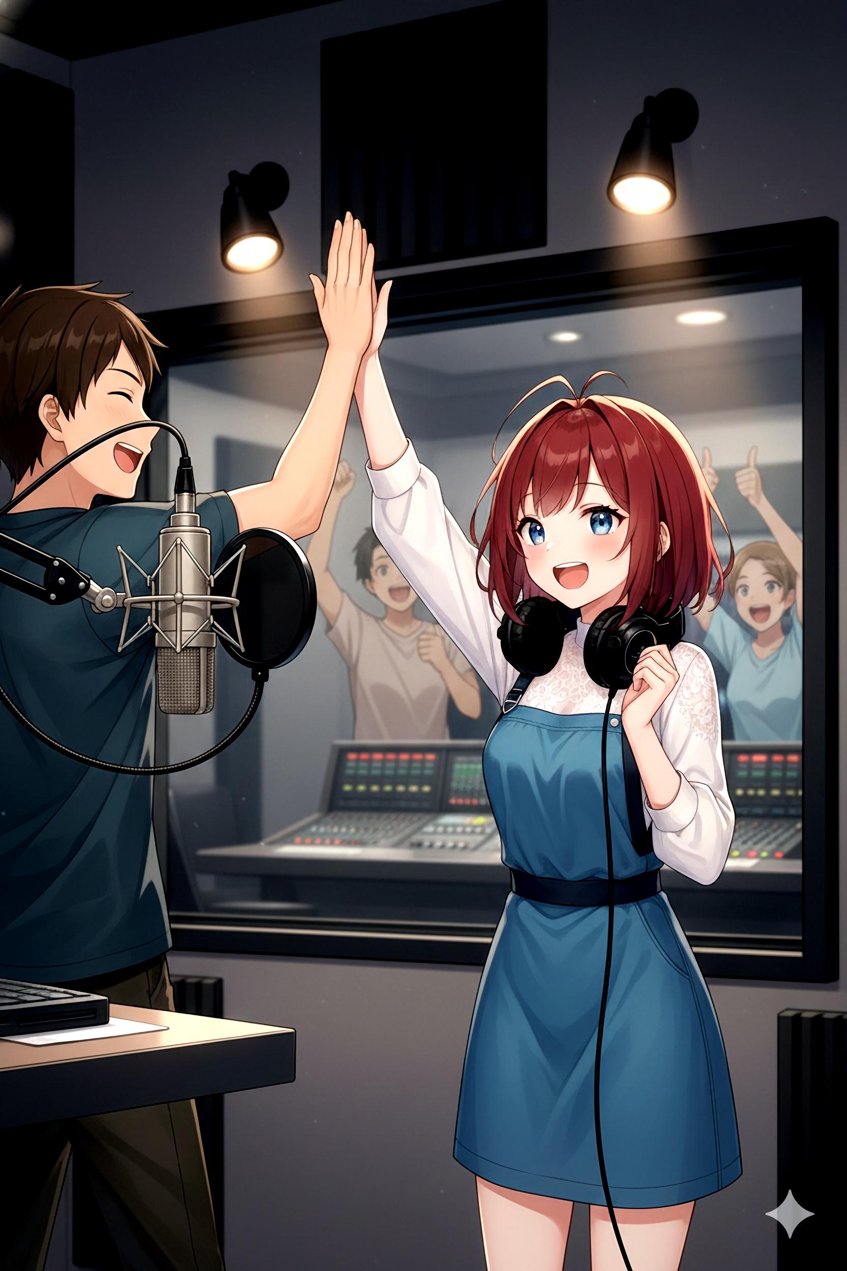 初めてのナレ撮りに緊張していたが、うまくいってスタジオのスタッフとハイタッチするカエデ