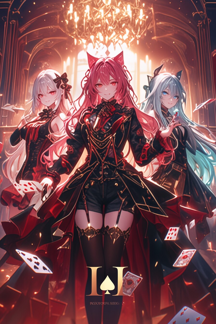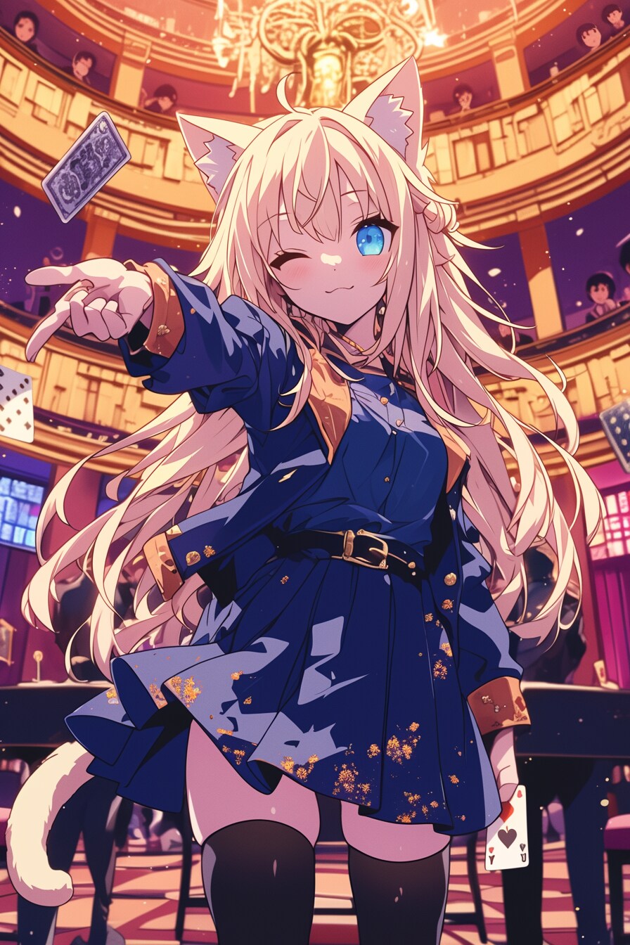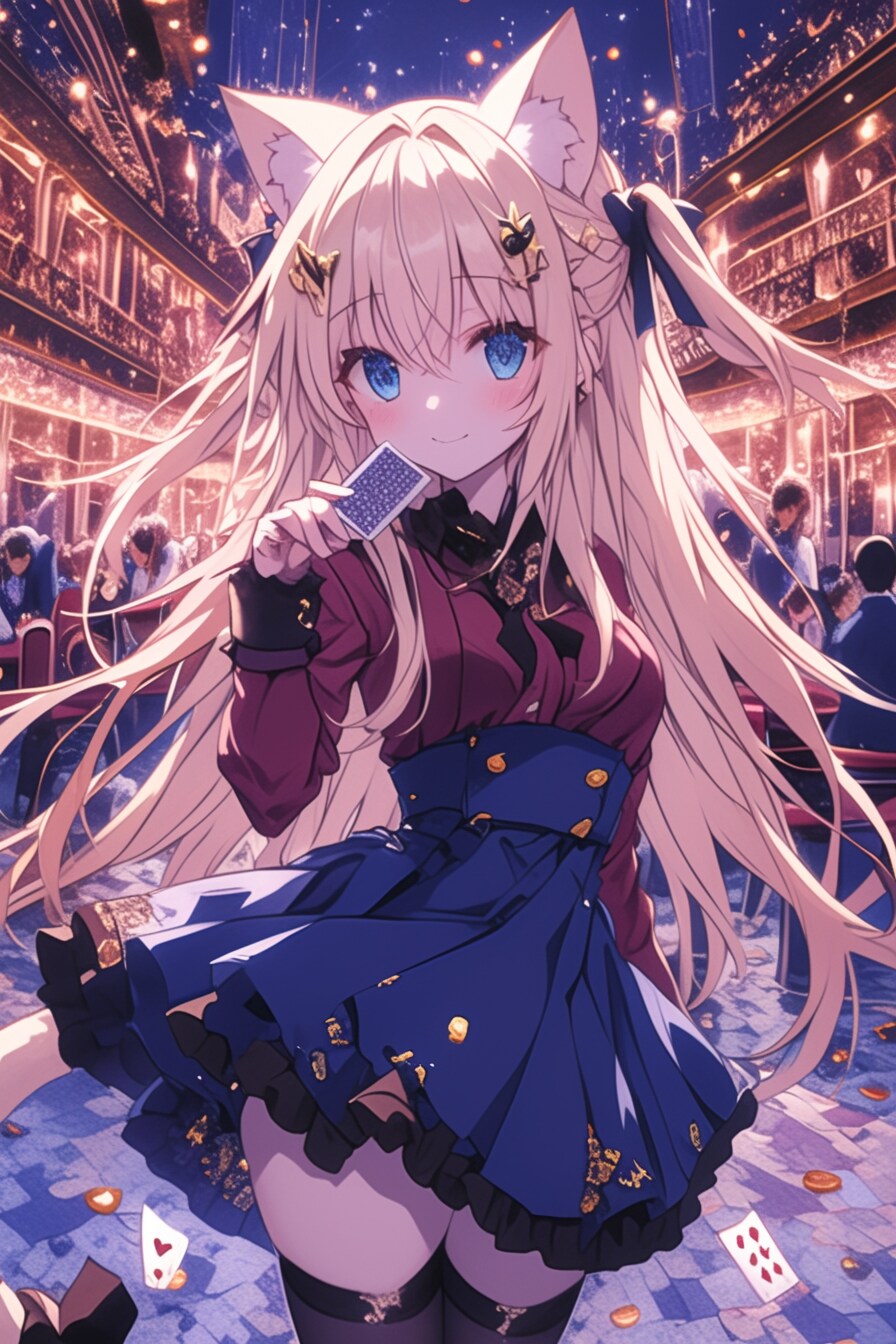 煌びやかなシャンデリアが輝くカジノホール。観客たちの視線は、中央で舞う猫耳の少女に釘付けだった。彼女の名は「ルナ」、この街で評判の若きマジシャンだ。その瞳は自信に満ち、微笑みを浮かべながらカードを舞わせる手つきはまるで魔法のよう。