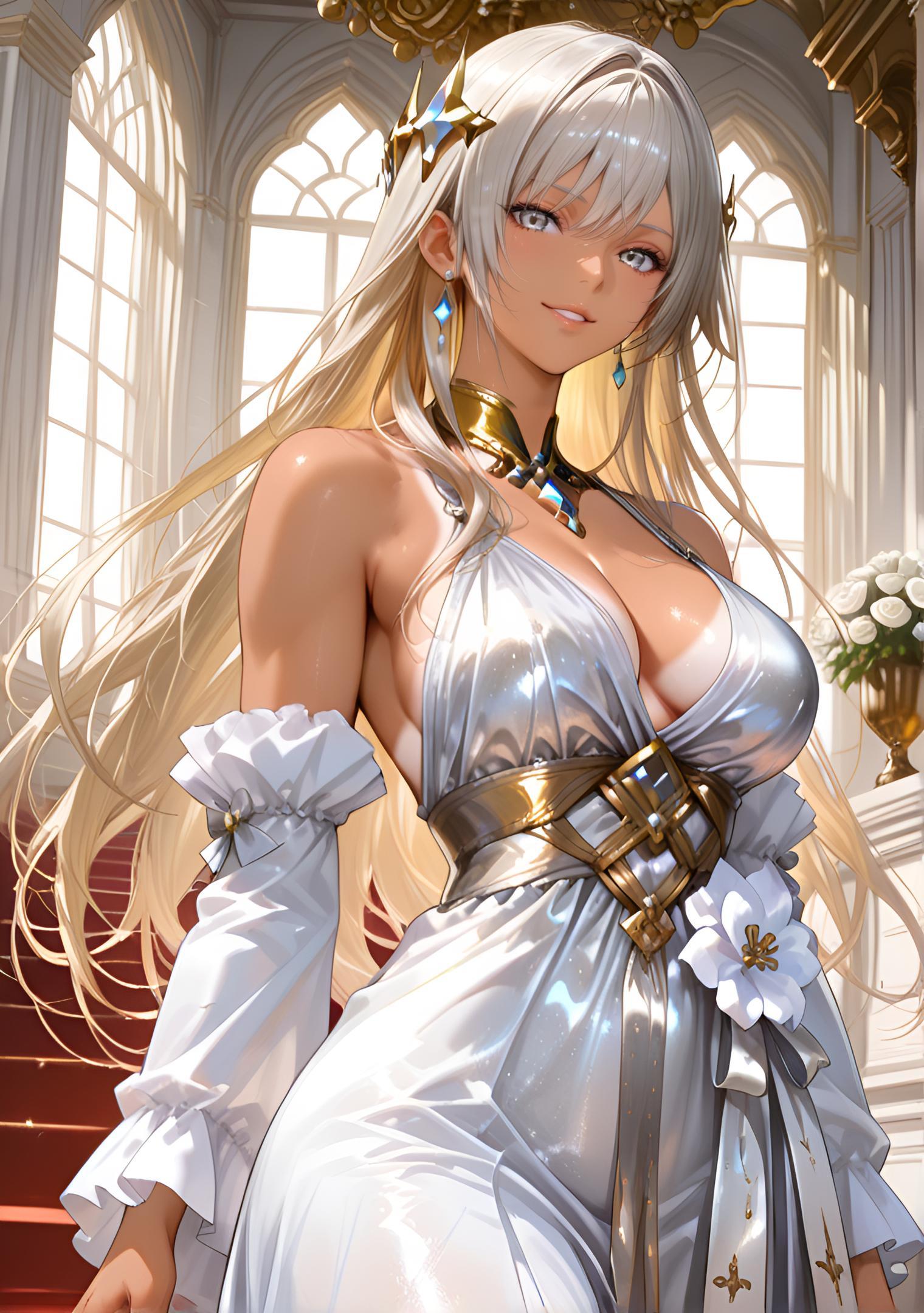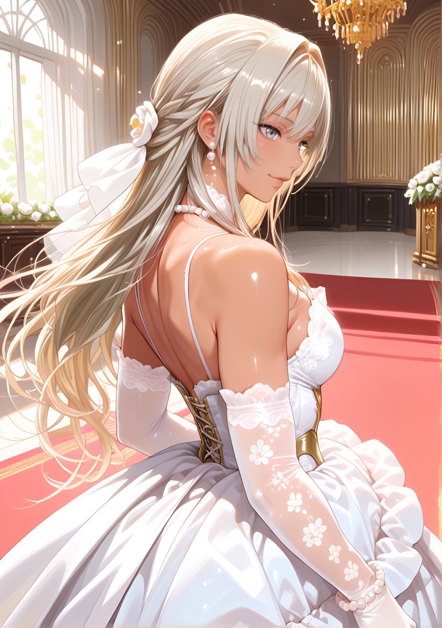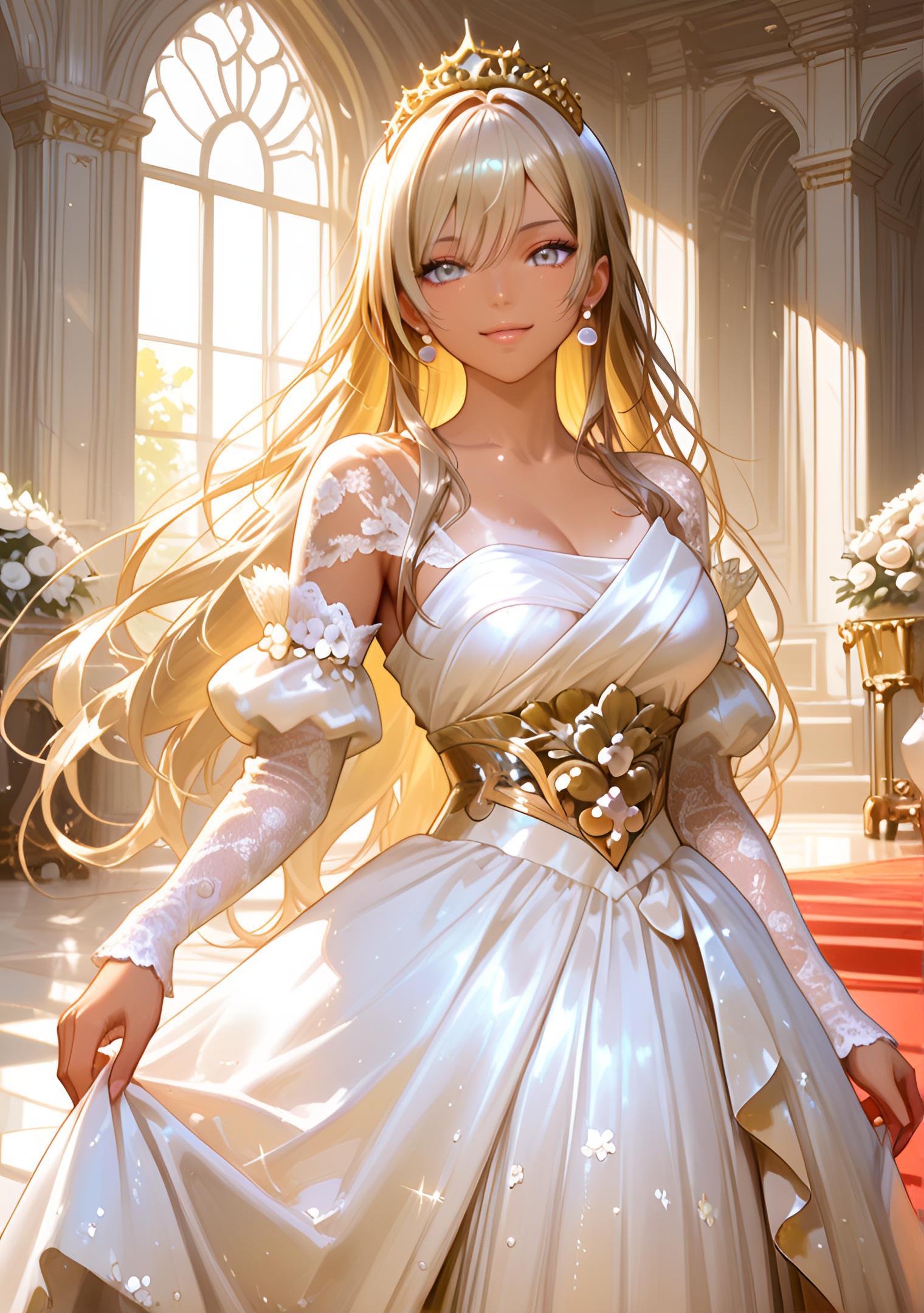 silver-white satin A-line gown with jeweled waistline, diamond hairpiece, drop earrings # 上質なシルバーホワイトのAラインドレス