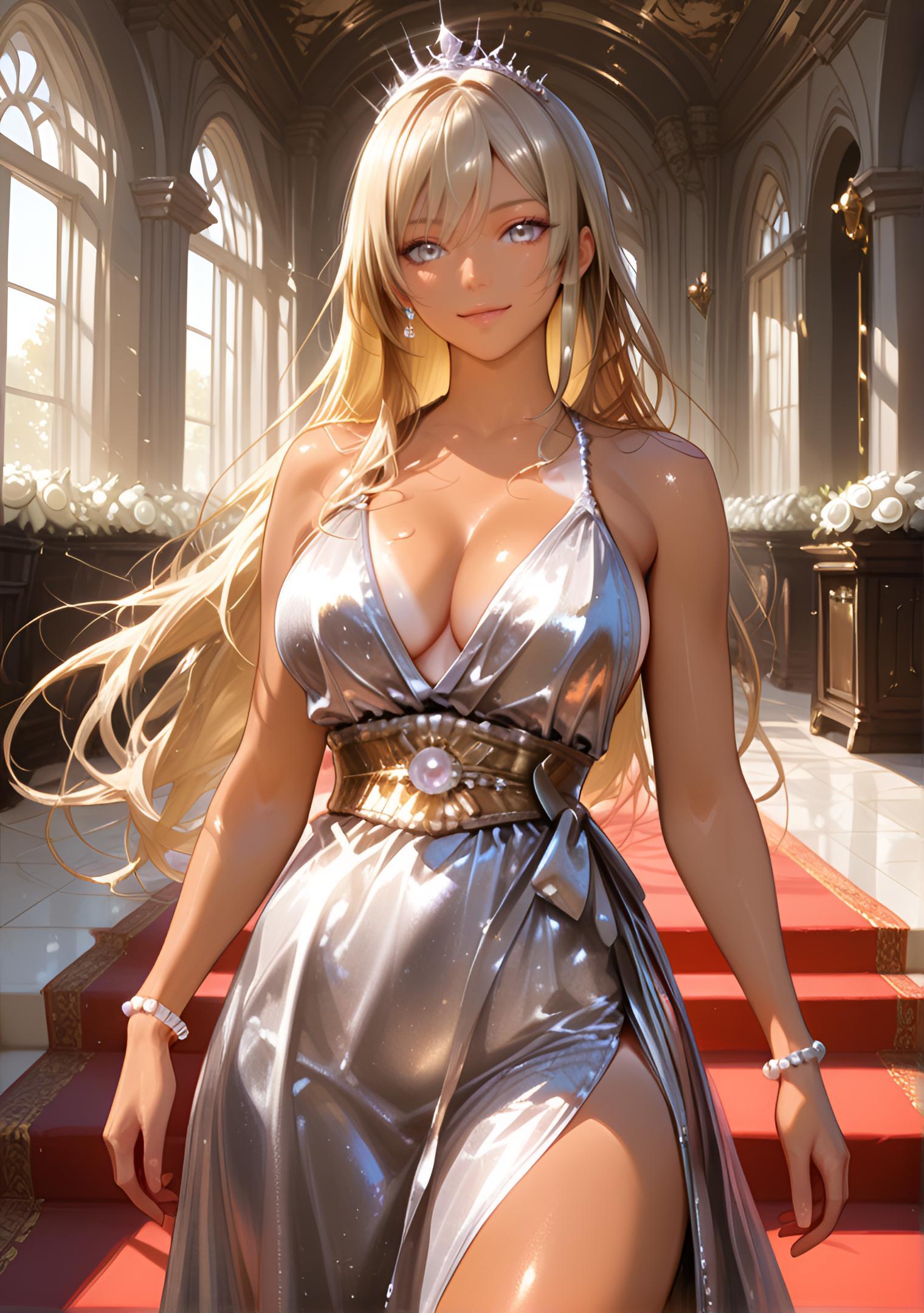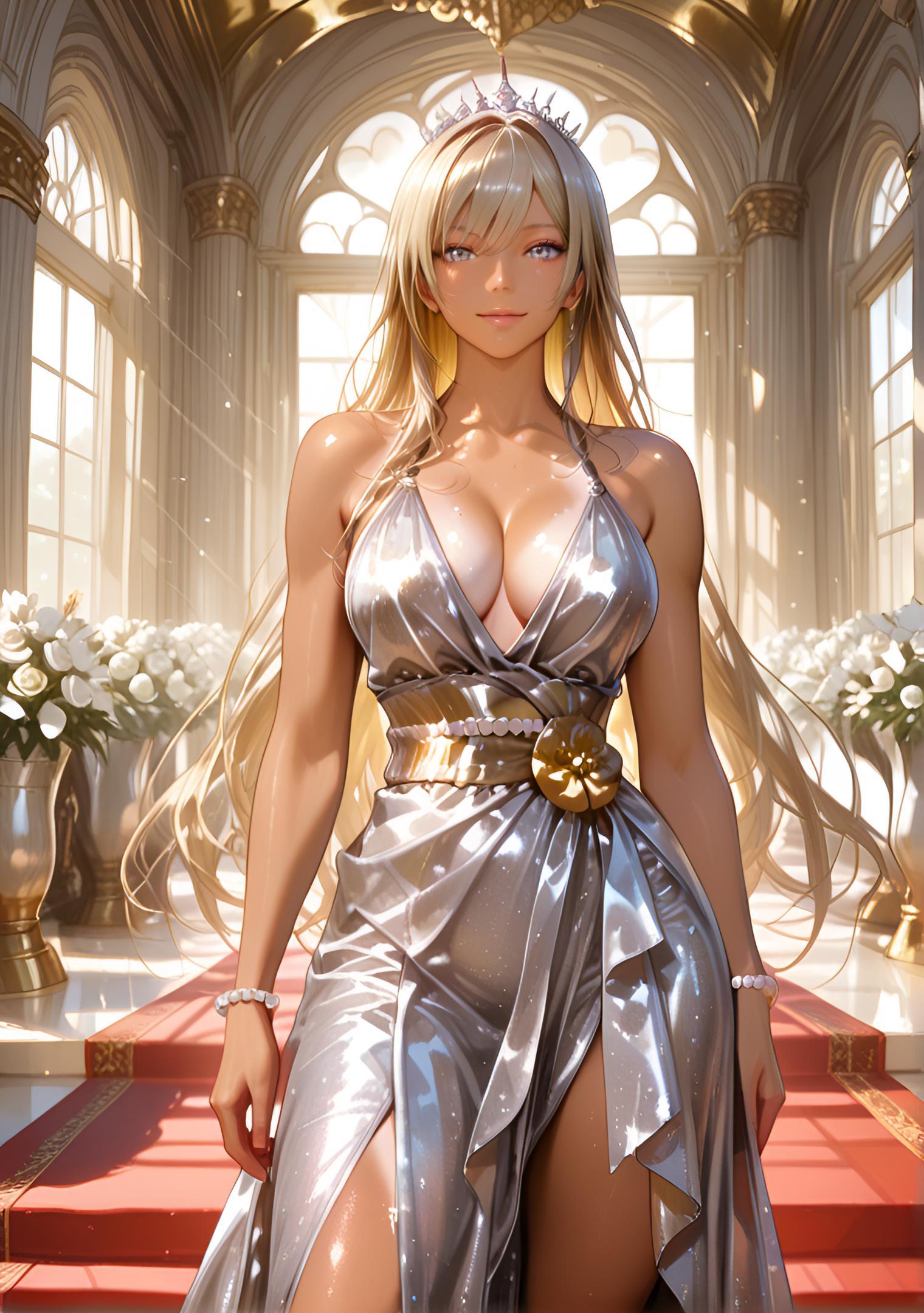 silver silk gown with cowl neckline, pearl bracelet, crystal tiara # 滑らかな銀色のエレガントドレス