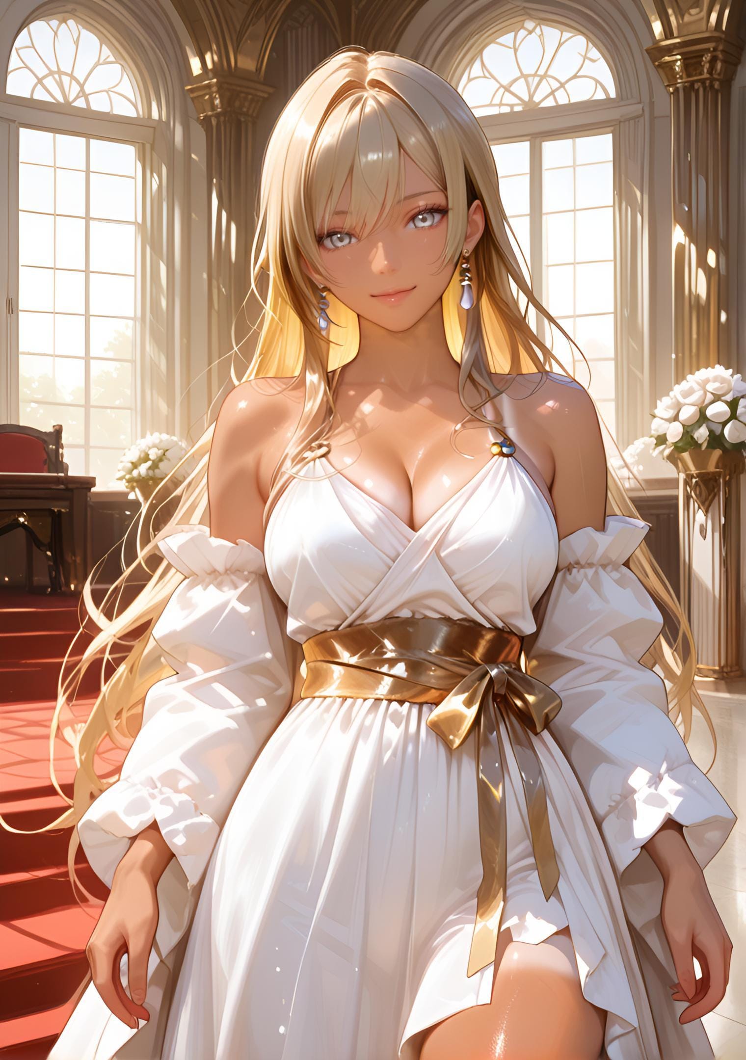 soft white chiffon gown with slit skirt, gold waist ribbon, crystal earrings # 軽やかなスリット入りホワイトドレス
