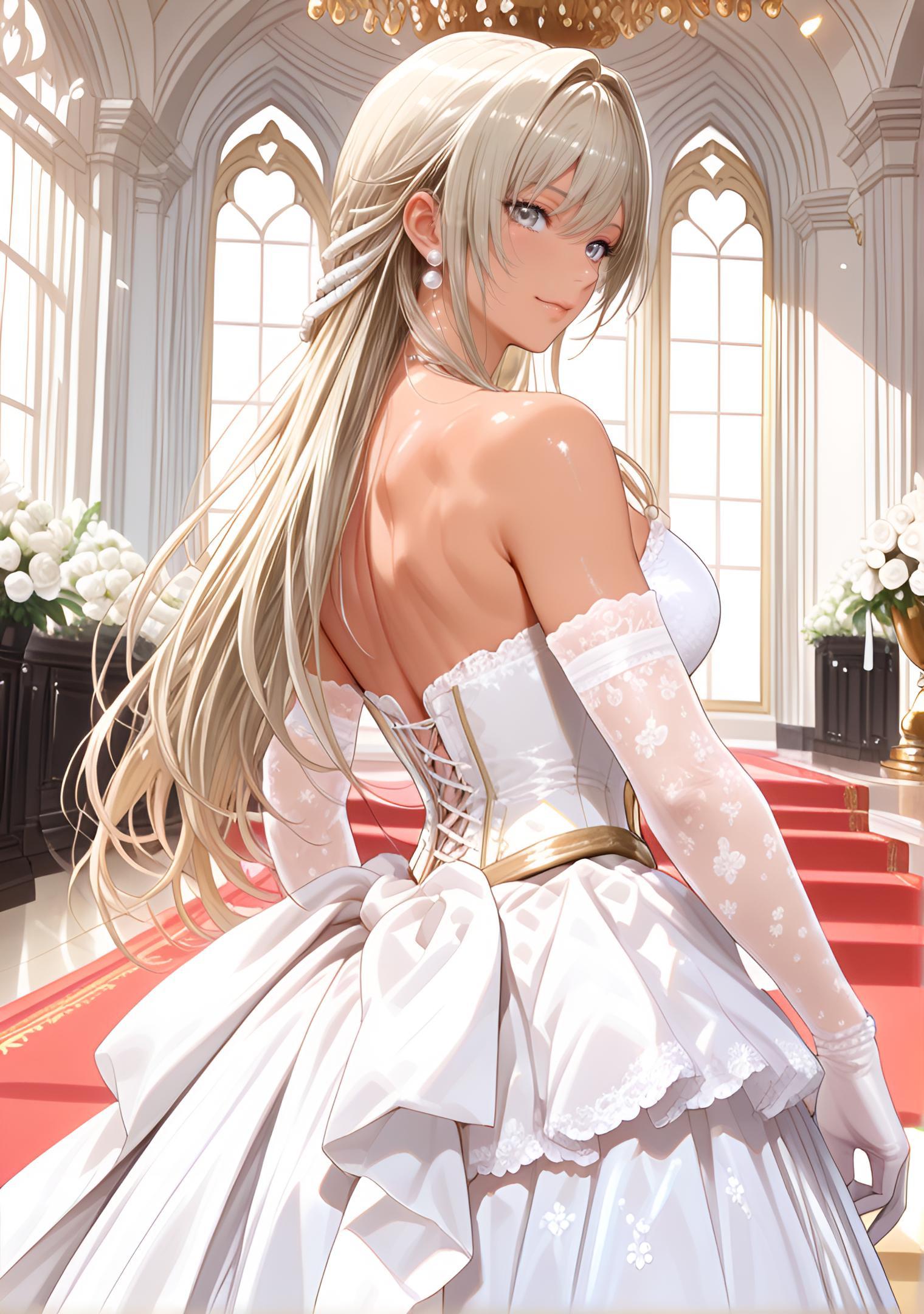 white silk trumpet gown with deep V-back, lace train, silver choker, teardrop earrings # 背中が美しいシルクトランペットドレス