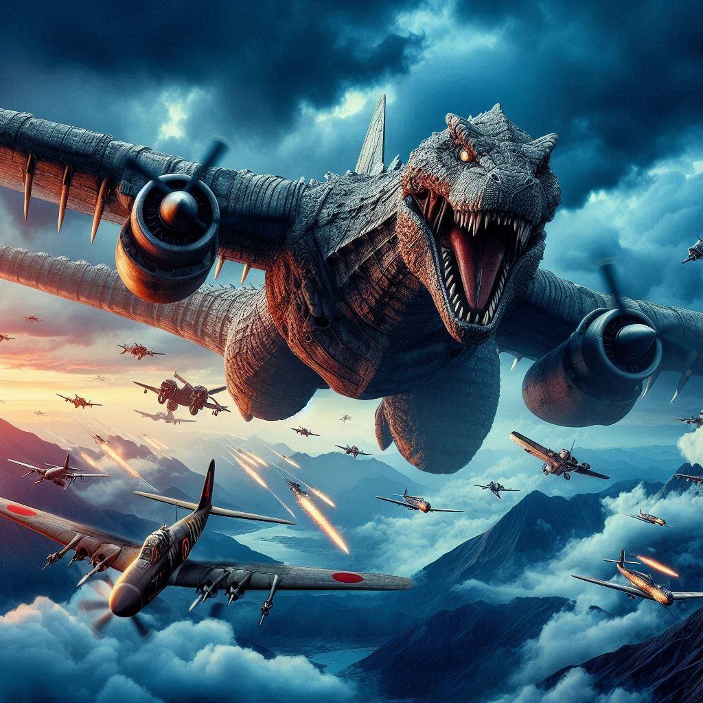 ちょっと”お笑い系のネタ”っぽいイラストになってしまいましたが、某ゴ〇ラ-1.0の冒頭で主人公が臆せず、機銃をぶちかまし恐竜サイズだった頃のゴ〇ラを瀕死に追い込む!(この頃はまだ、超再生は備わってないと仮定?)→日本軍が恐竜サイズのゴ〇ラを回収→ゴ〇ラを兵器転用って流れの私的「妄想if展開」をAIちゃんにイラスト化してもらいました。
