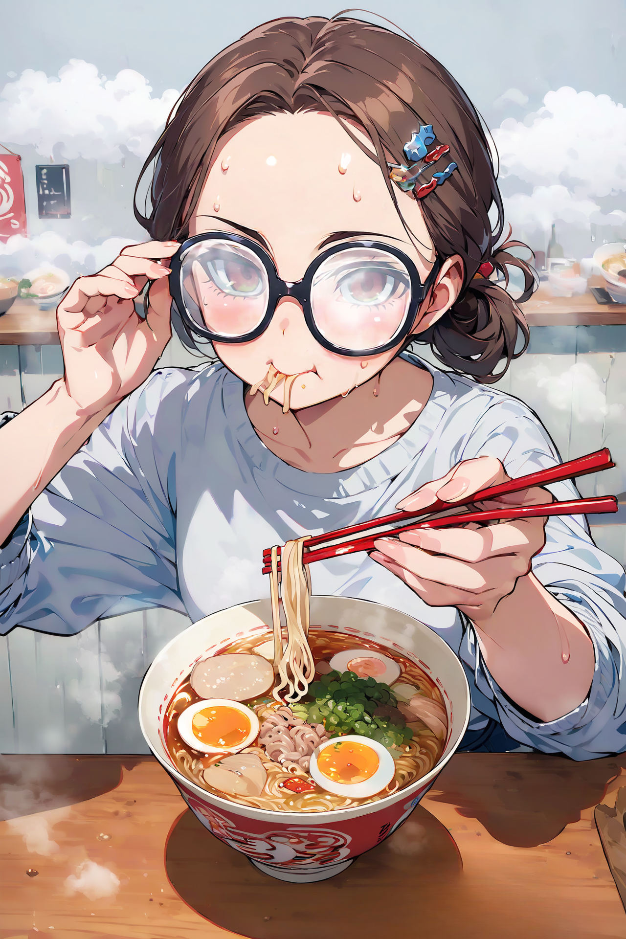 曇る眼鏡に悪戦苦闘しながらラーメンに挑むおねいさんです。