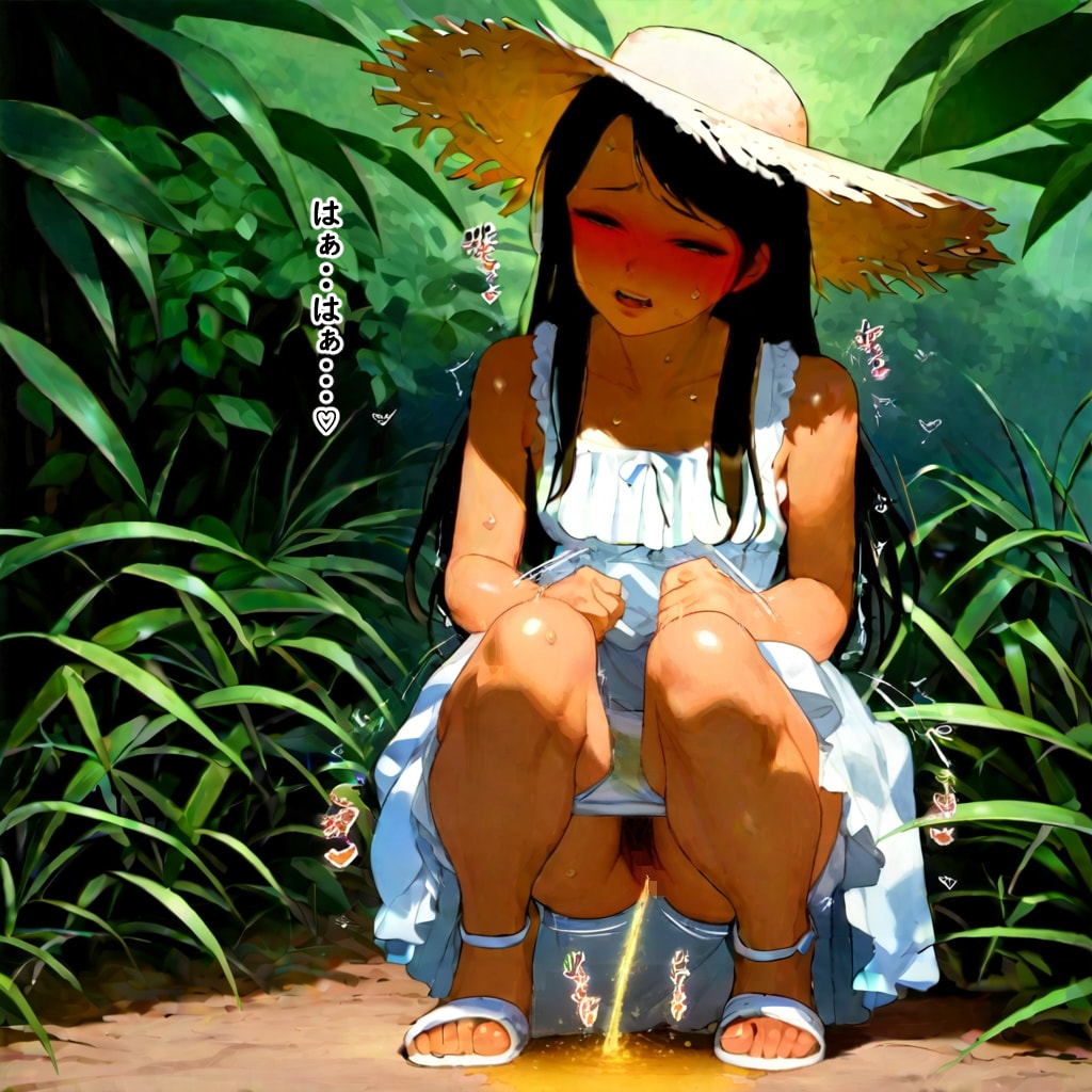 panties pull, dress tug, ahegao, thin pubic hair, pussy, half closed eyes, light blush, small open mouth, sigh, violent spurt of pee from pussy, parabolic peeing, heavy sweat, outdoors, nature, ountryside, plant, weeds, dirt ground, spectacular view, magnificent view, twitching, body trembles, motion lines,