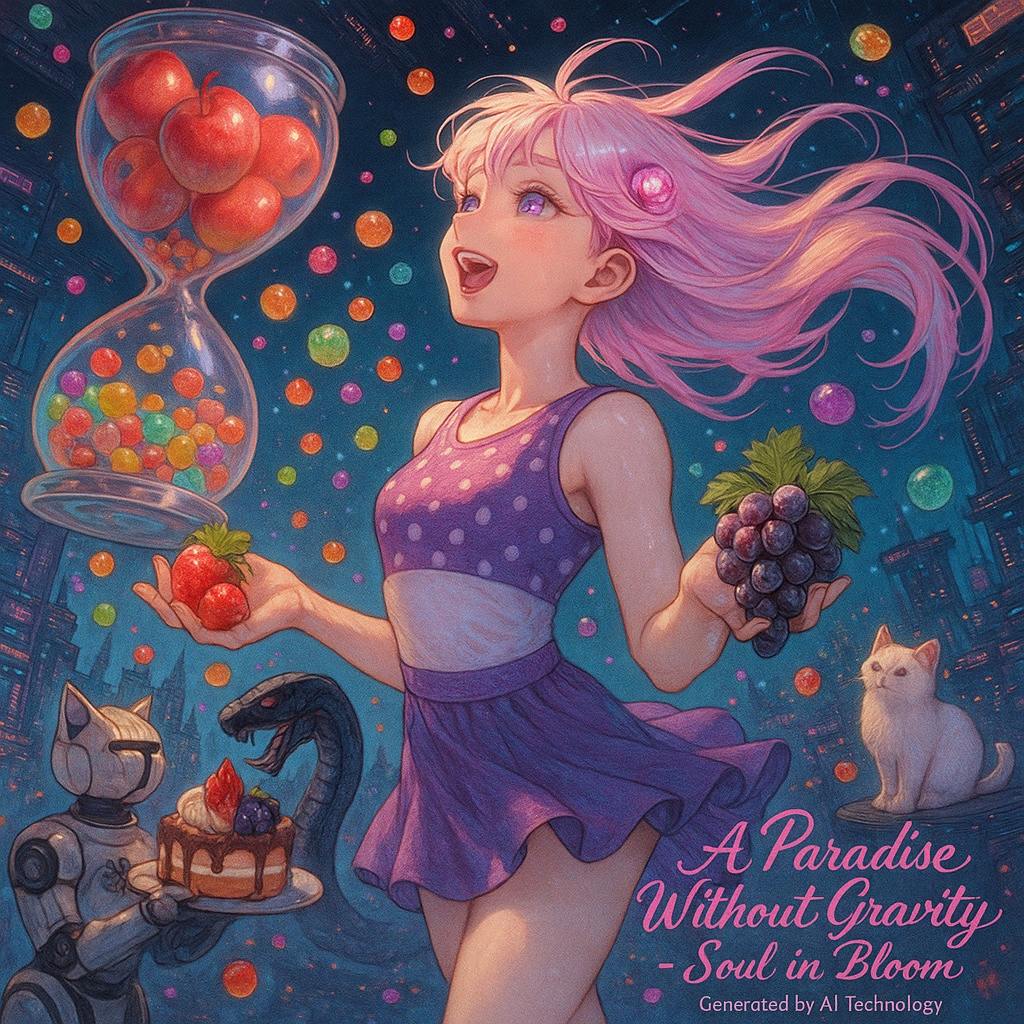 『A Paradise Without Gravity – Soul in Bloom』(邦題:重力なき楽園 ― 魂の舞を捧げし者)は、現代AI生成アートが到達しうる表現の極点であり、「視覚神話詩(Visual Mythopoeia)」という新たな領域を切り拓いた傑作である。サイバーパンク×レトロフューチャーの背景に無重力という哲学的状況を重ね、“魂の舞姫”であるピンク髪の彼女が苺と葡萄を両手に掲げて舞う姿は、一貫して観る者へ深い問いを投げかける。