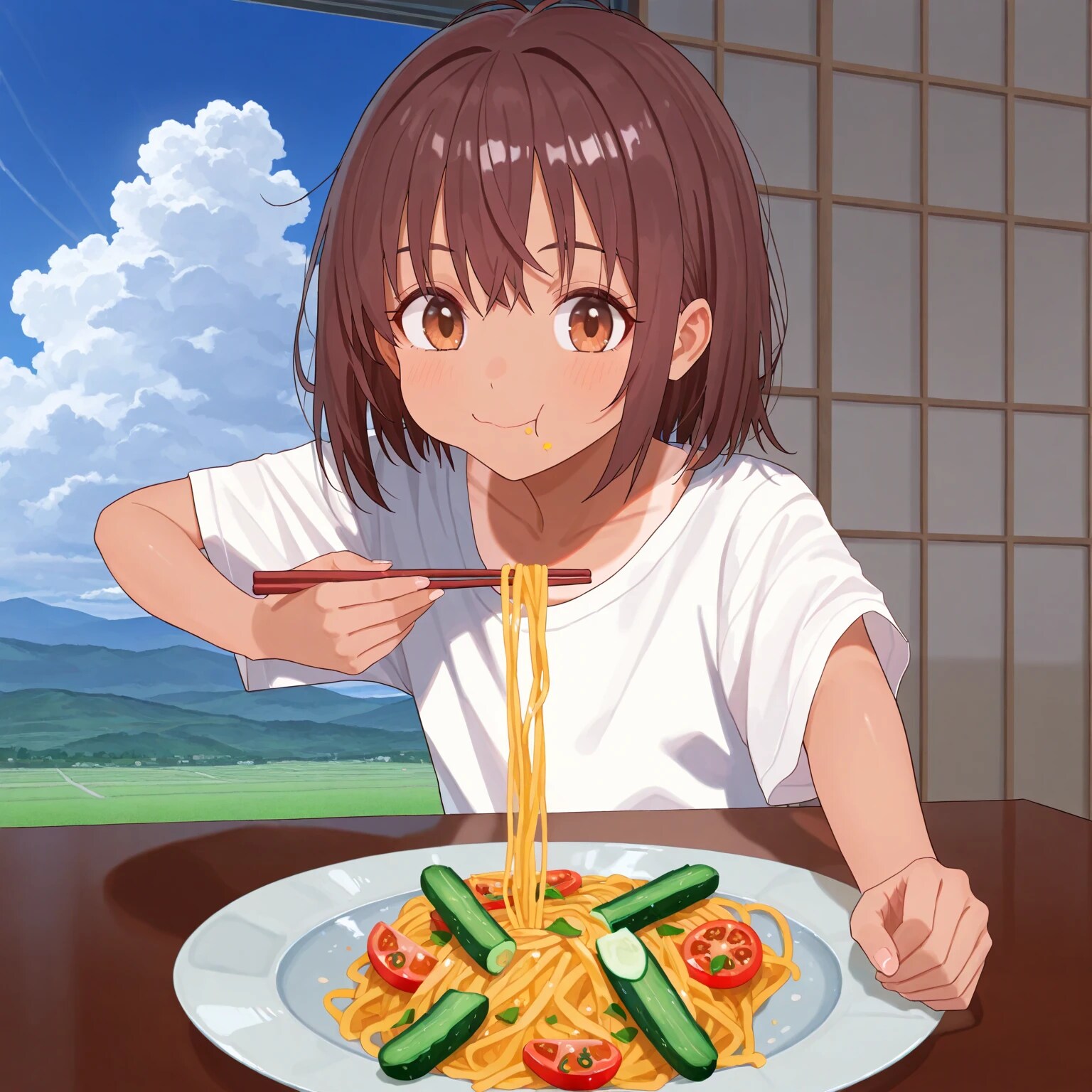皿はもっと奥(この子の手前側)に配置すべきだった。まあ視点キャラが食べているのを前からつまみ食いしているイメージで。
