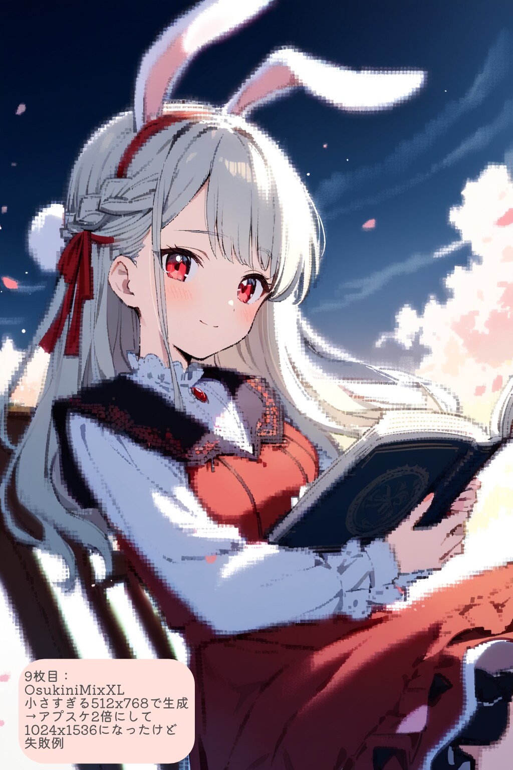 ・エリアーヌはうさ耳をwhite rabbit earsで指定しているのですが、髪がはっきりplatinumになってかつうさ耳はwhiteで色の違いがはっきり出たりする挙動がありました。これはSD1.5では起こらなかったのでSDXLならではですね。
