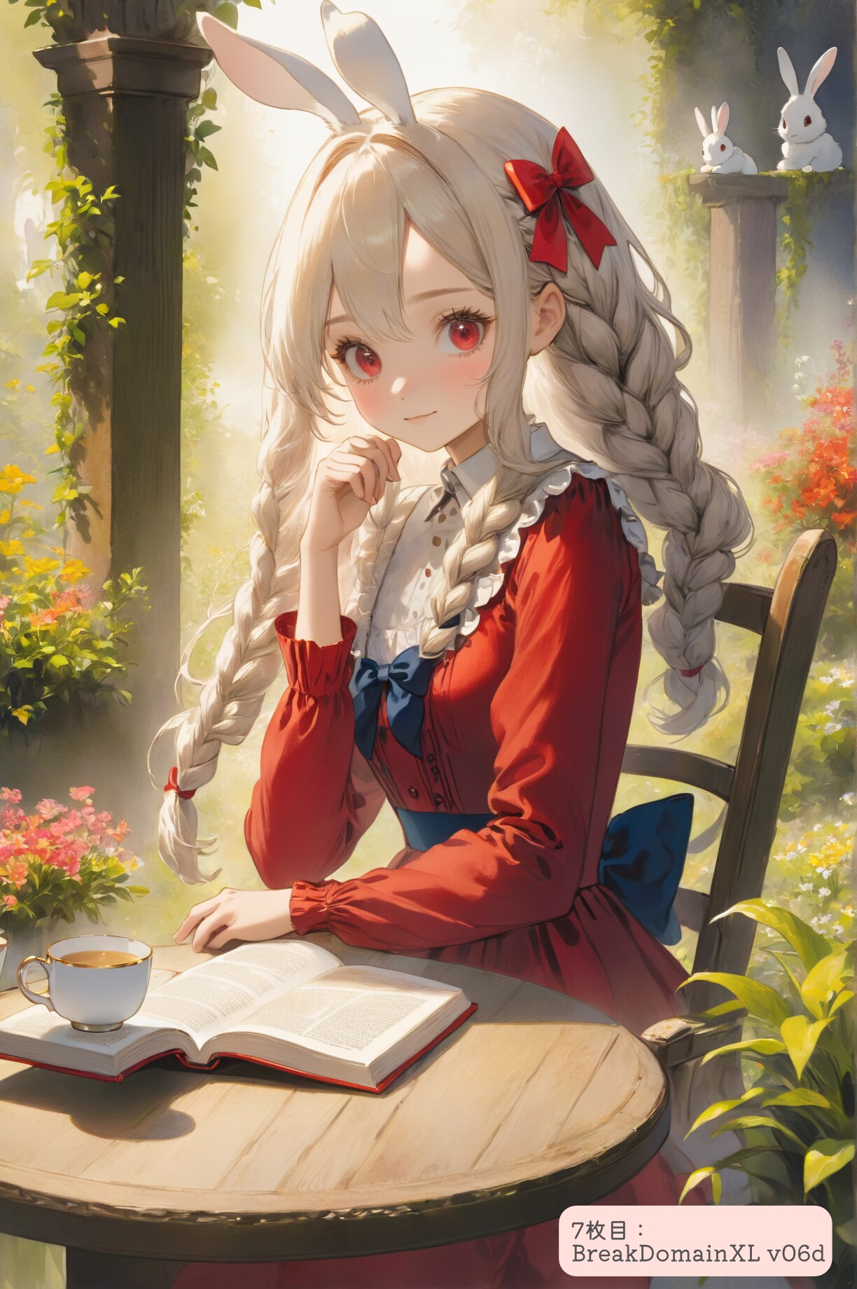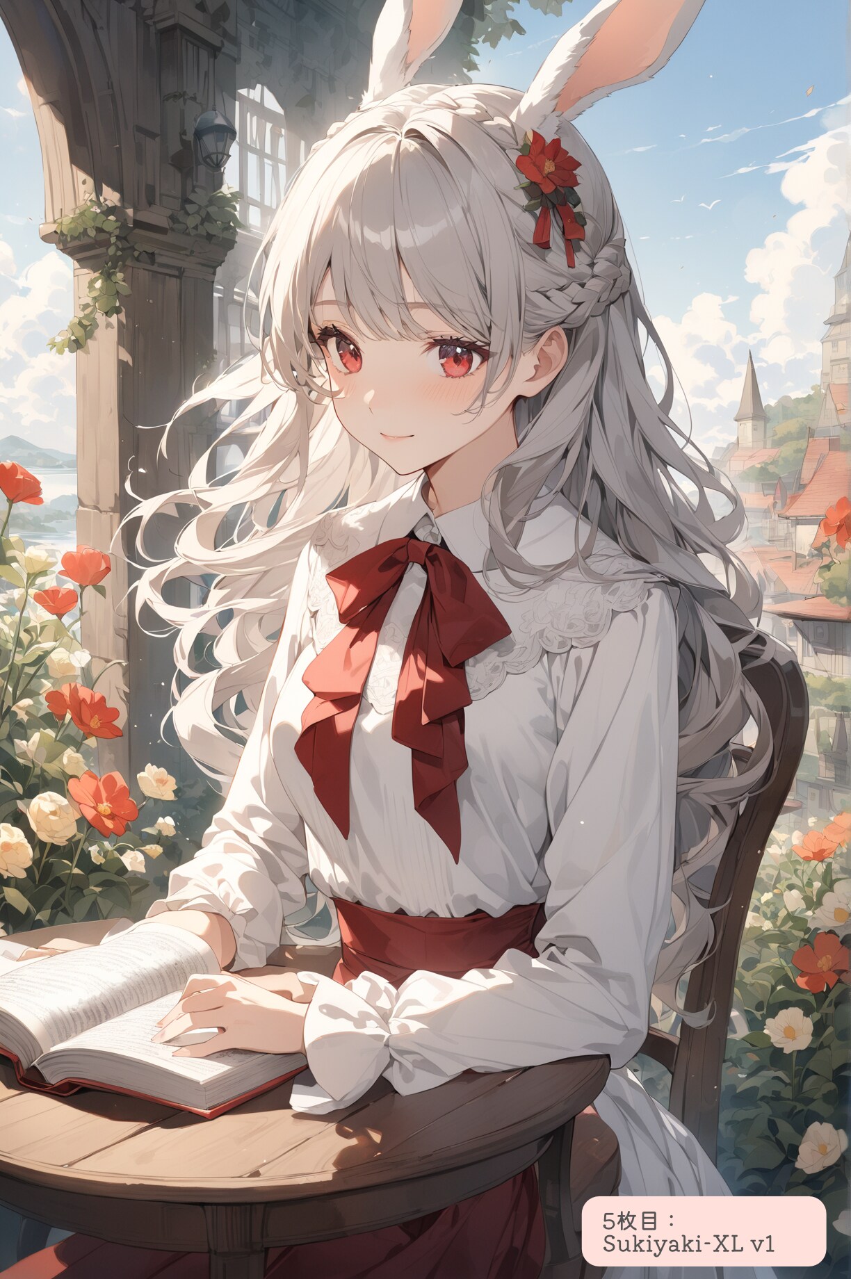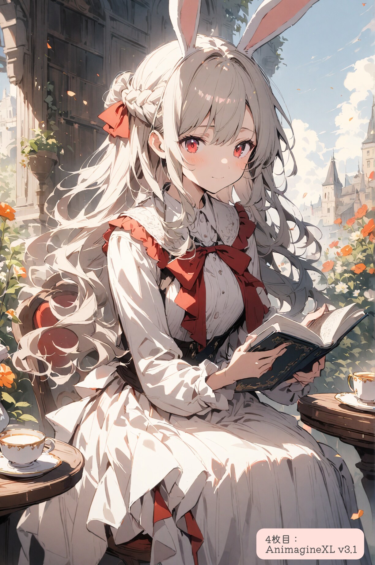 6枚目:ShiratakiMix XL v1:これも良き。上のSukiyaki-XLと構図が同じなので直系なのでしょう。背景の上半分の湖と城はエリアーヌが読んでいる本の中の情景だと思うことにすればヨシ...!