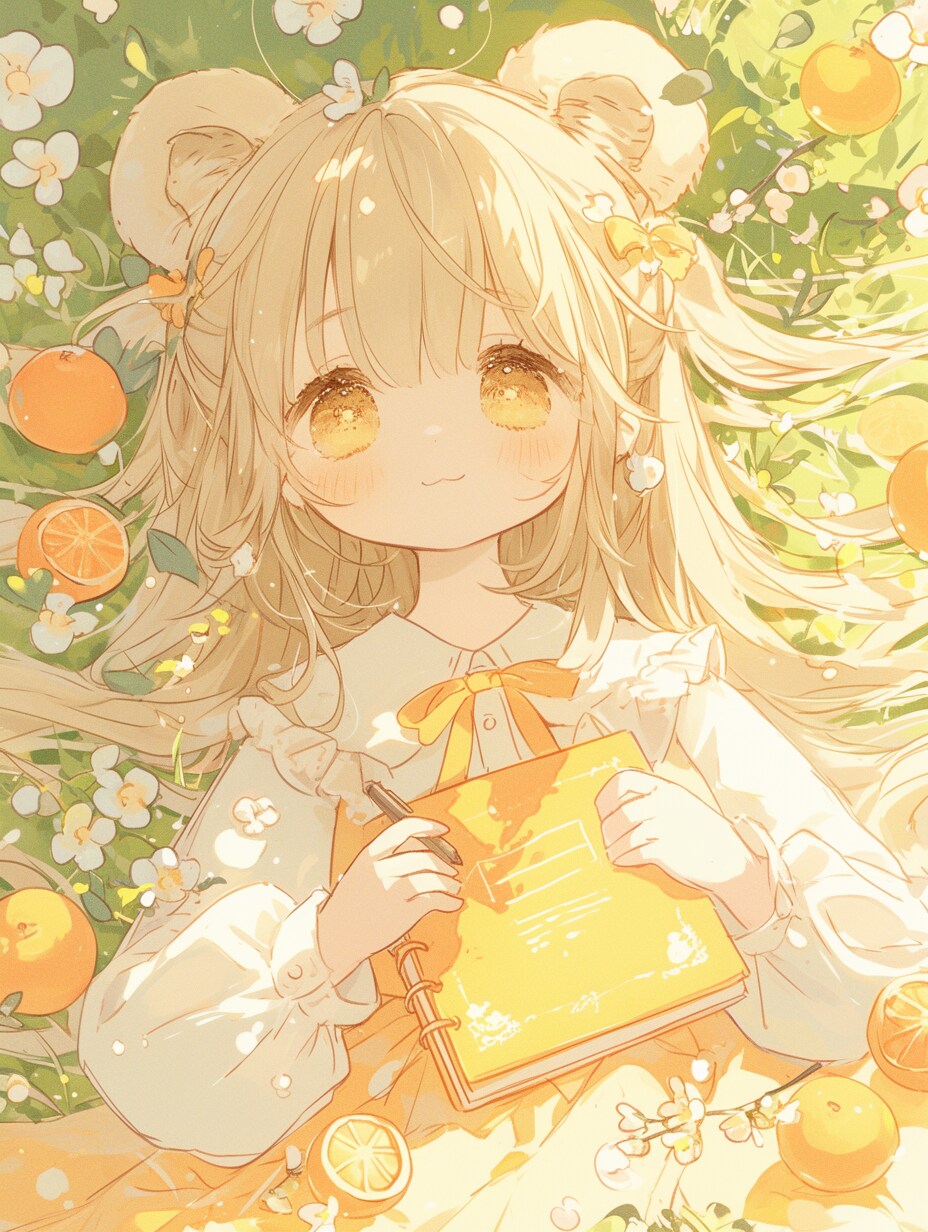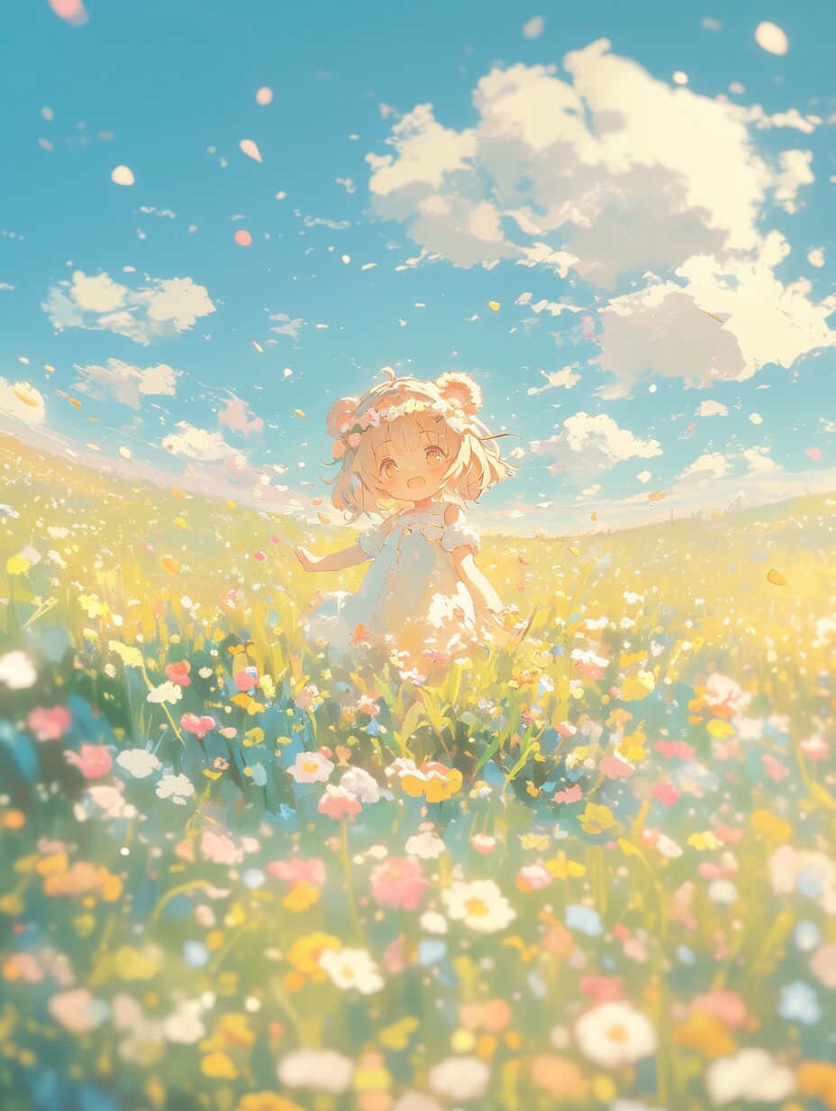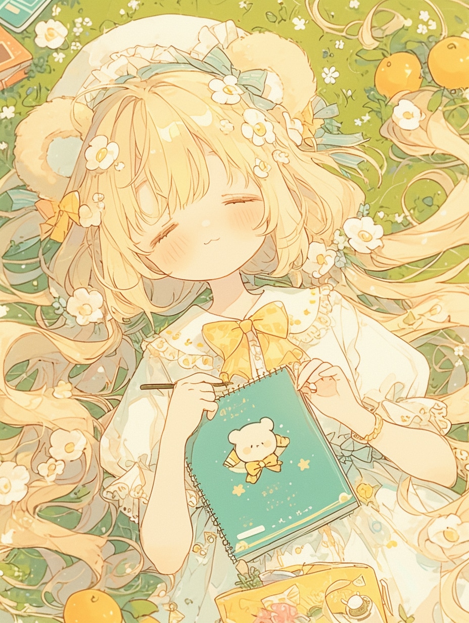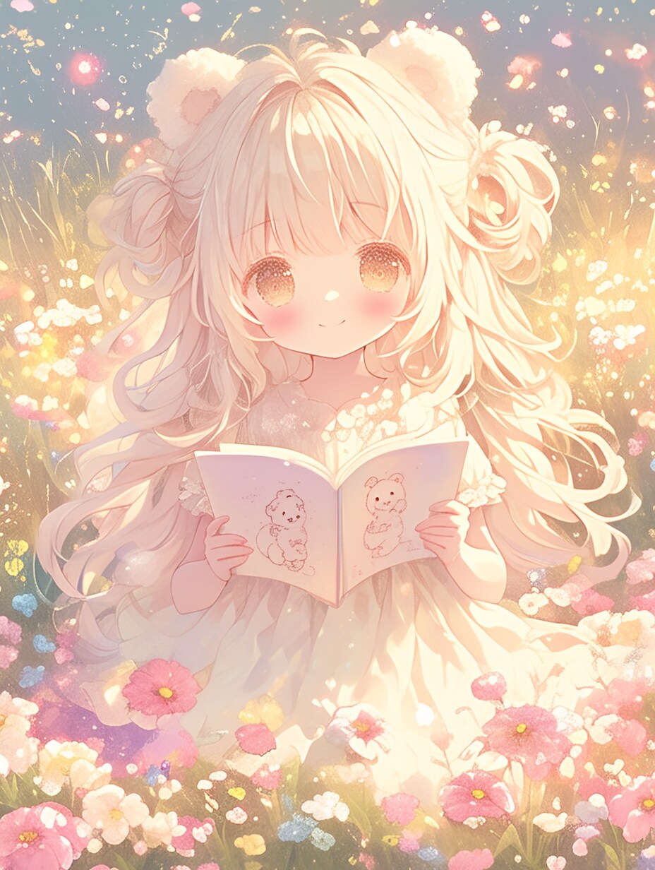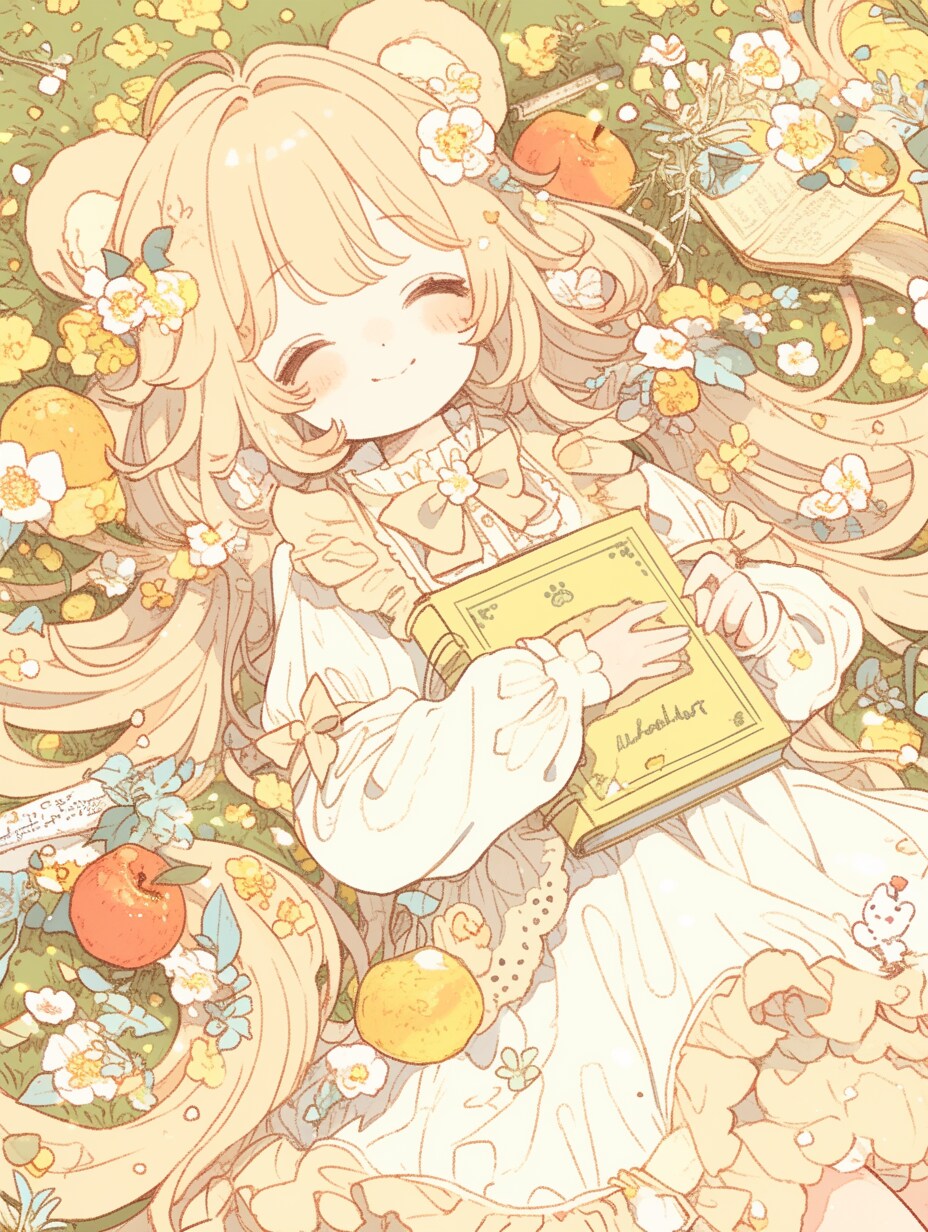 ふわふわのお花畑で、くま娘はすやすやお昼寝。