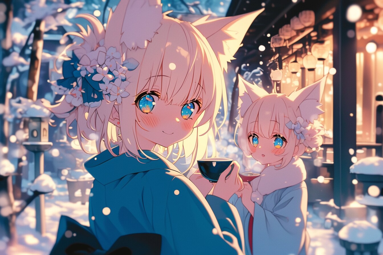 静かな冬の夜、神社の灯籠が雪の中で柔らかな光を放つ中、猫耳の姉妹が仲良く過ごしていた。姉の「ユリナ」は青い着物に身を包み、湯気の立つお茶を手に微笑みながら、妹の「ミナ」に視線を向けた。ミナも白い着物に包まれ、少し驚いた表情で姉を見上げている。