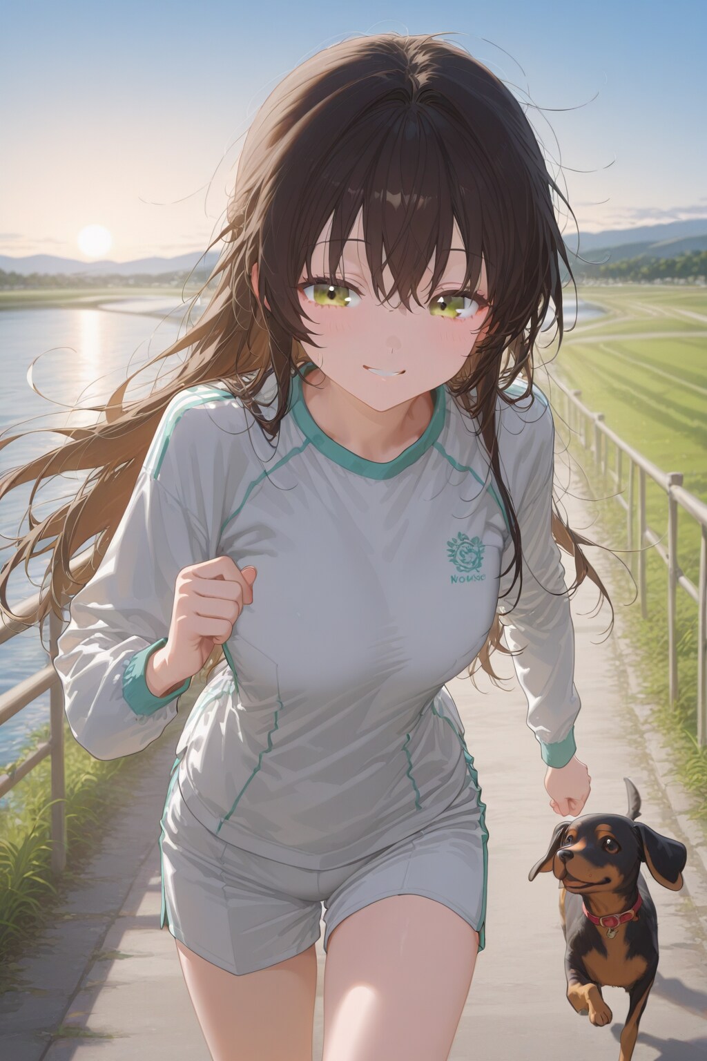 ね、見て! 私の相棒のわんちゃんも、しっぽを振って一生懸命走ってる! 一緒に走ると、全然疲れを感じないんだ。さあ、次はあの橋まで競争だよ! 今日も一日、元気いっぱい頑張れそう!