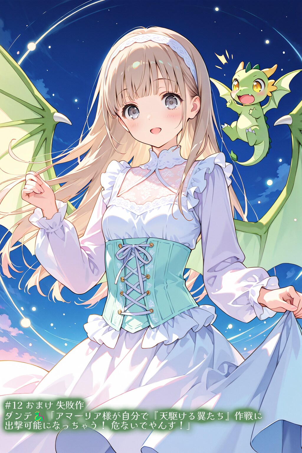 ダンテ🐉「段取りは決まってるでやんす。まずあっしが今日は魔力を解放して、いつもより大きい姿に変身、交戦領域まで一気に飛行。アマーリア様からもらった宝石の魔力は順調でやんす。そしたら友軍機を見つけて、祝福のブレスを吐いて幸運をもたらす魔法をかけて回って援護するでやんす。直接交戦はなるべく避けますから、大丈夫でやんすよ」