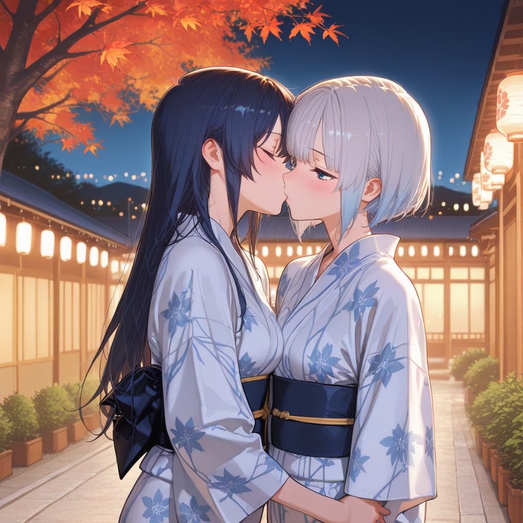 青髪ボブ子ちゃんと銀髪の彼女が寄り添いながら、夜風に包まれて静かにキス。