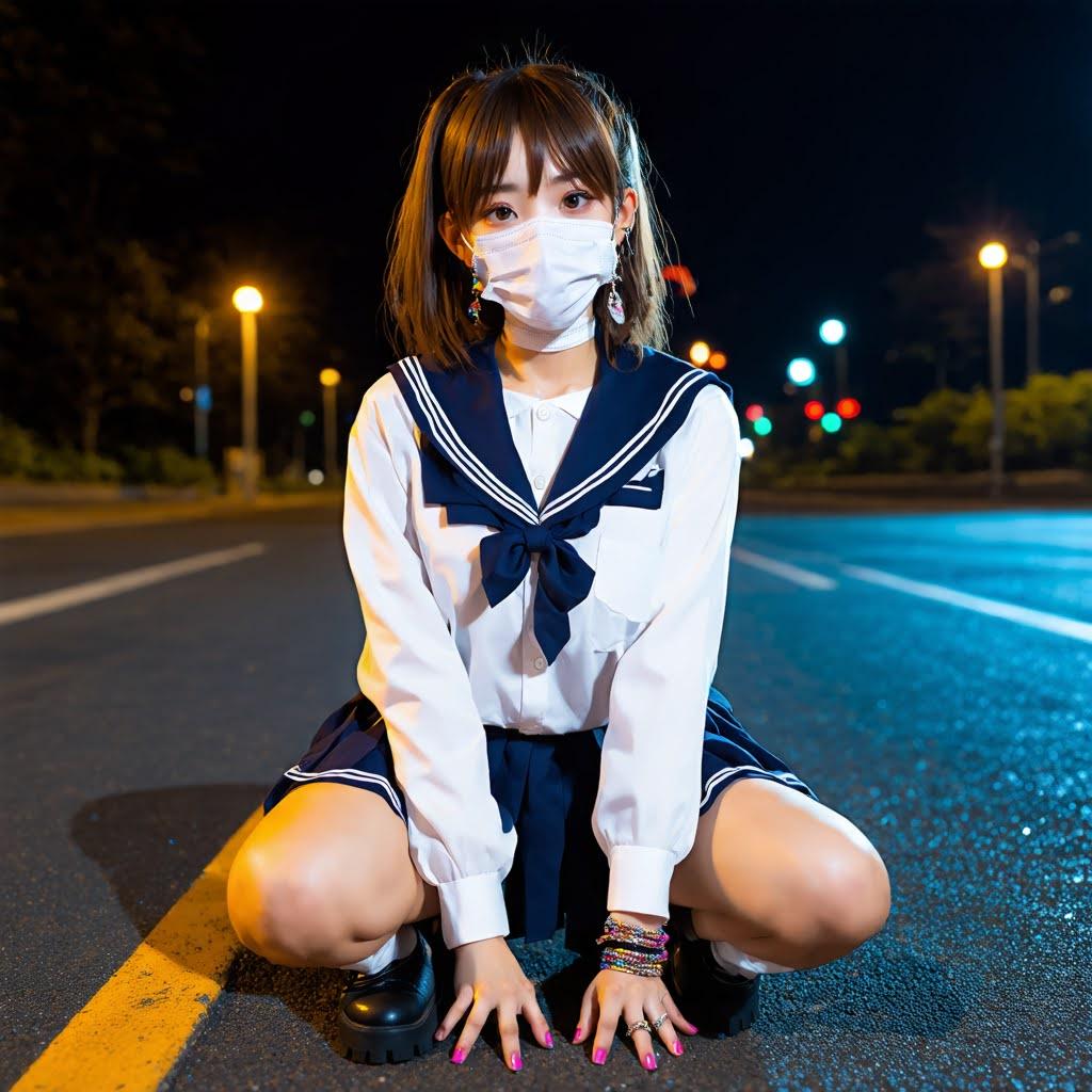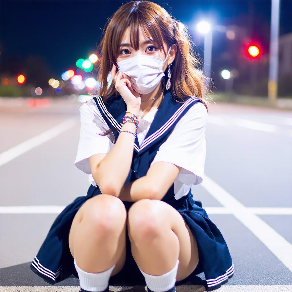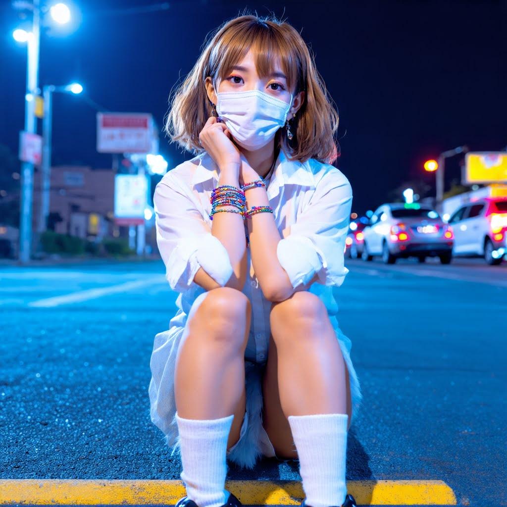 夜の繁華街から少し離れた駐車場の縁石に腰掛け、マスク越しに静かに話を聞く彼女。