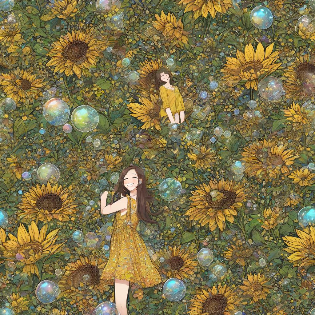 ひまわり畑を見つめる娘達、ひまわり畑に