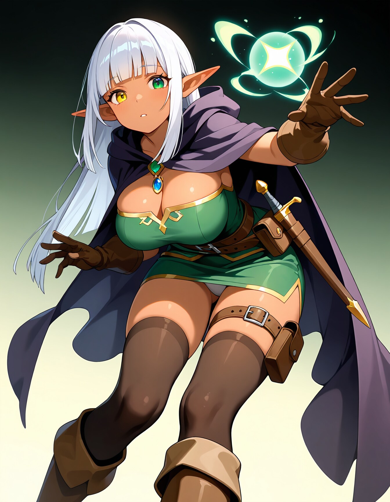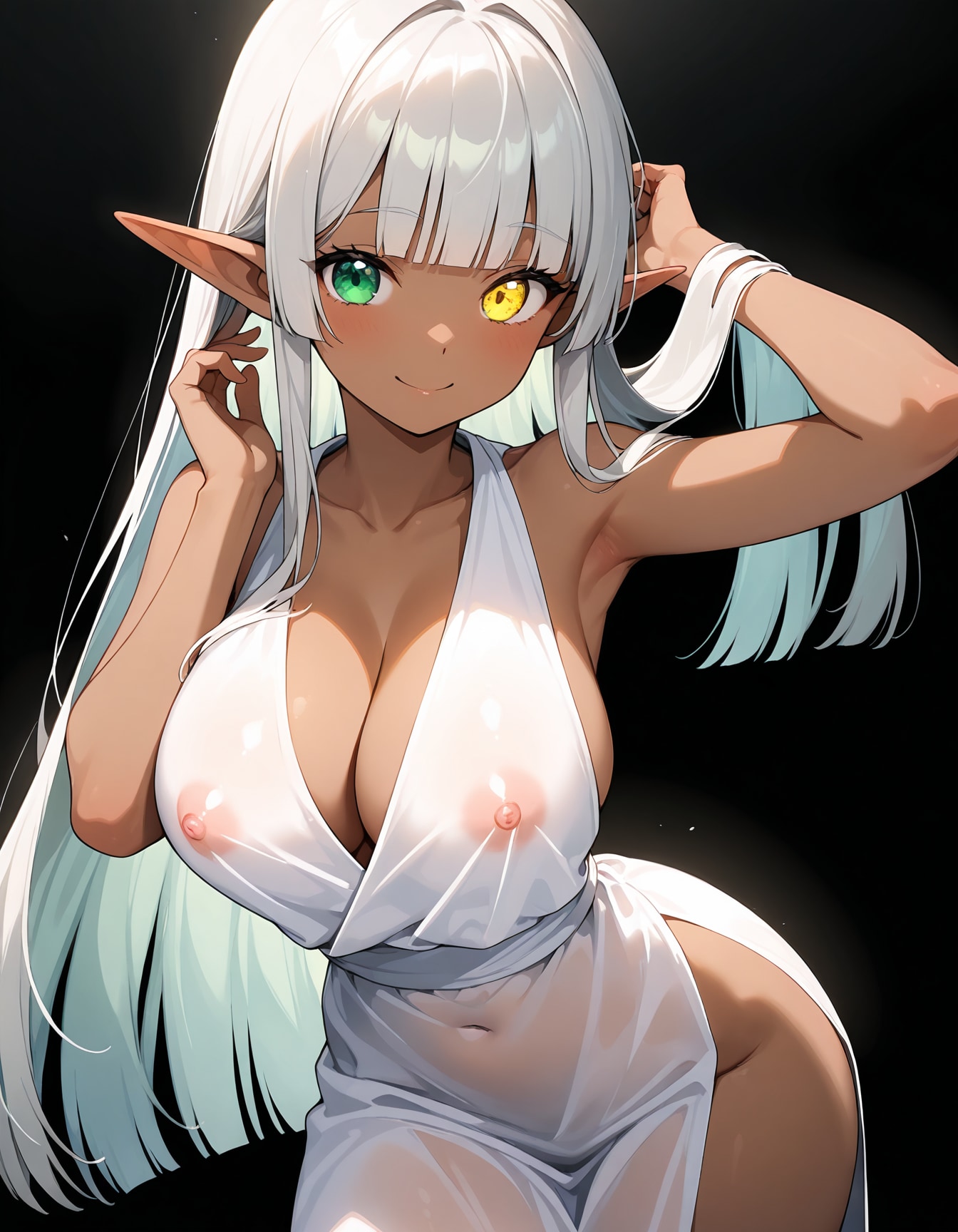 特徴: ダークエルフ、銀髪、褐色、オッドアイ(緑・黄)、巨乳