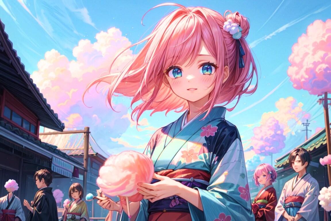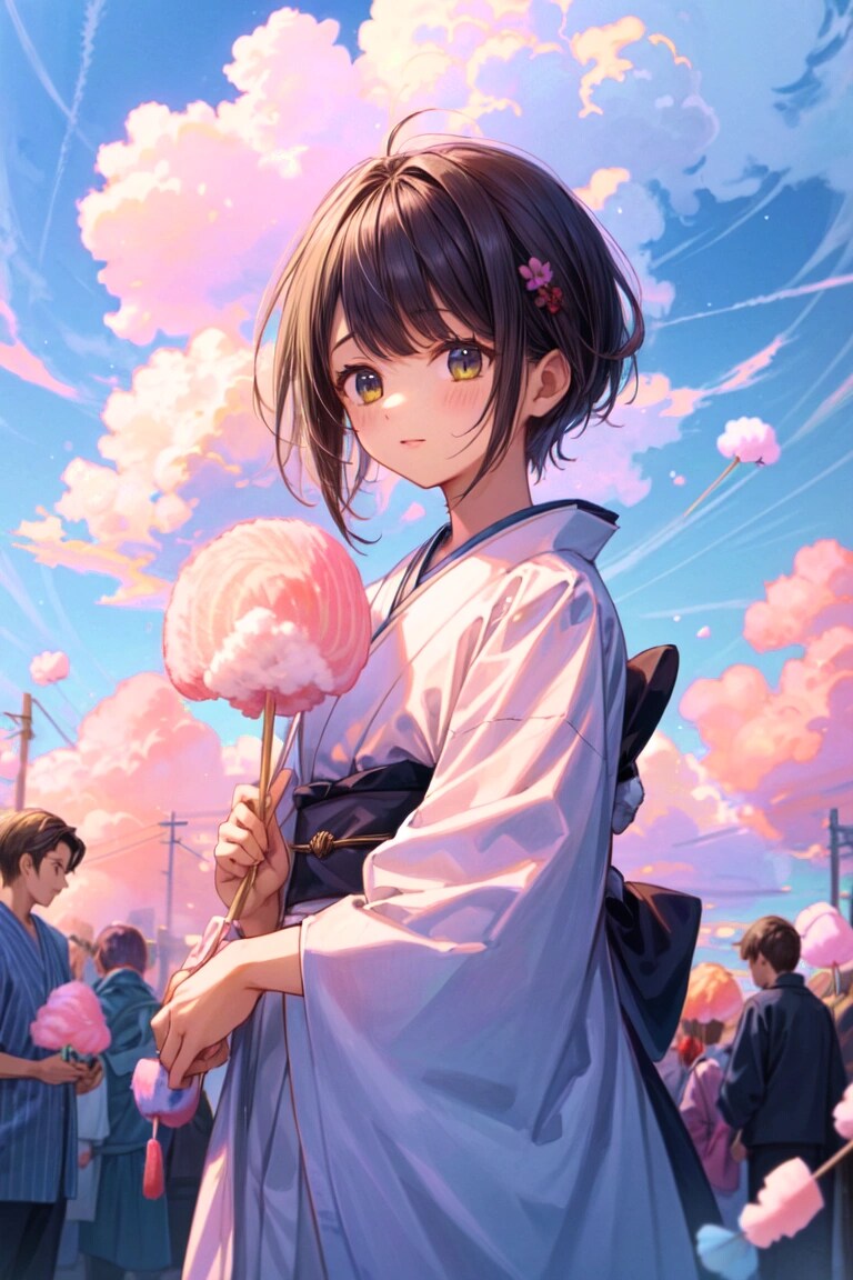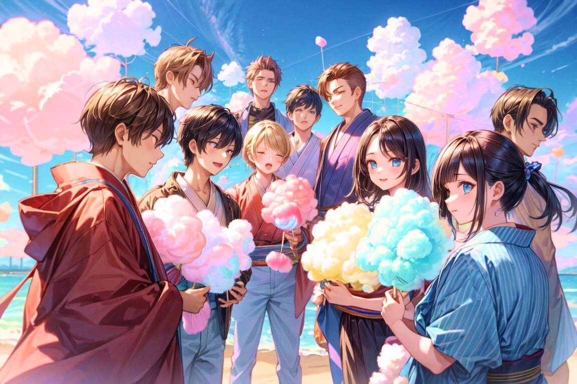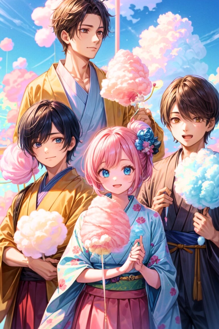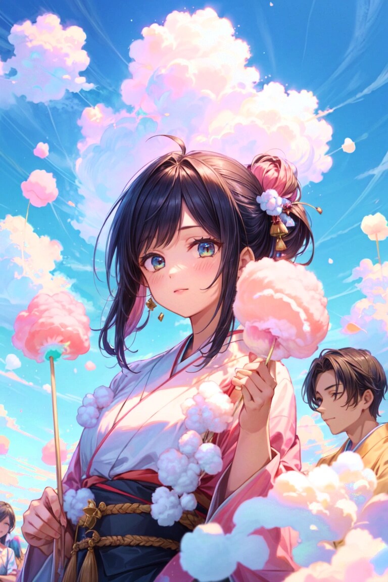 結果、 こちらでもわたあめと雲が混ざった感じが表現できて良かったです!!あとみんなで楽しそうにしている様子が生き生きと描かれていていい感じです。今回のお題はプロンプトを短くしたほうが、いい感じのイラストが出るかもしれません。あとピンクの色合いが予想以上に強めに出て、面白く感じました。