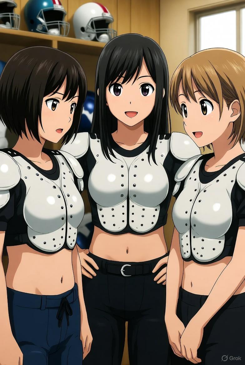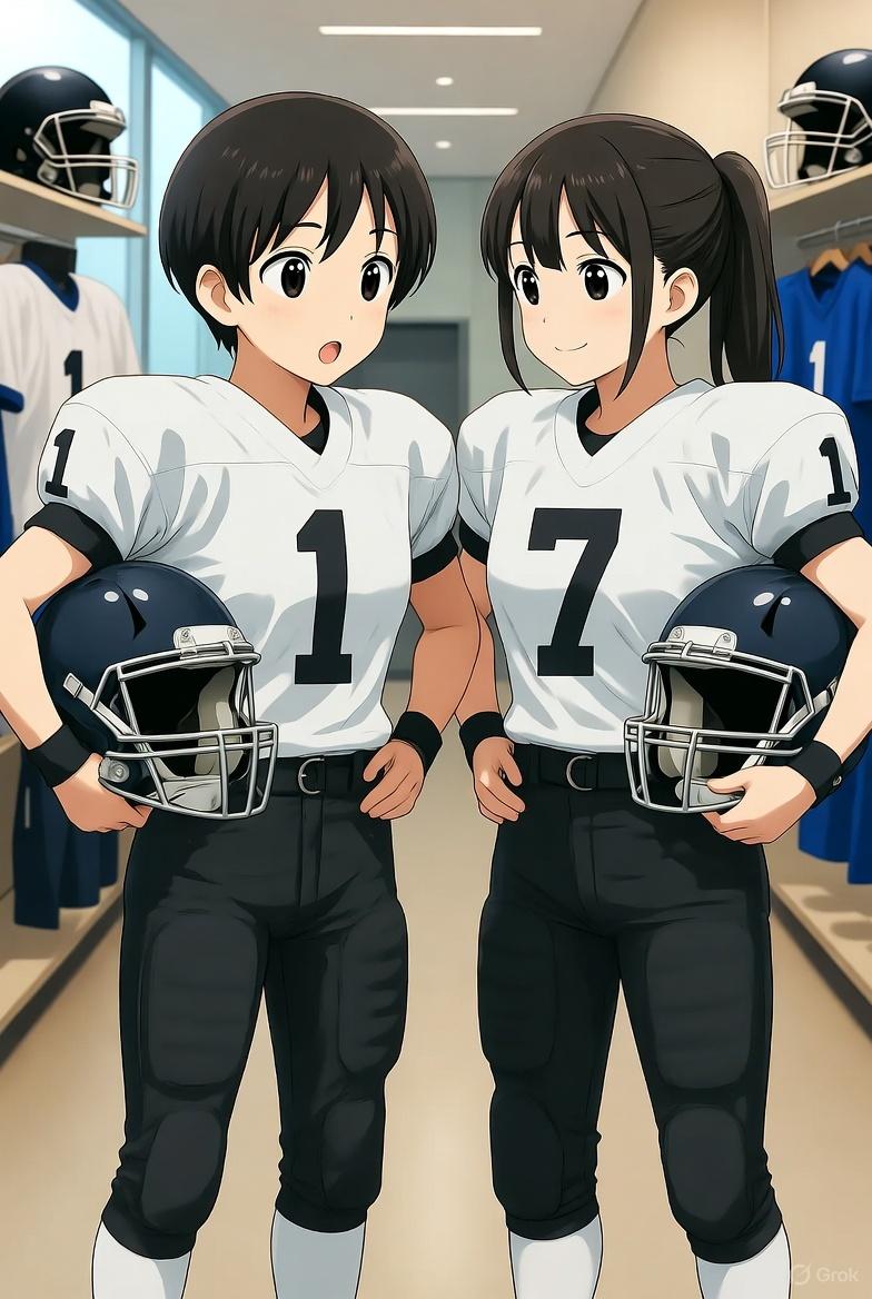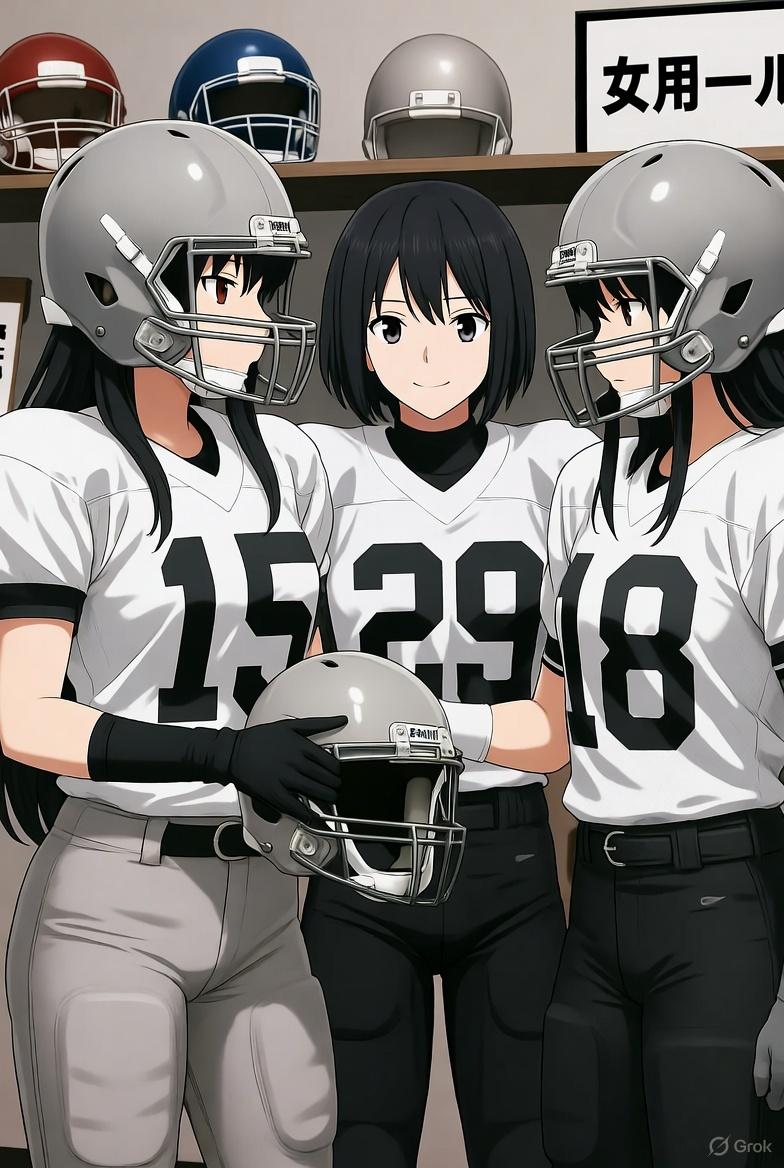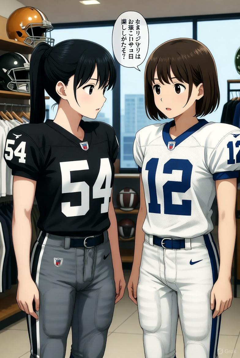 今回はアメフト用品店でユニフォームやショルダーパッドの試着の様子をイラスト生成してみました。