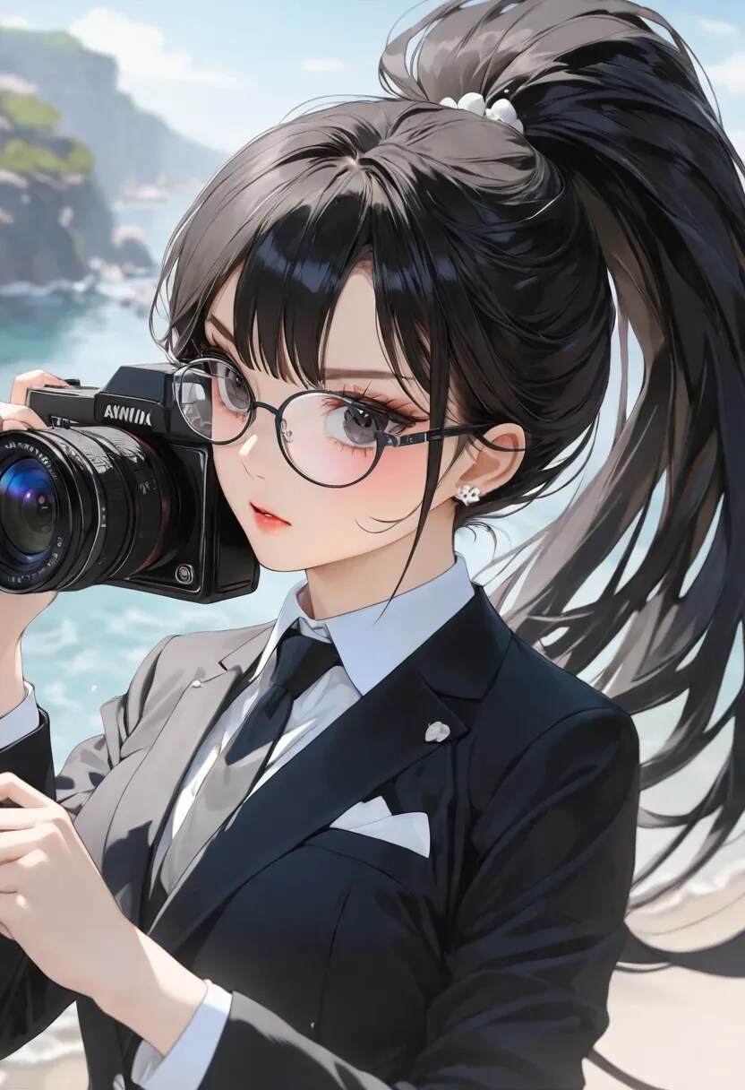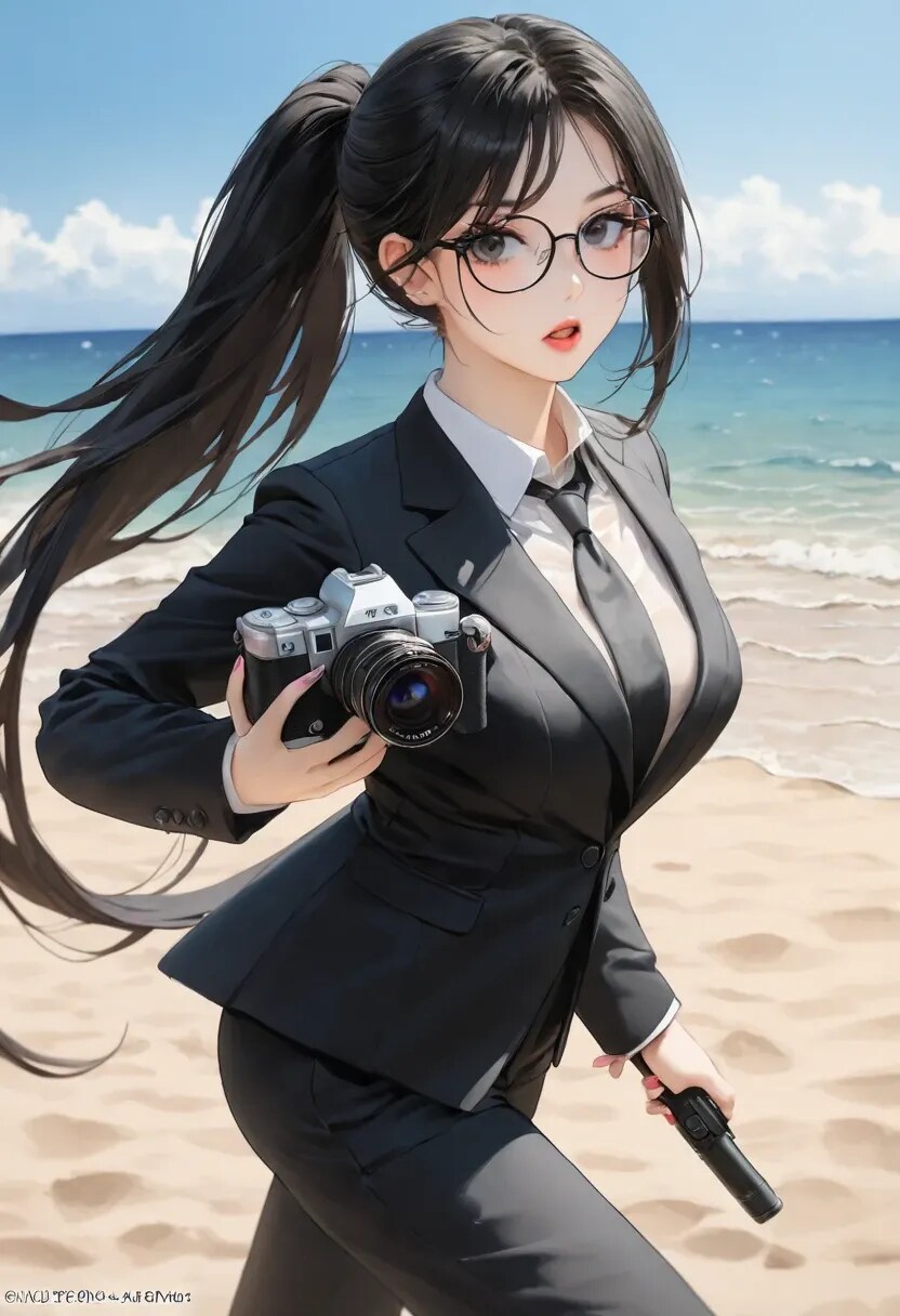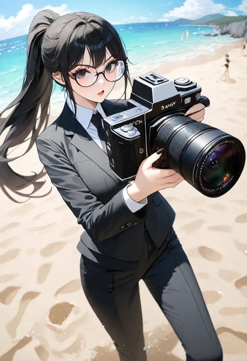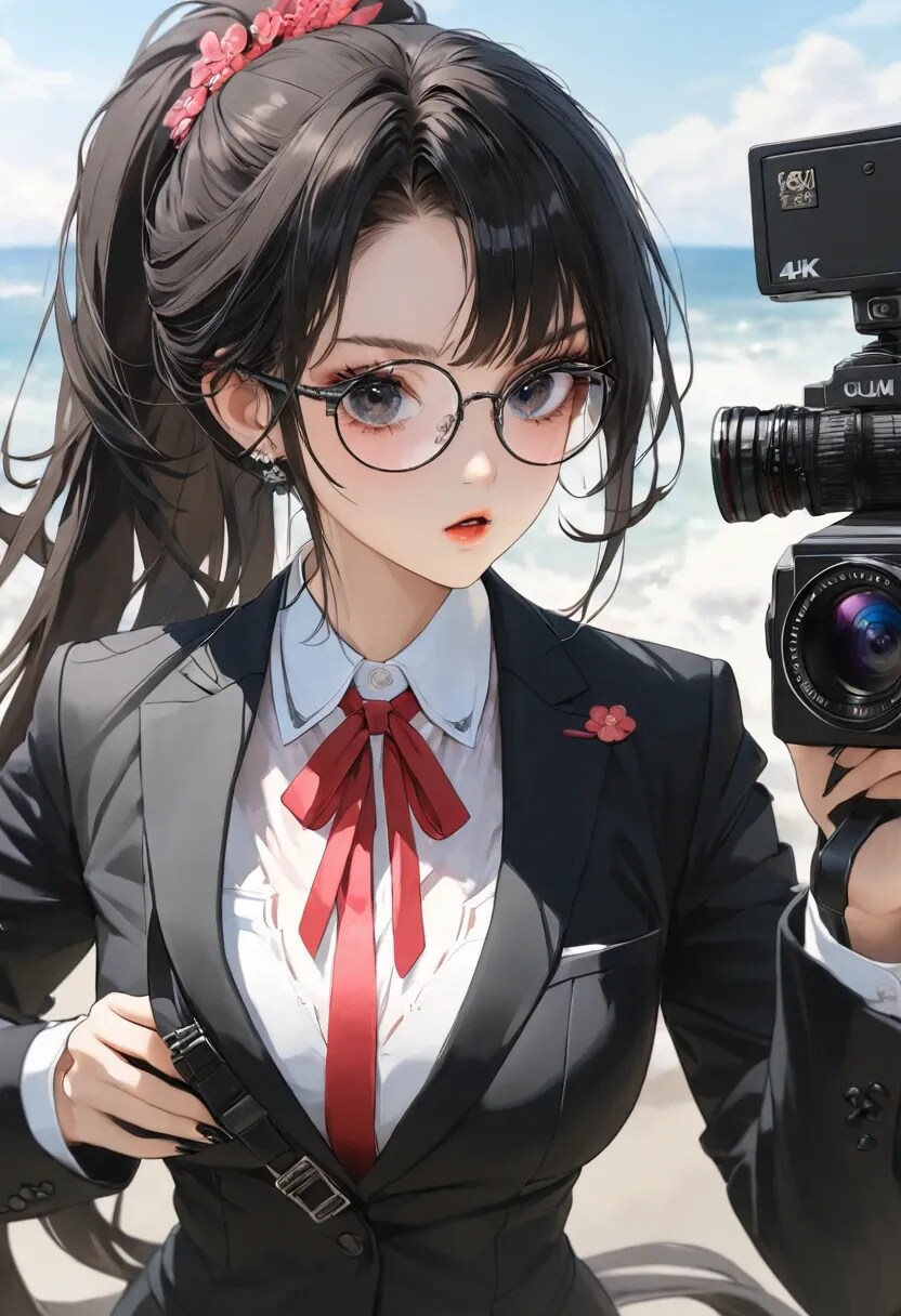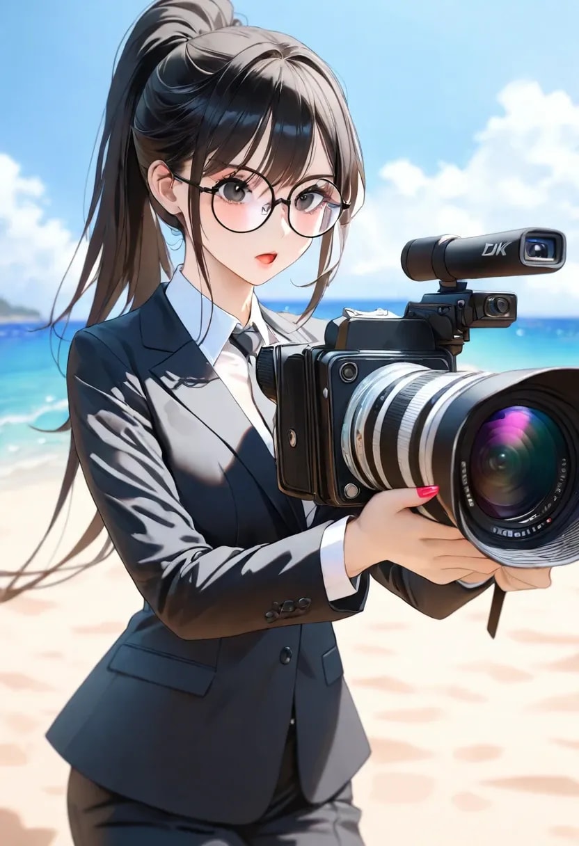 夏の炎天下の中ゴツいカメラを構えたスーツの女性のポスターがいっぱい貼られています…