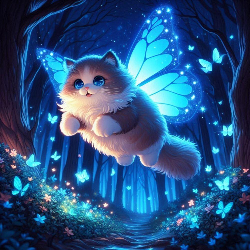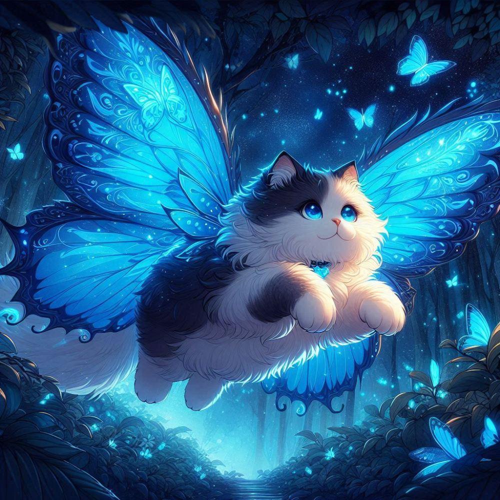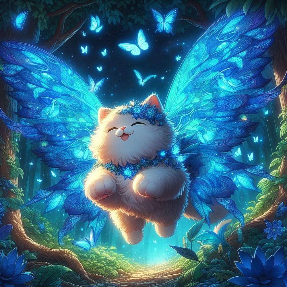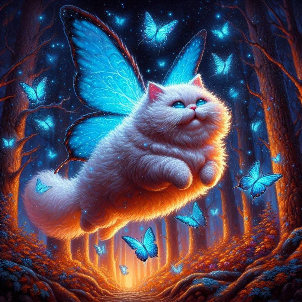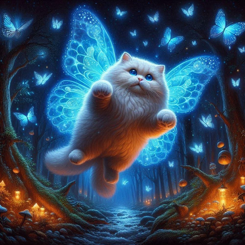 アニメ油絵風、蝶の羽で飛ぶ猫