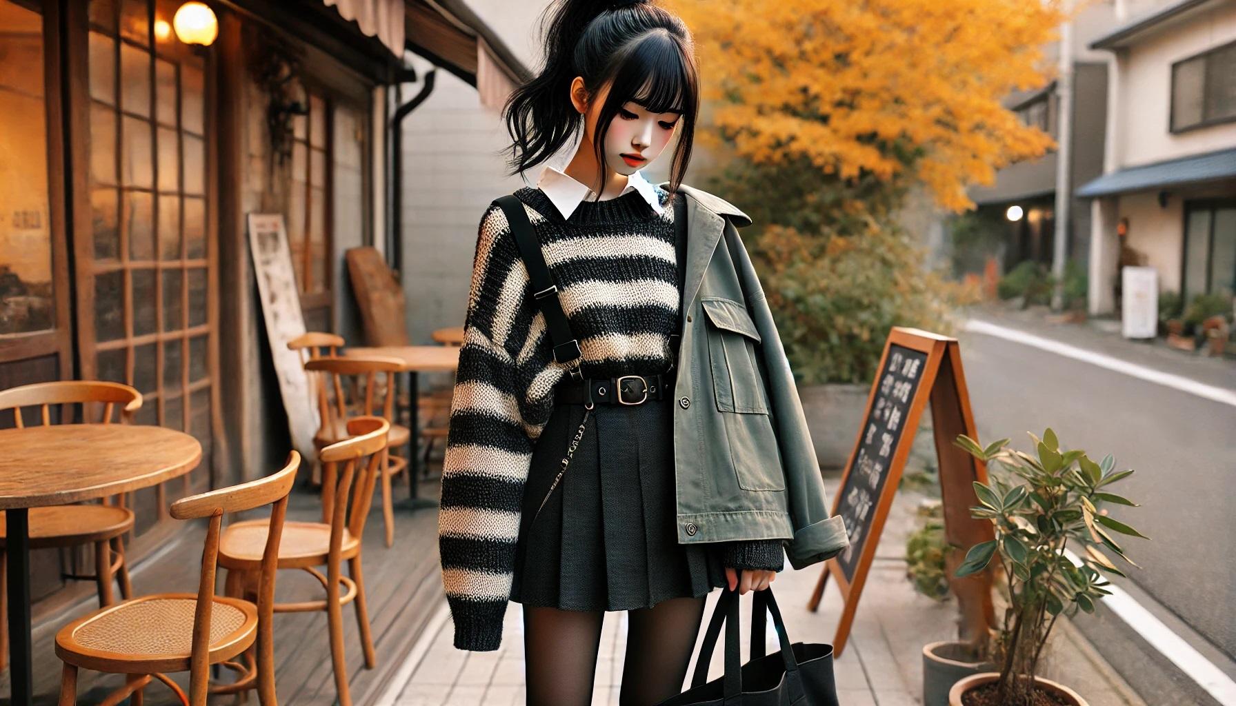 休日に友達とショッピングや映画鑑賞に出かける際にぴったり。ボーダー柄がカジュアルで親しみやすい印象を与える、リラックスした秋のお出かけスタイルです。