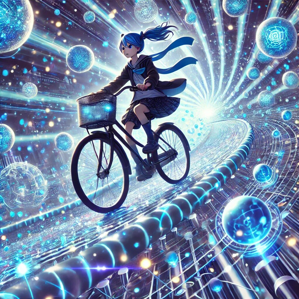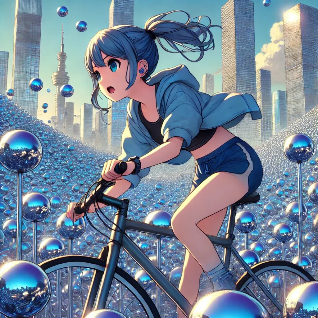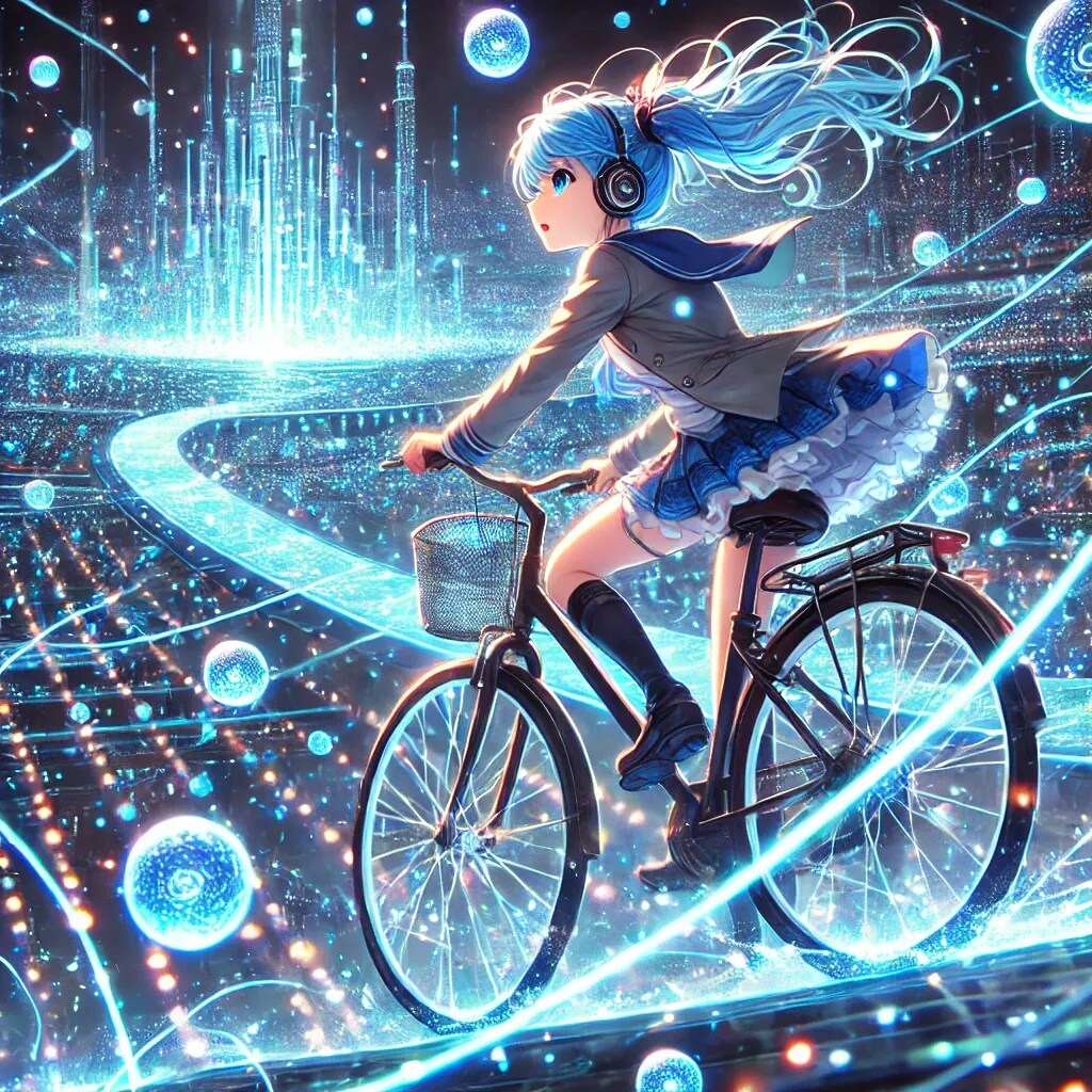未来的で不思議な世界観の中でも、少女の元気なエネルギーが光っていて、とても冒険心あふれるイメージですね。✨🚴♀️🌐