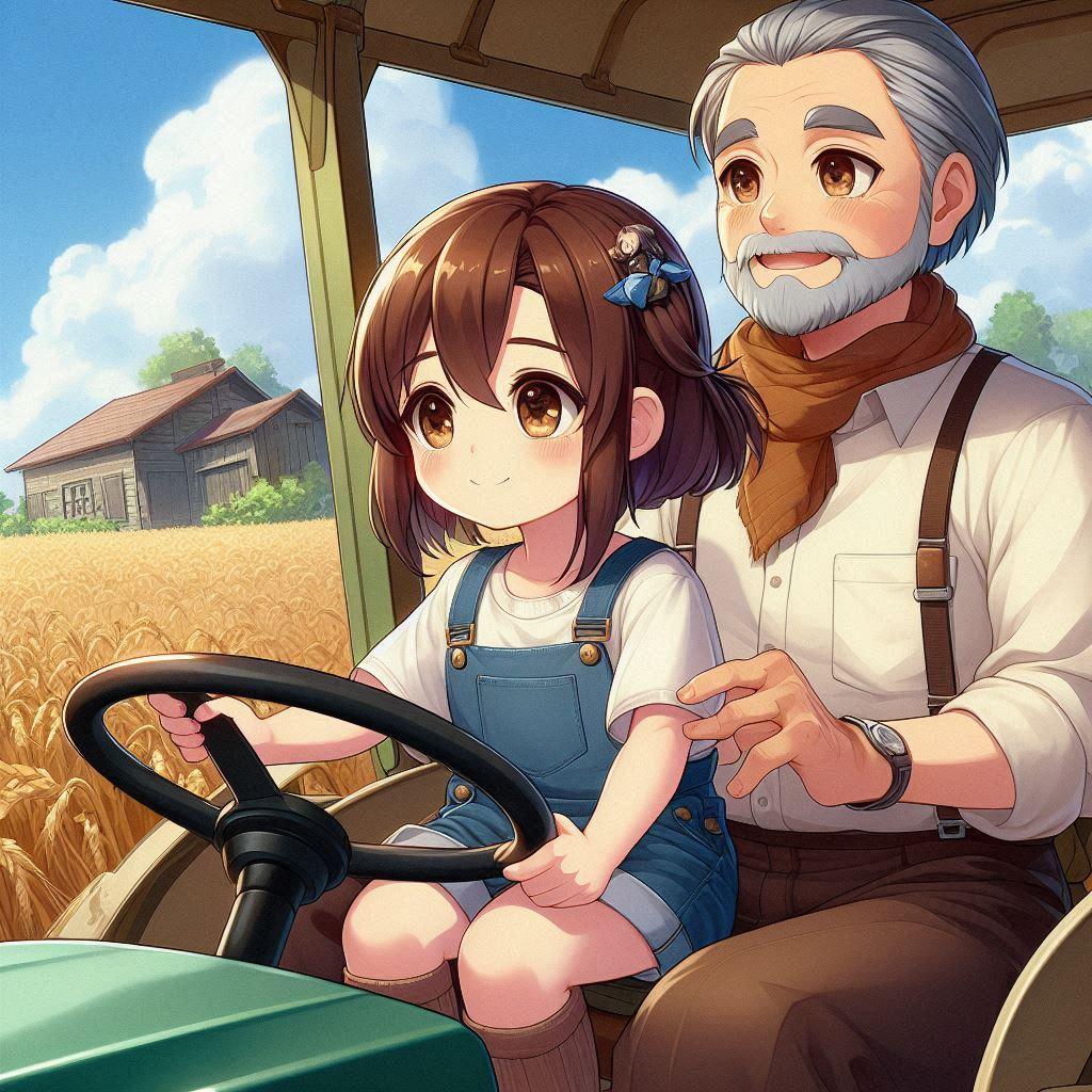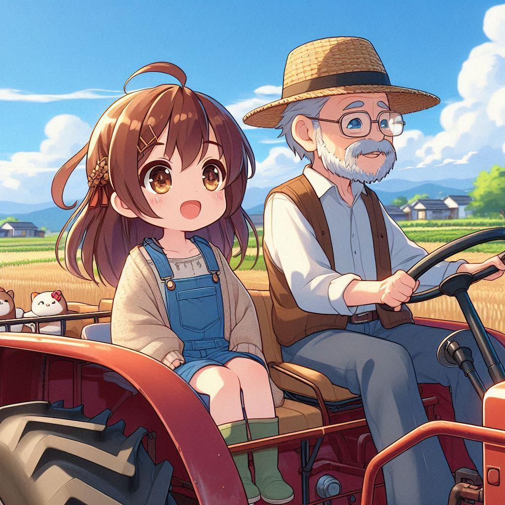 遠くから眺めていたら、おじいちゃんがトラクターに乗せてくれたの。
