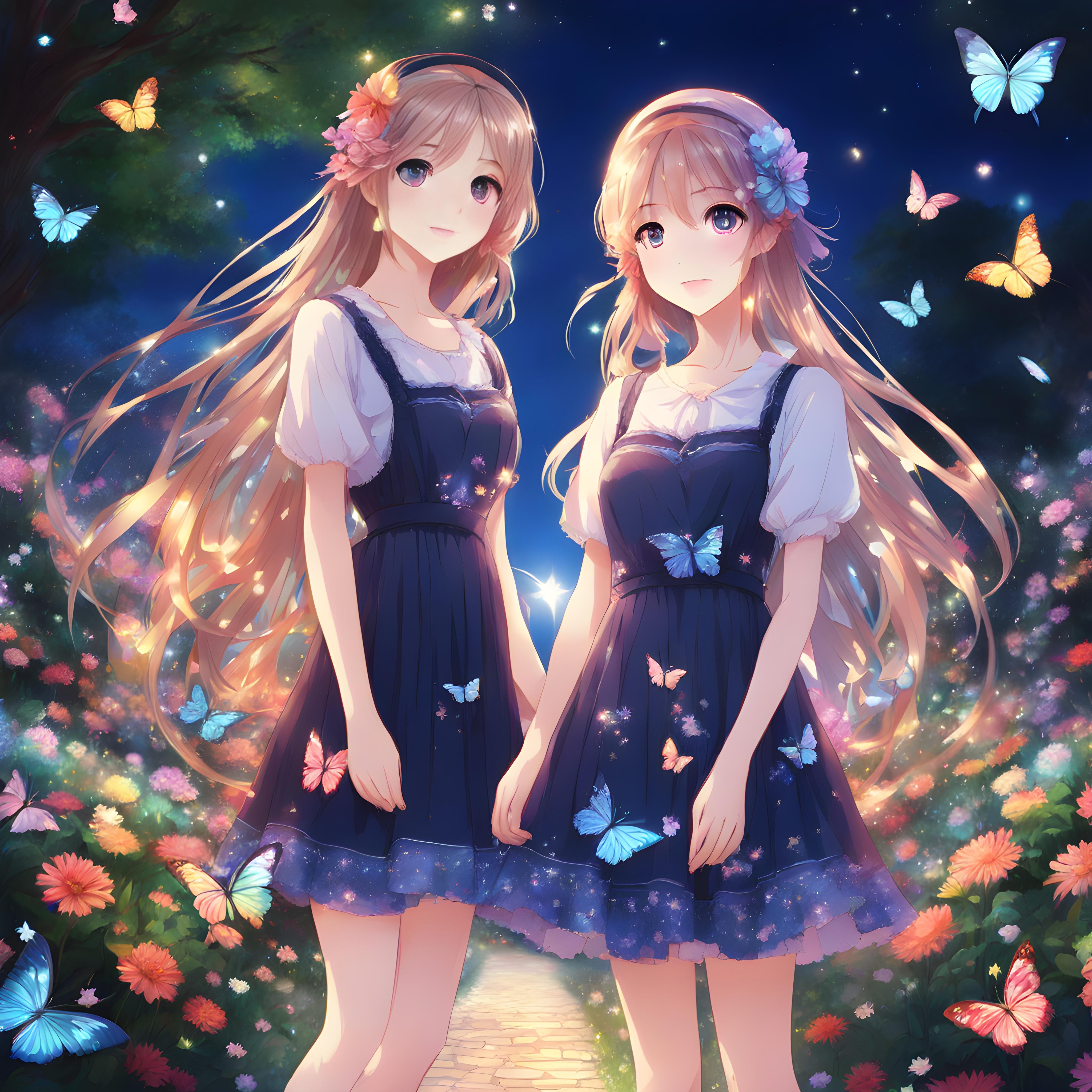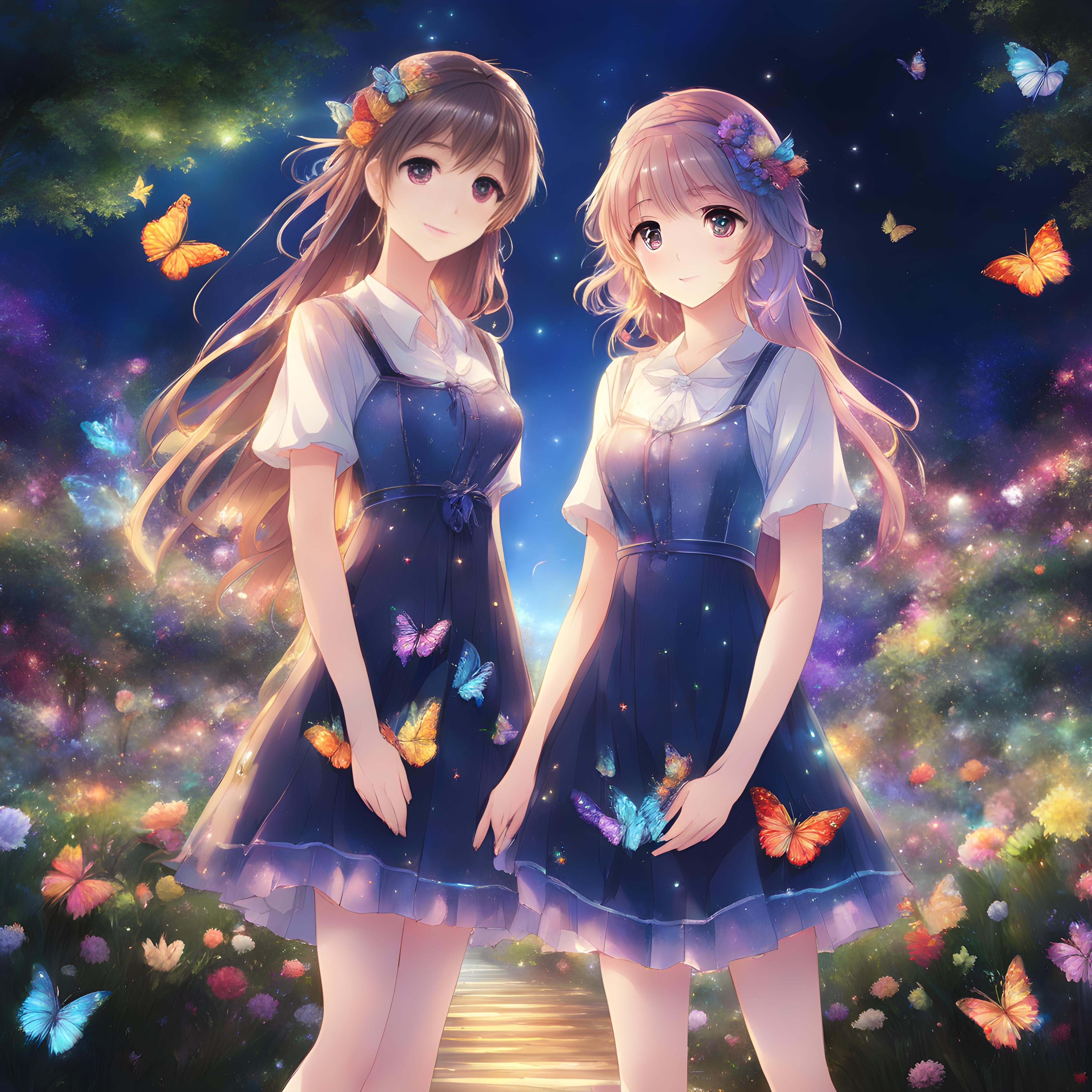 女の子2:春色の星空の下で花に囲まれながら七色に輝く蝶のドレスを身にまとう。