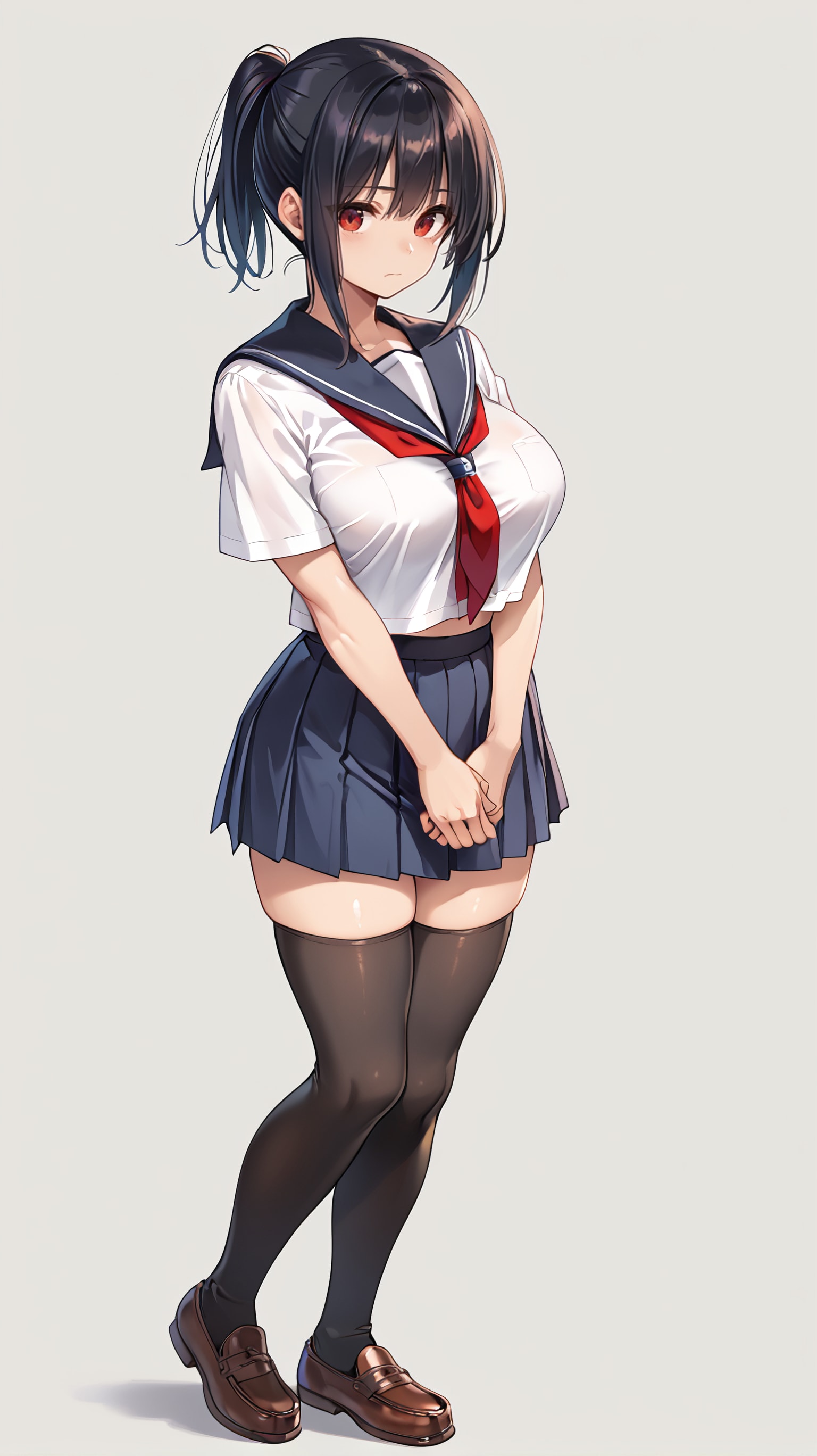 髪:現代日本設定なので黒髪。貞淑さとかお堅さを表現しています。また、ショートポニテは活発さ・男勝り・無垢辺りを籠めています。