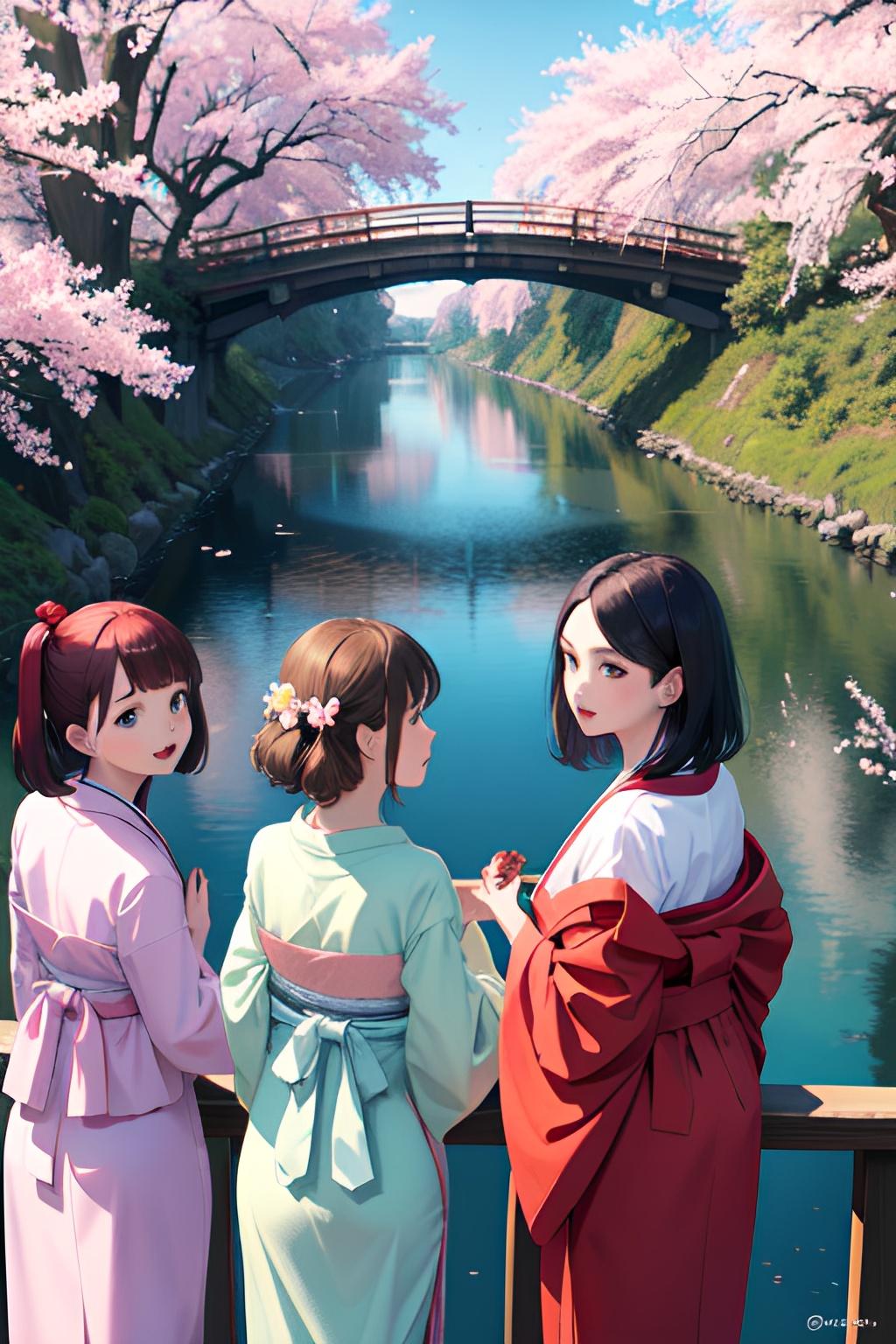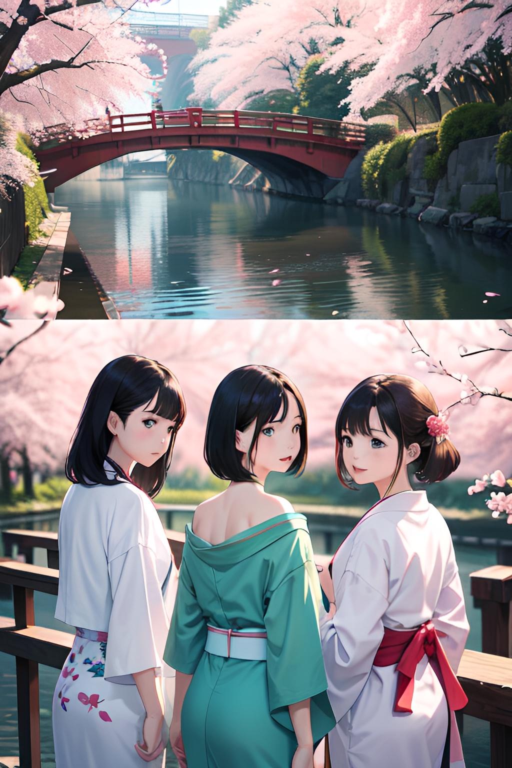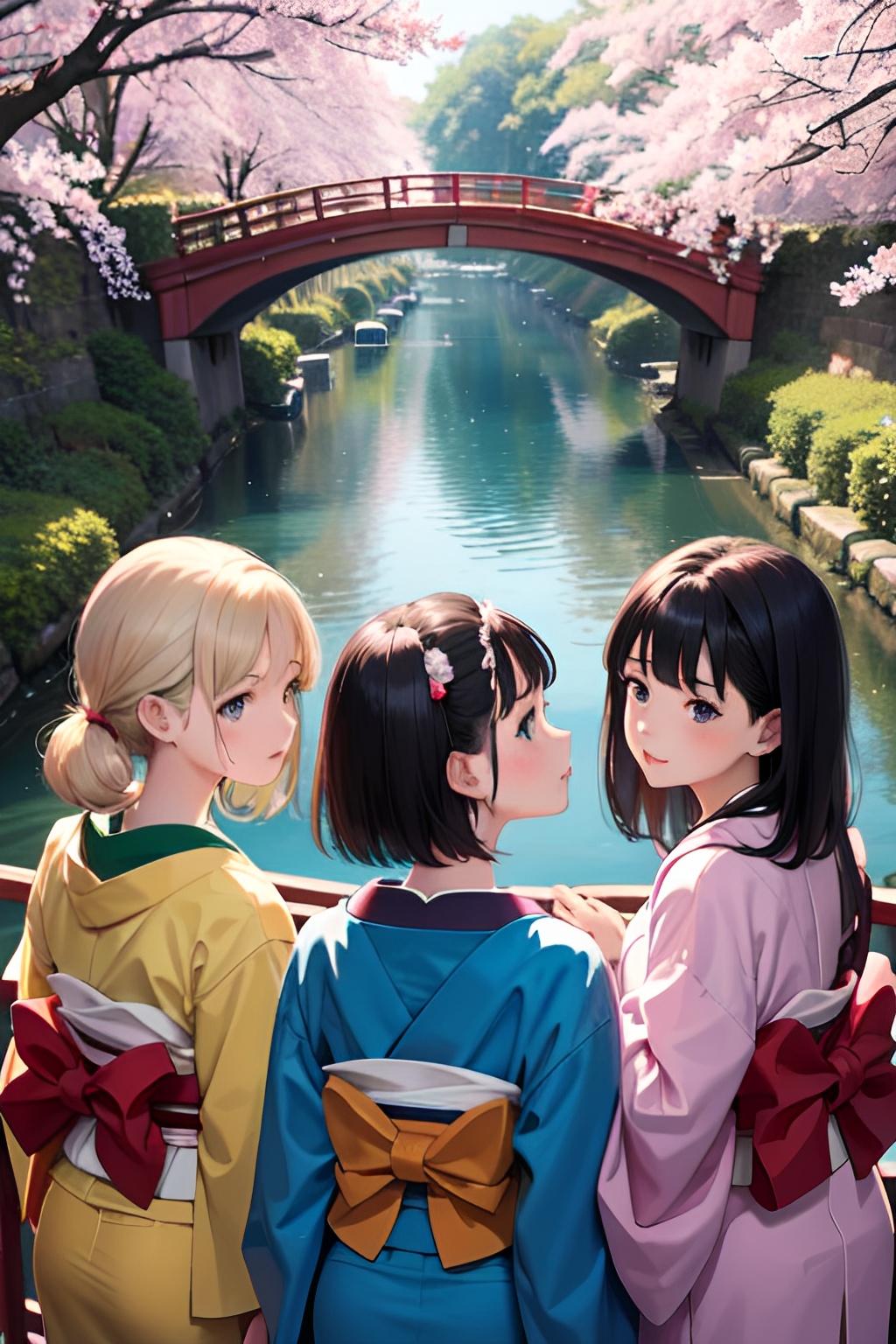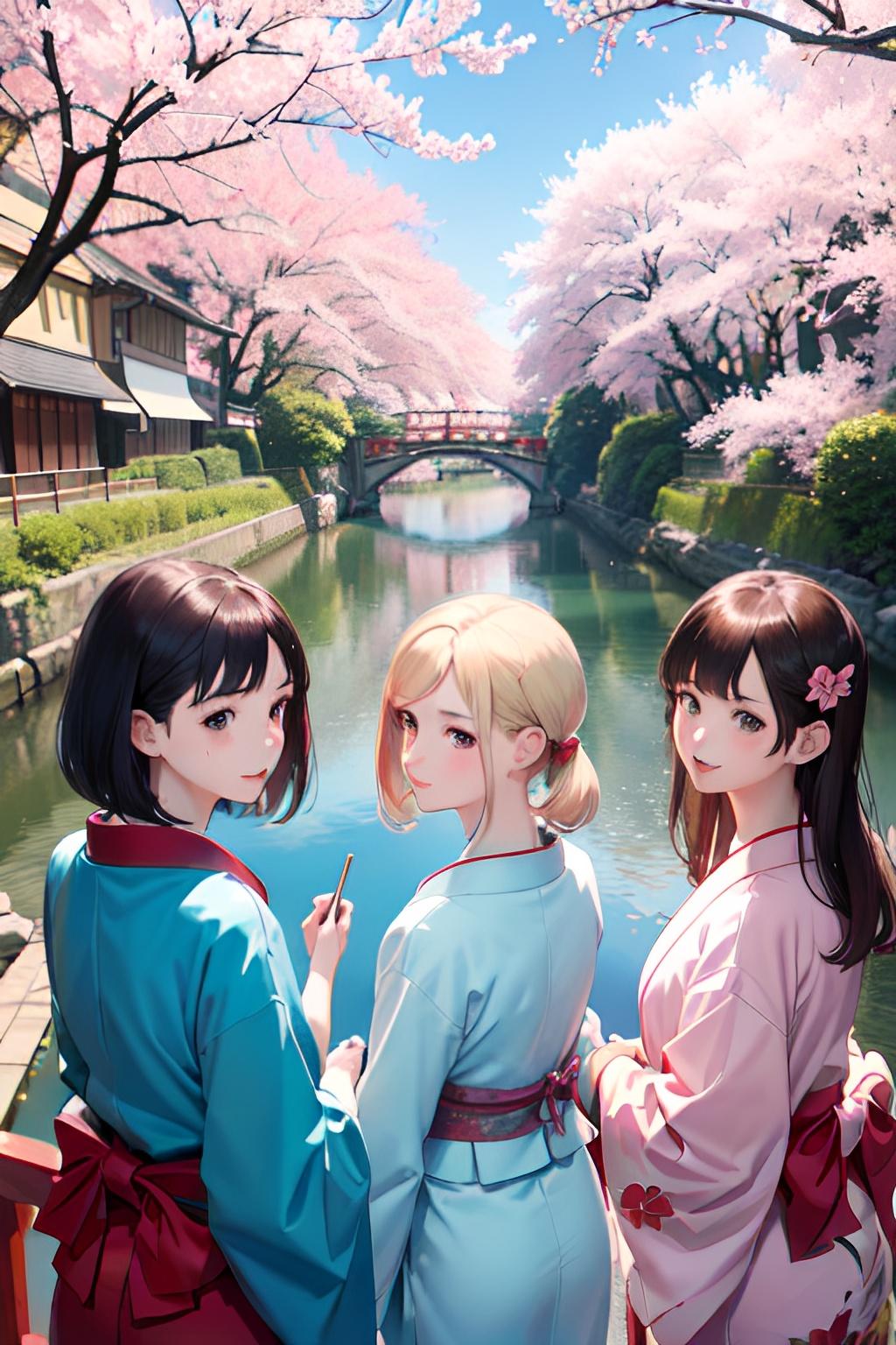 着物三つ子が目黒川でお花見
