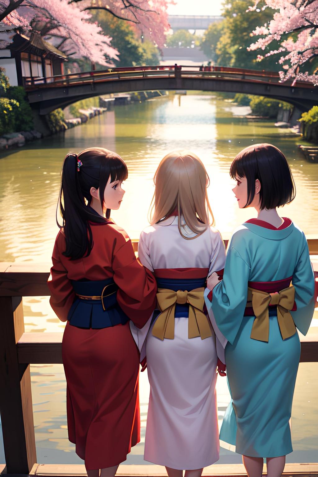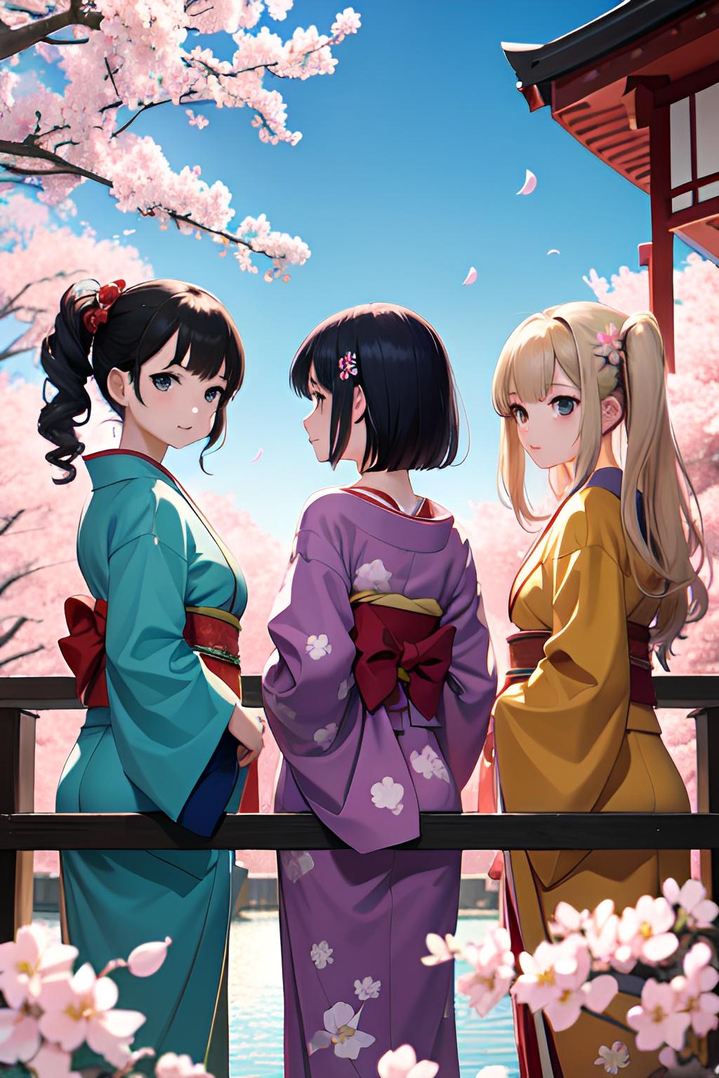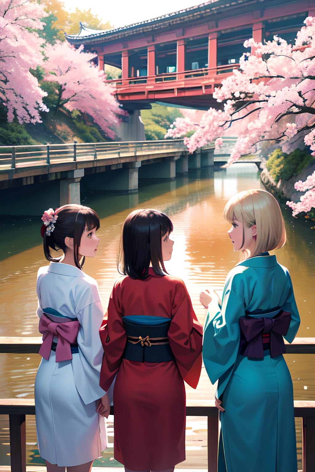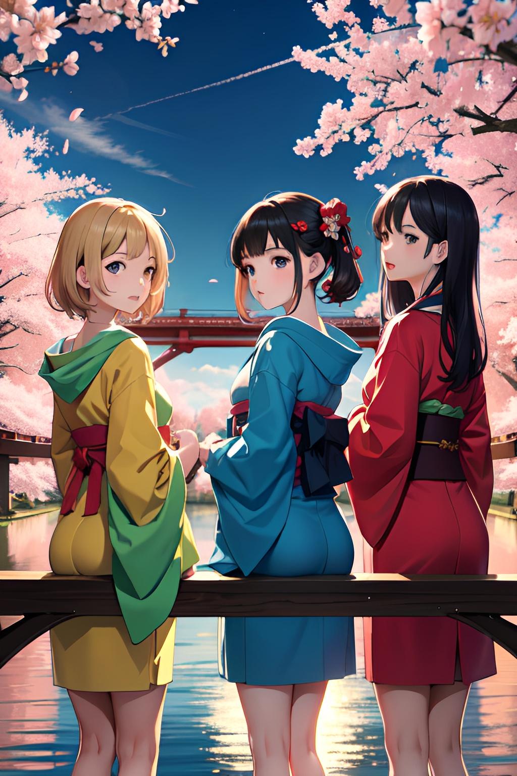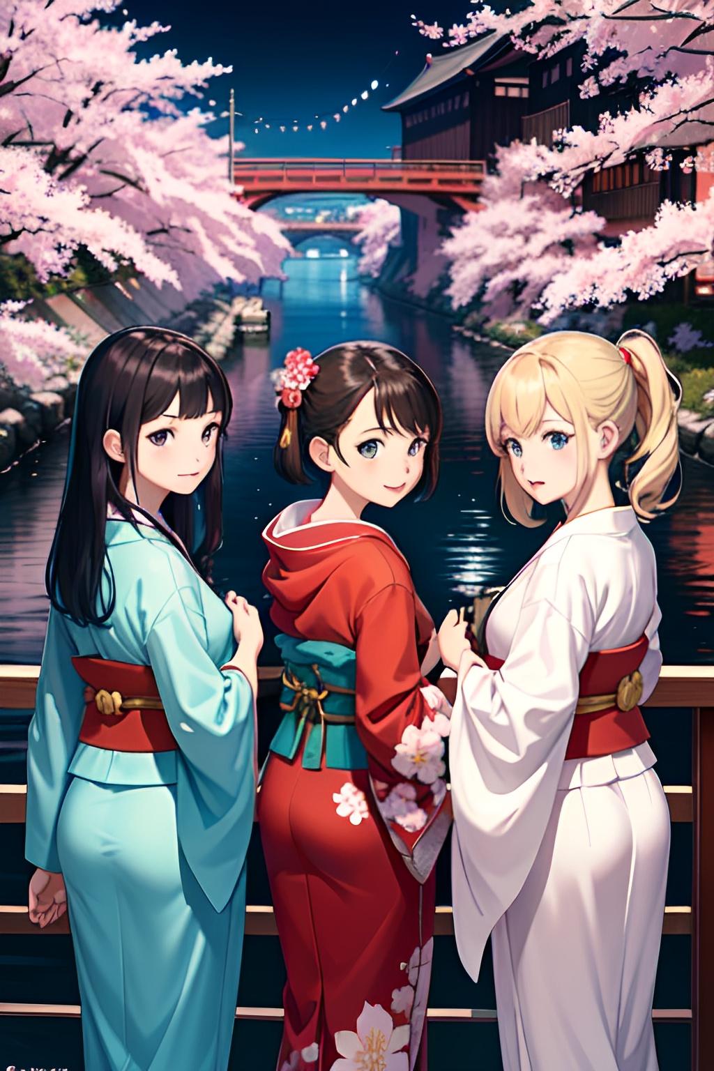 着物三つ子が目黒川でお花見