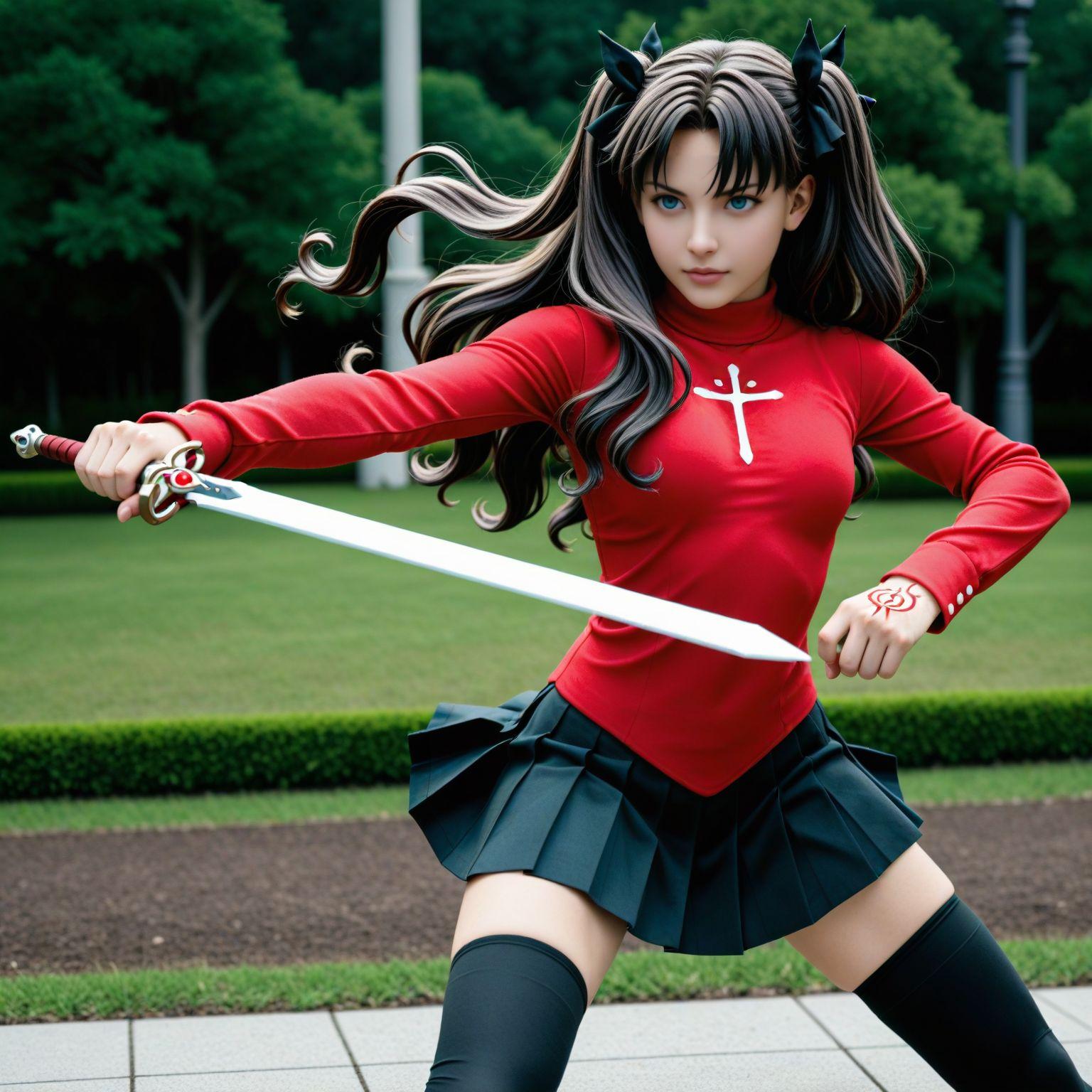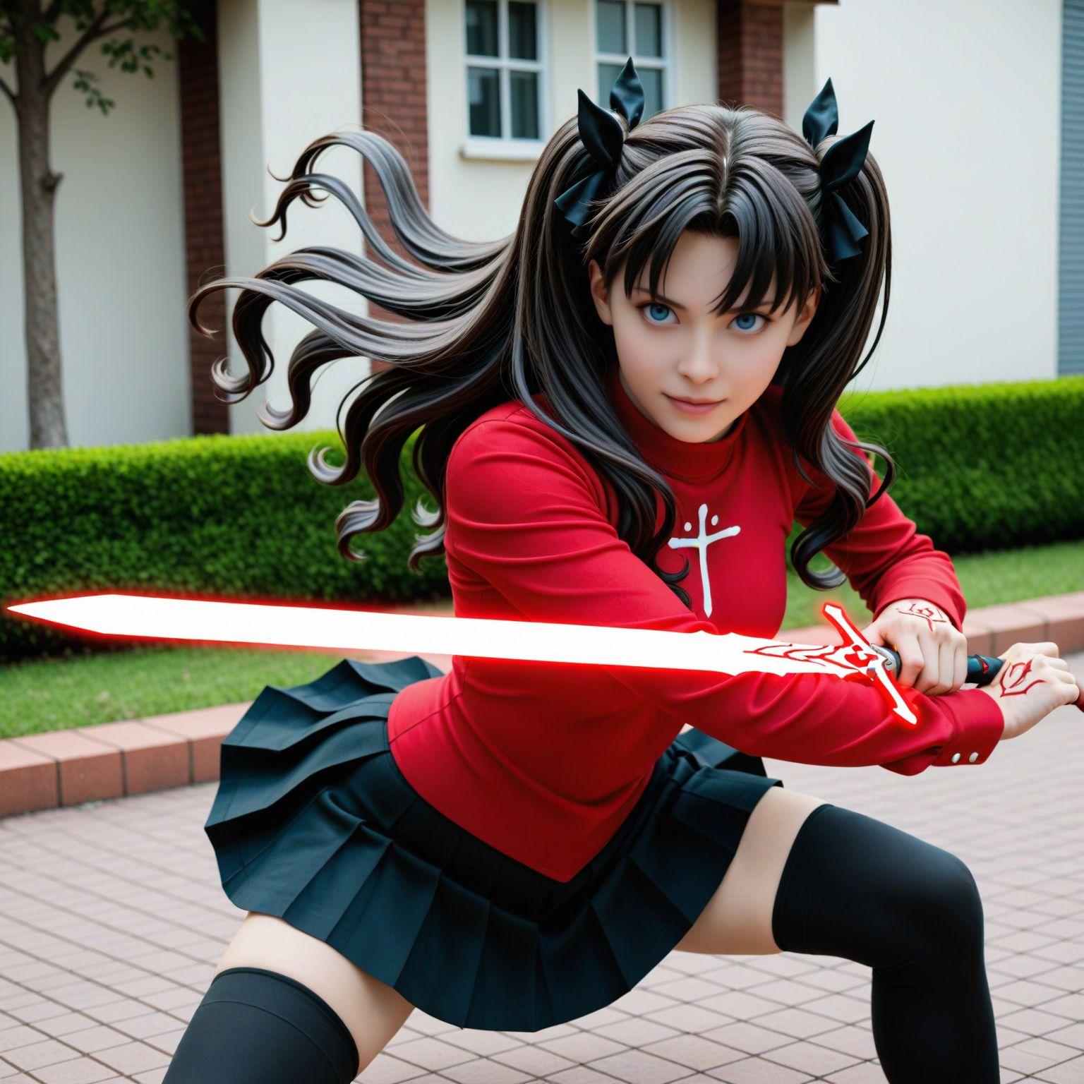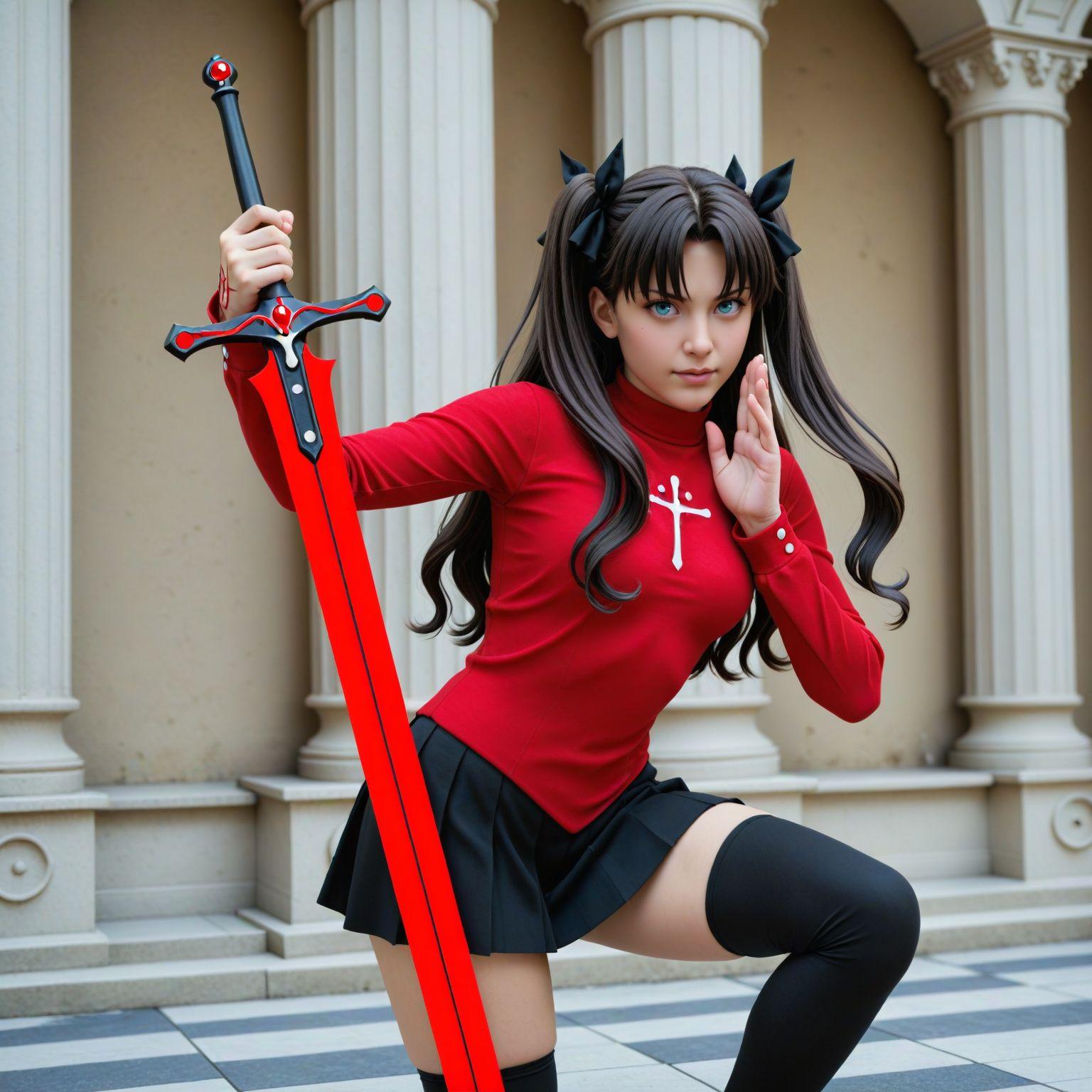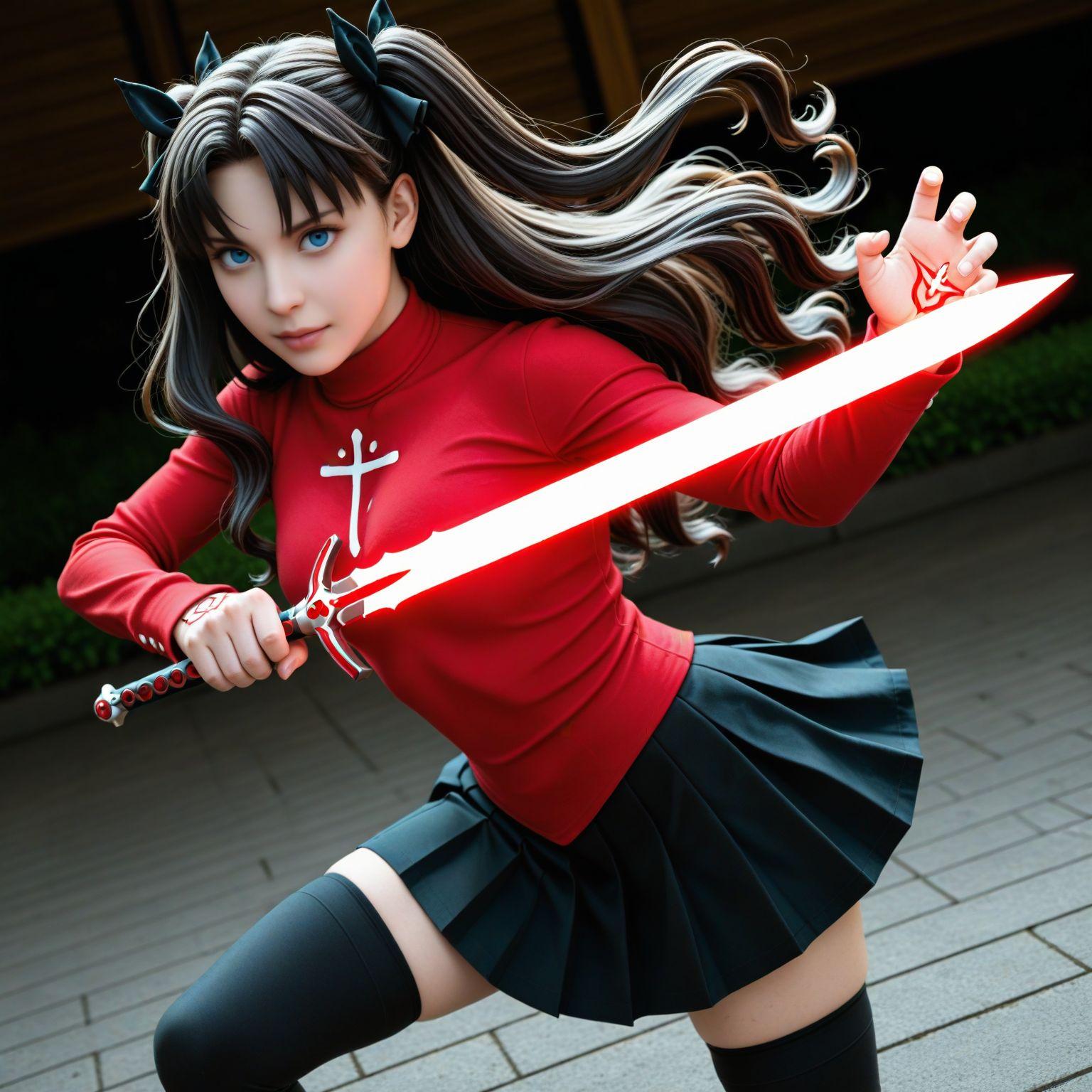 赤い魔剣に宿る意志、制服の十字が物語る信念。その姿は、ただの令嬢ではない。“強く、美しく、迷いなく”立ち向かう彼女の視線が、観る者の心を撃ち抜く。風に揺れる髪と、整った背景が現実と物語の境界線を曖昧にし、まるで“凛がそこに本当にいる”かのような感覚を呼び起こす。これはただのコスプレではなく、遠坂凛という存在の“写実”なのだ。