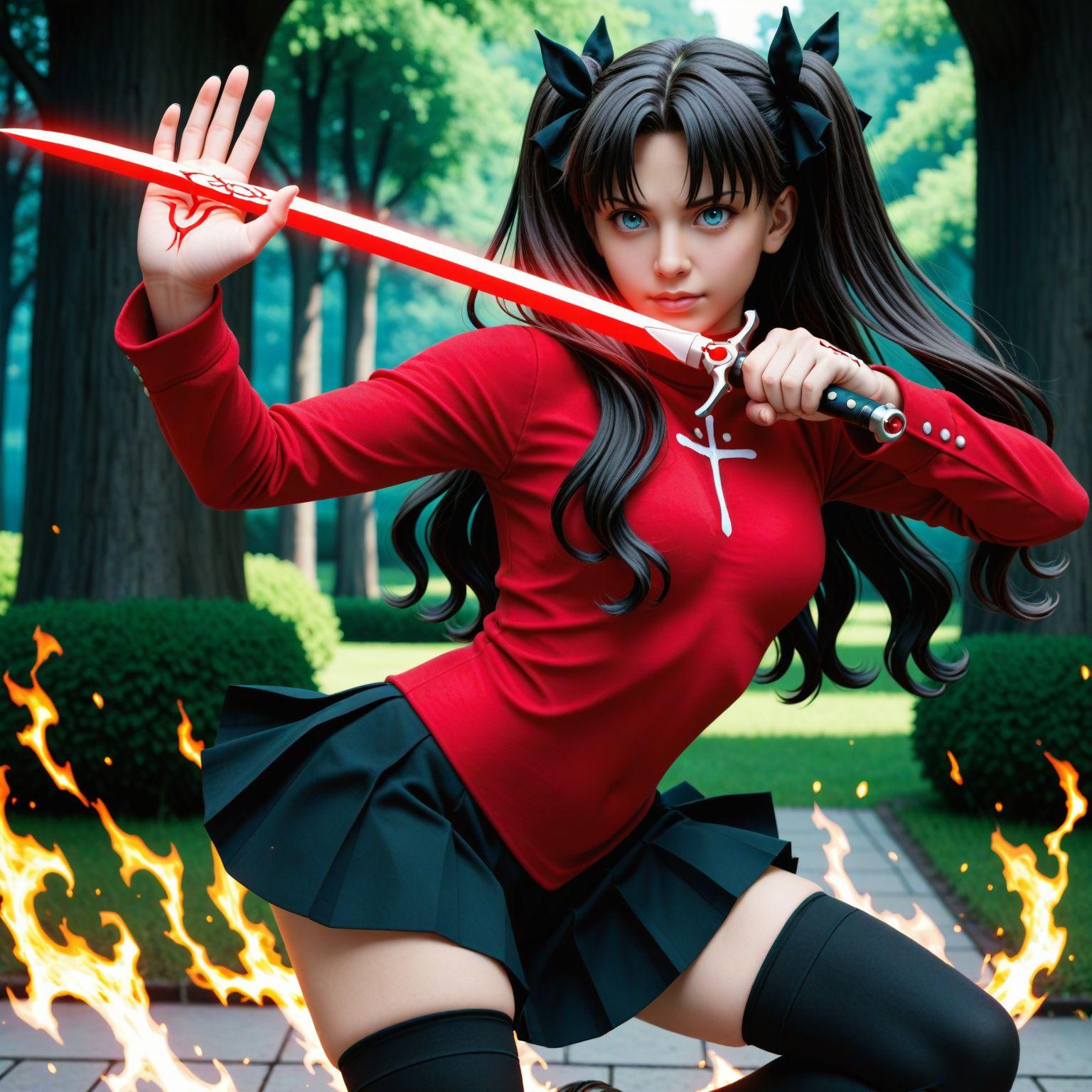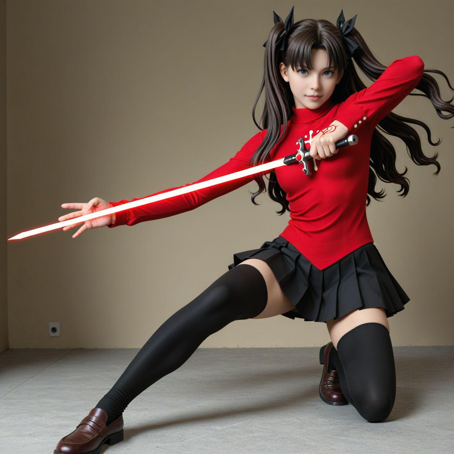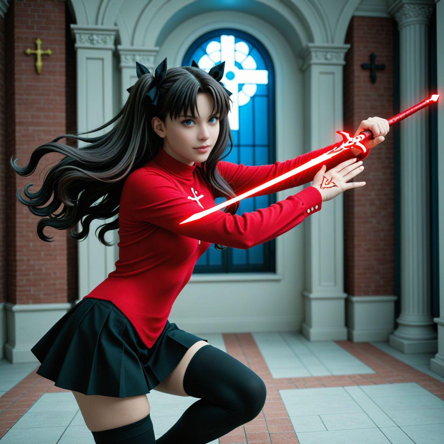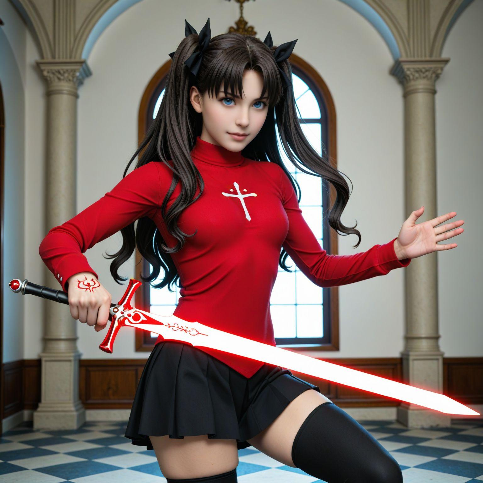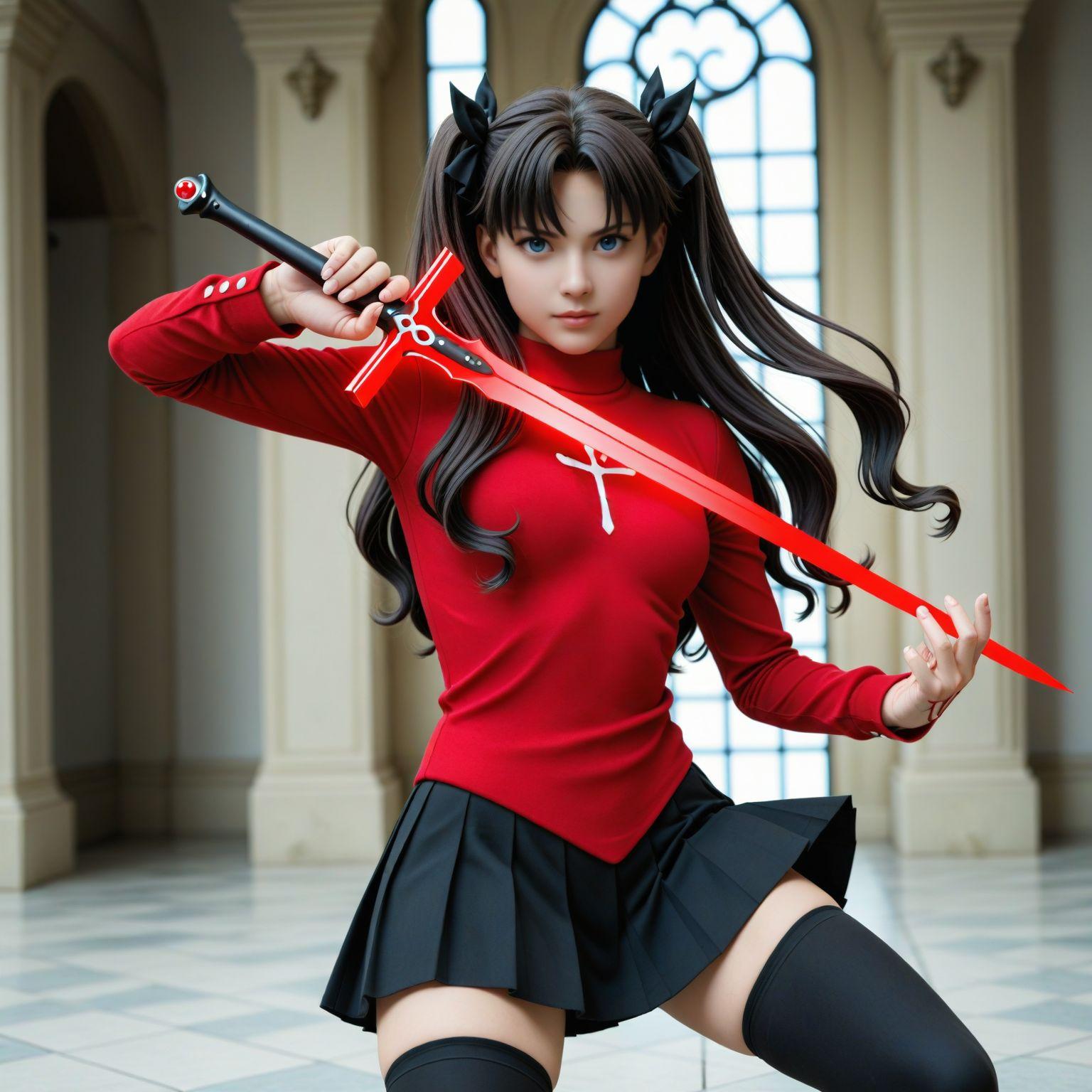 赤い魔剣に宿る意志、制服の十字が物語る信念。その姿は、ただの令嬢ではない。“強く、美しく、迷いなく”立ち向かう彼女の視線が、観る者の心を撃ち抜く。風に揺れる髪と、整った背景が現実と物語の境界線を曖昧にし、まるで“凛がそこに本当にいる”かのような感覚を呼び起こす。これはただのコスプレではなく、遠坂凛という存在の“写実”なのだ。