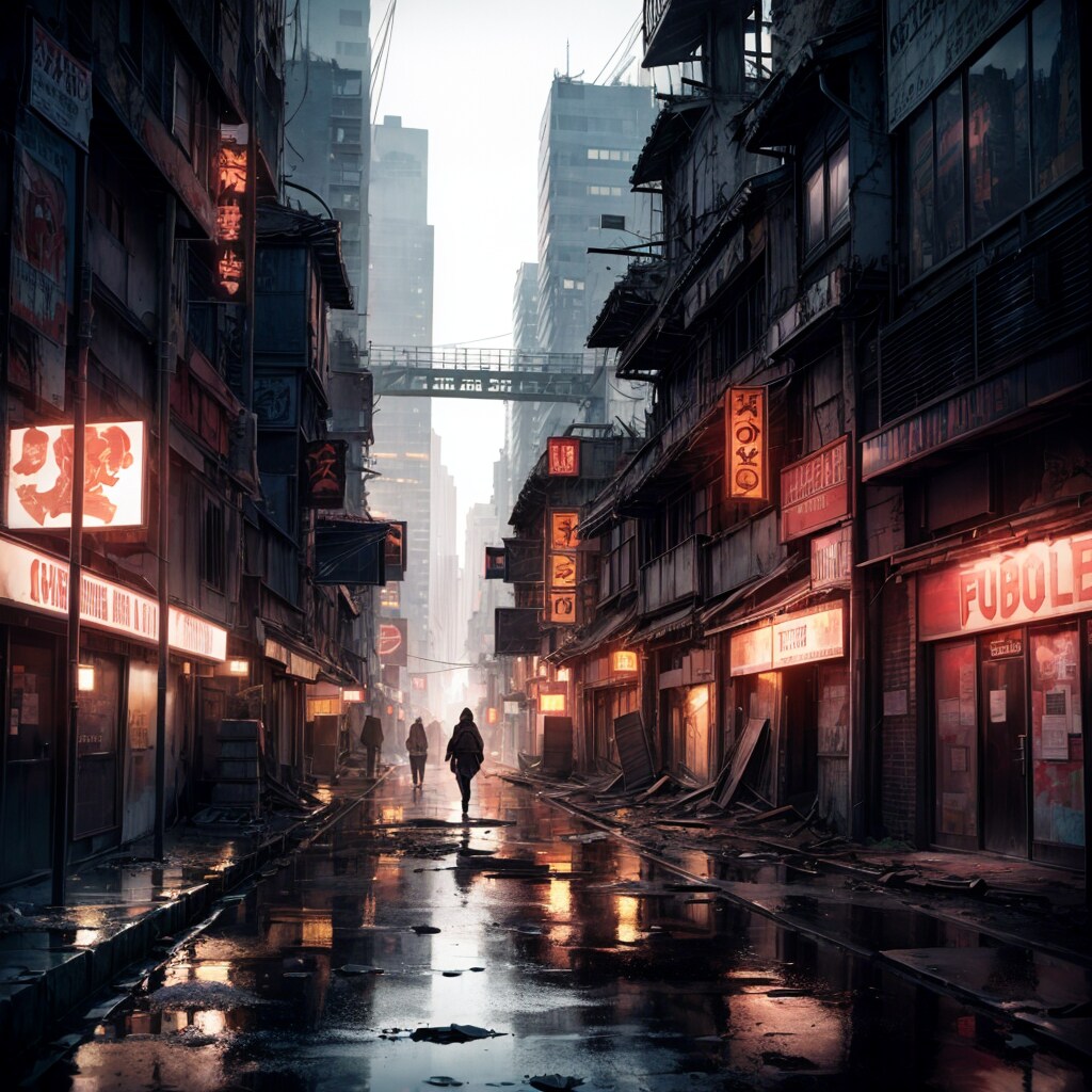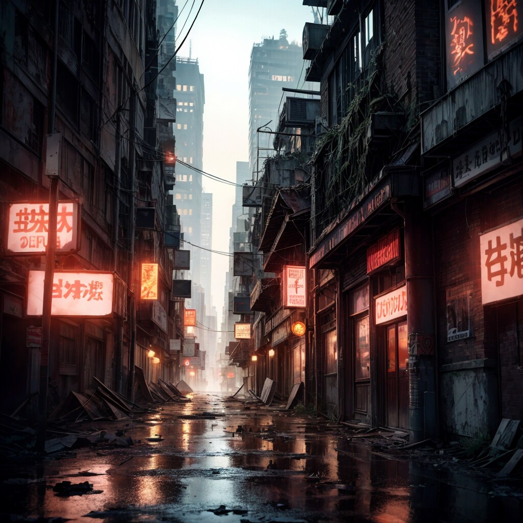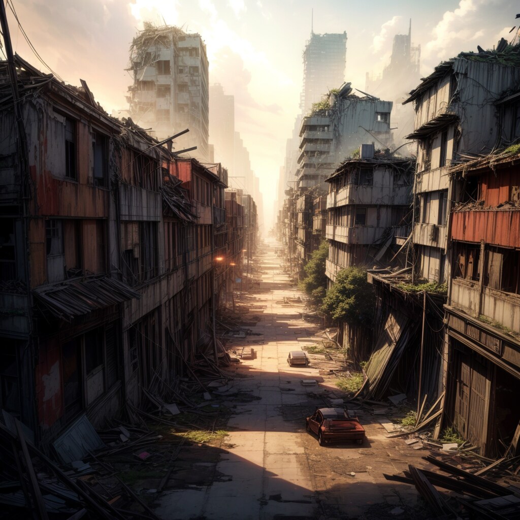 荒廃した繁華街(電力等のインフラは人工知能による業務の自動化によってある程度は供給されているという設定)が好き。