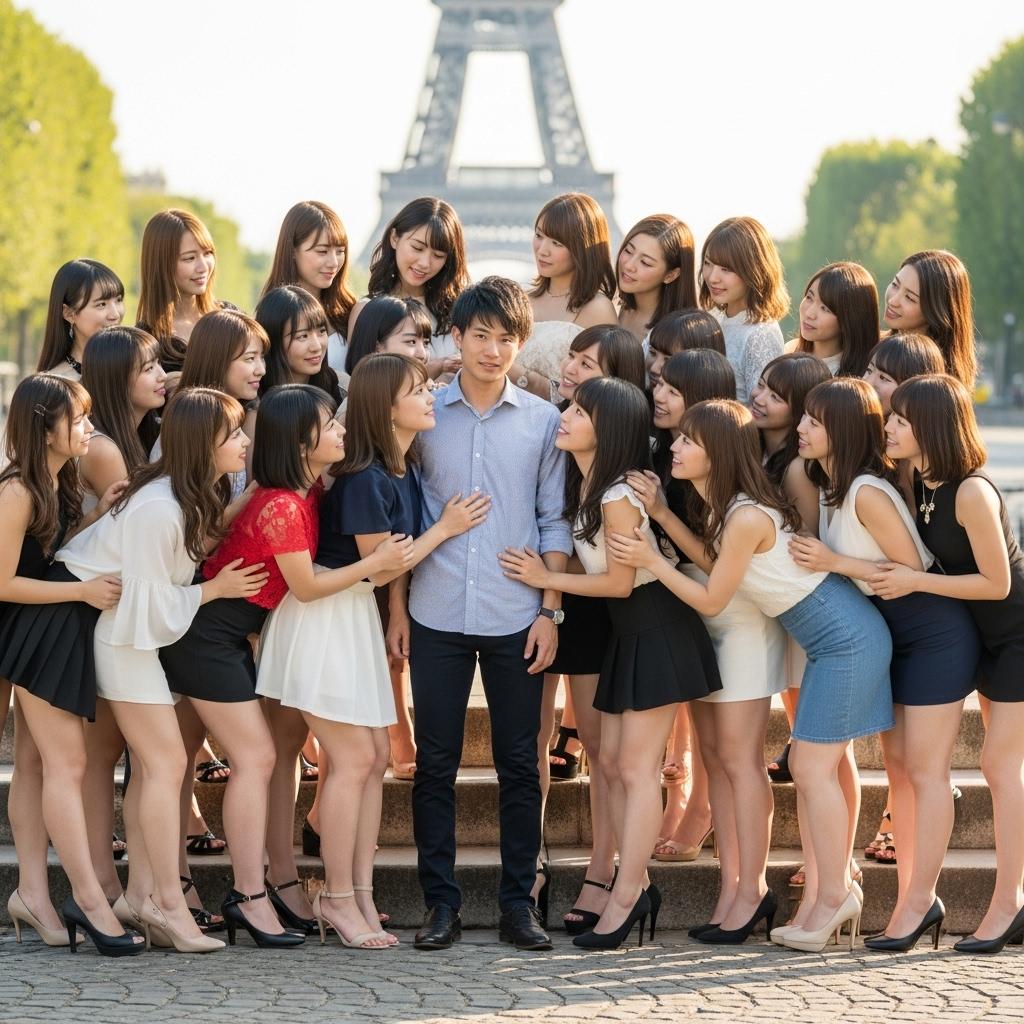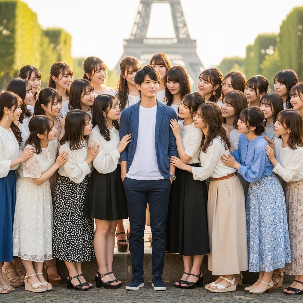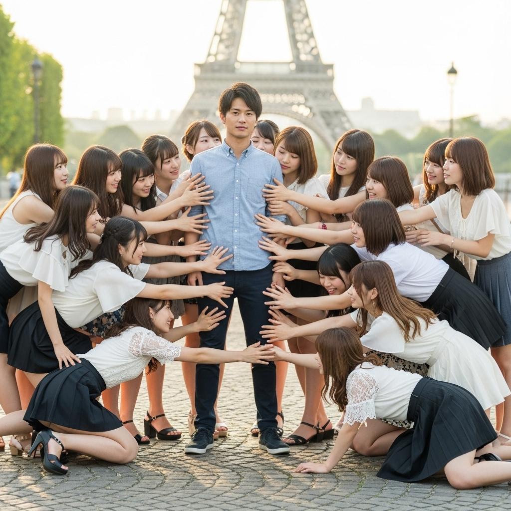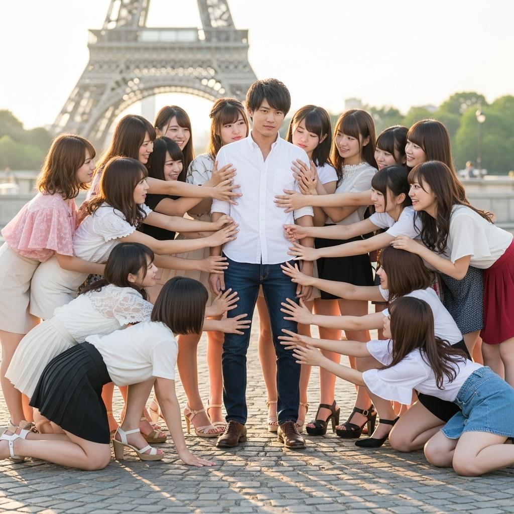 エッフェル塔をバックにもてもての男性です。