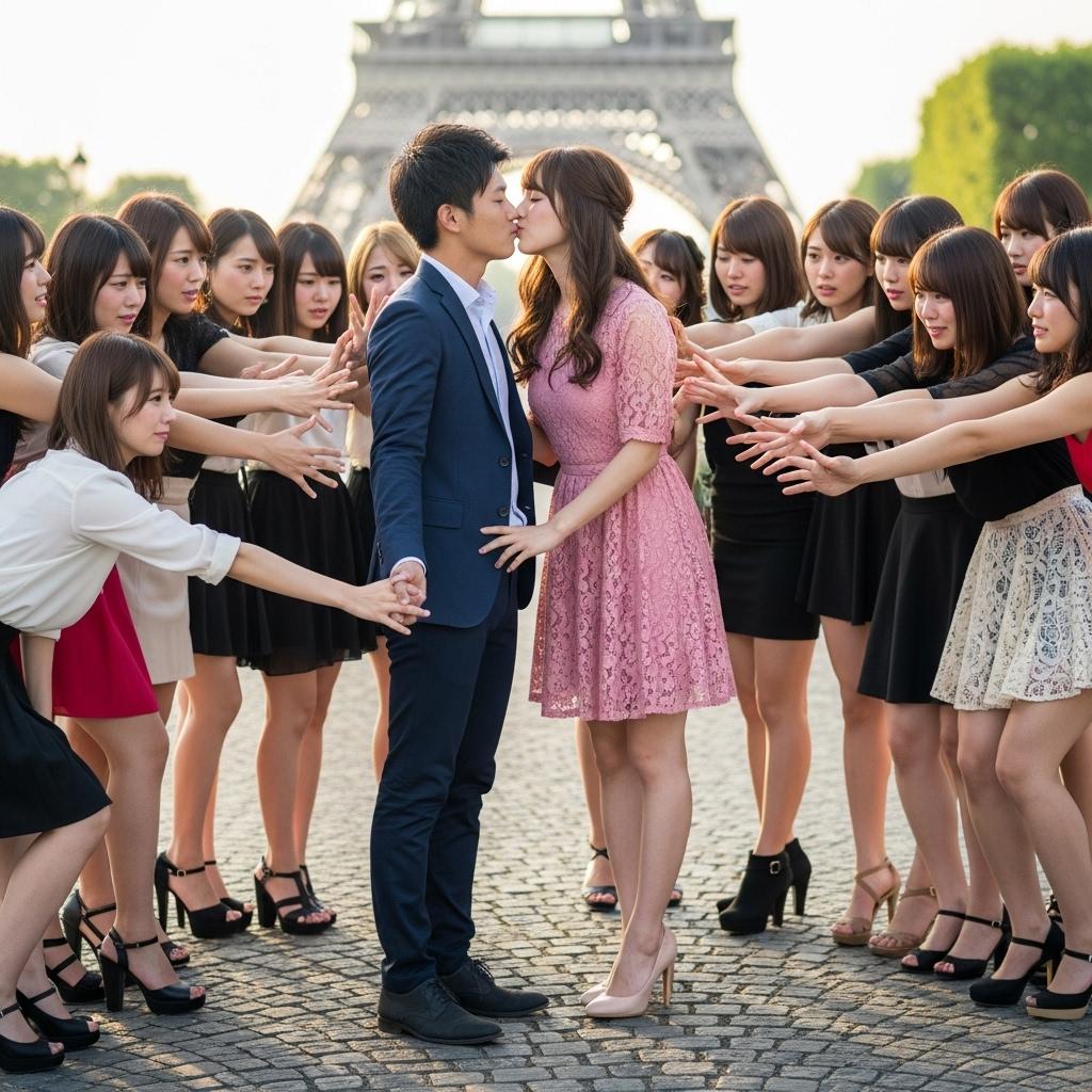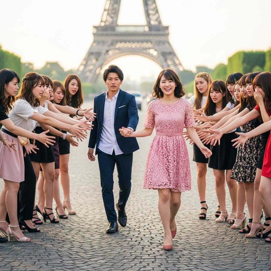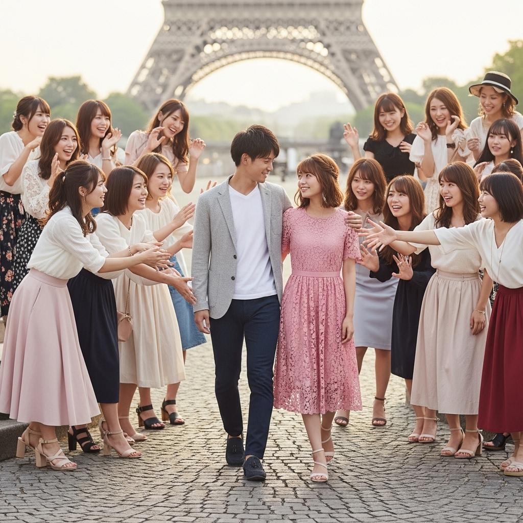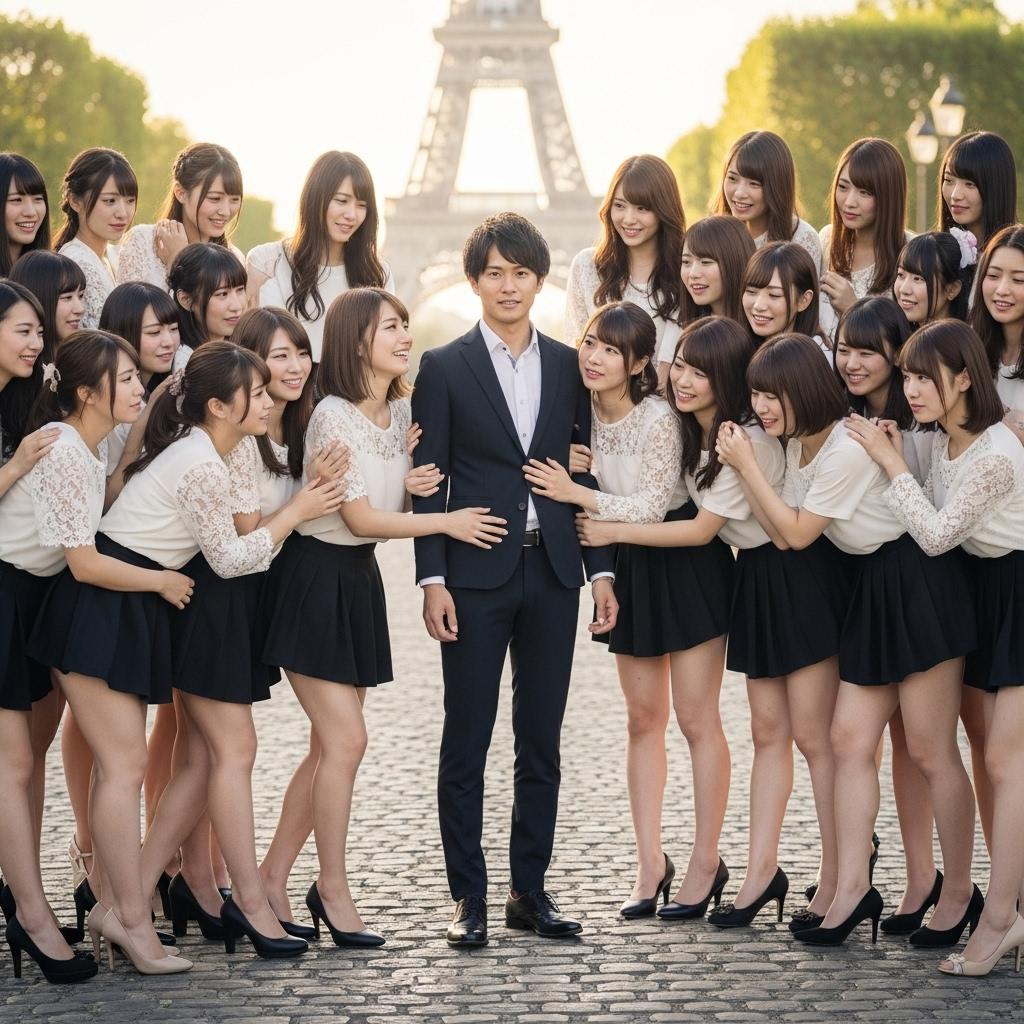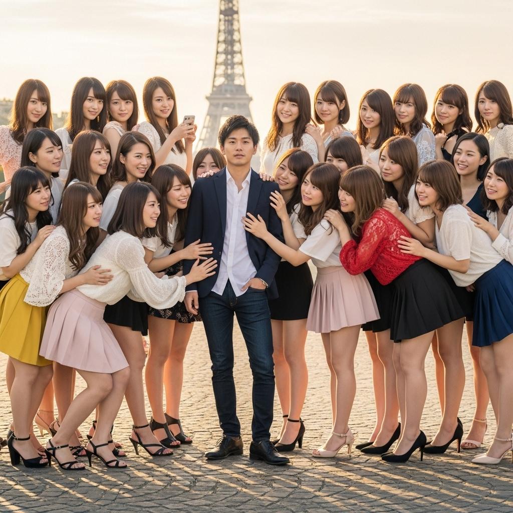エッフェル塔をバックにもてもての男性です。