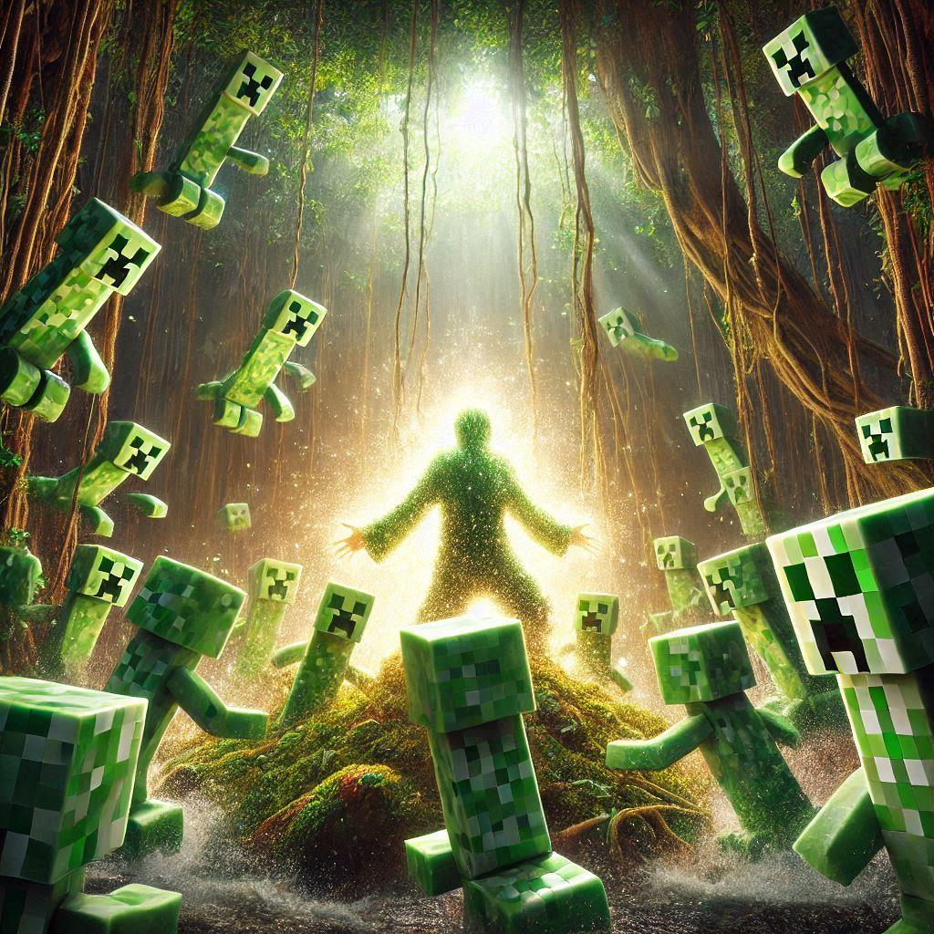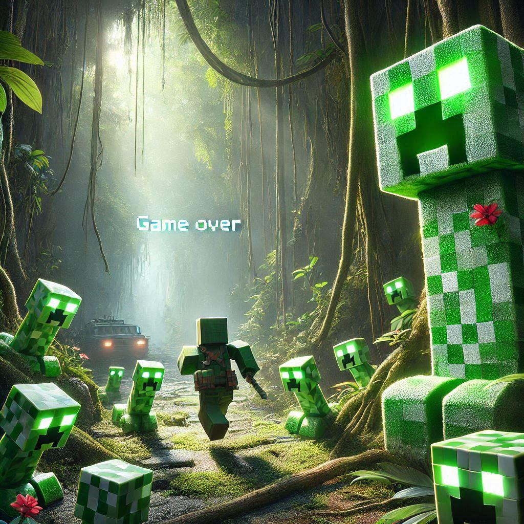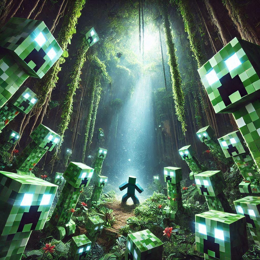 [空欄答え] (マインクラフト)の熱帯雨林で(クリーパー)に囲まれた(プレイヤー)のマクロでフォトリアリスティックな画像。(帯電クリーパーの爆発)の光で(ゲームオーバー)。