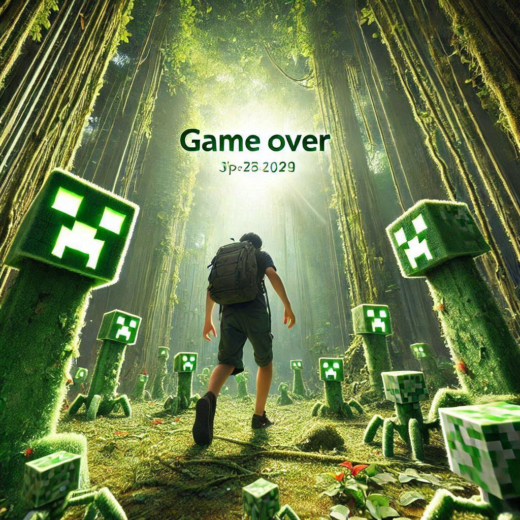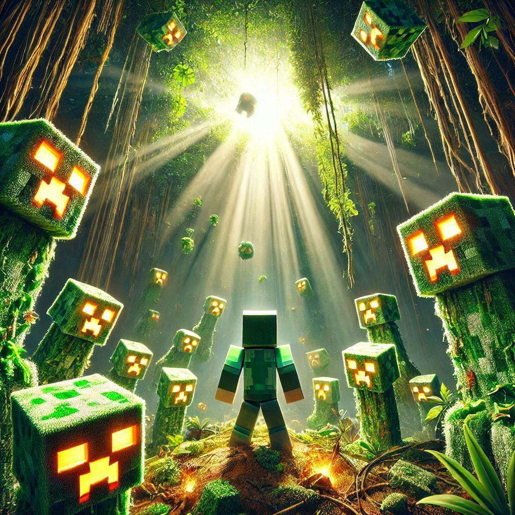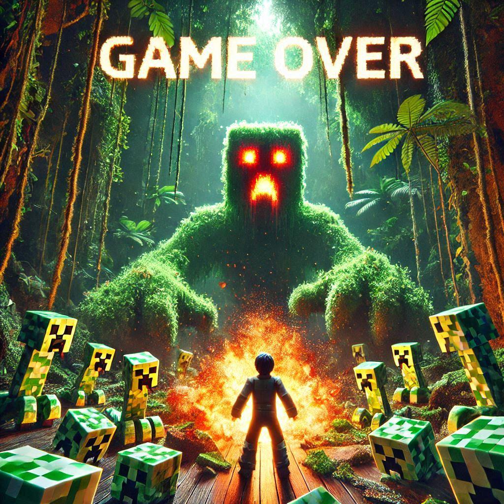 [空欄答え] (マインクラフト)の熱帯雨林で(クリーパー)に囲まれた(プレイヤー)のマクロでフォトリアリスティックな画像。(帯電クリーパーの爆発)の光で(ゲームオーバー)。