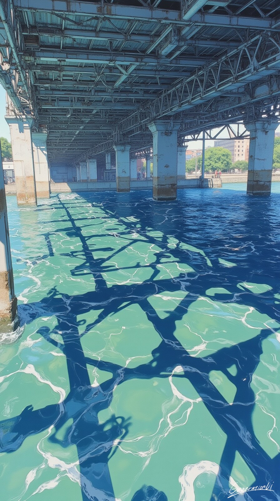 誰もいない橋の下、鉄骨の影だけが律儀に自分の存在を記している。