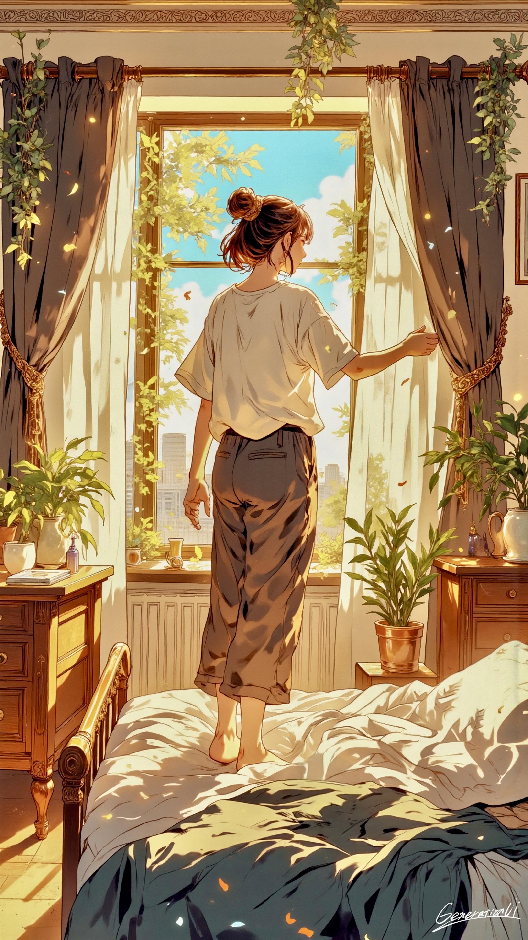 ベッドの上に立ち、そっとカーテンを開けて目に飛び込んできたのは、やわらかな朝陽と揺れる緑、そして少し遠くの都会の輪郭。