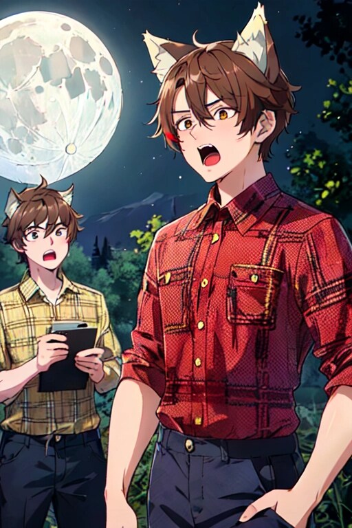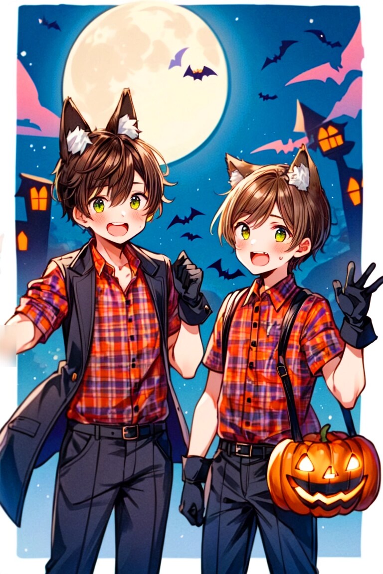 ブラウン短髪少年は犬や狼なイメージがあるので、ハロウィンといえば狼男かなと思い、色々ググったら、赤チェックな狼男な多かったので、赤チェック服の狼男で生成してみました。