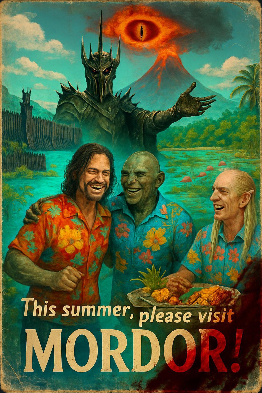 モルドールの黒門と死者の沼地の超リアルな4K解像度写真が特徴で、熱帯の楽園のような鮮やかな色で、アロハシャツを着た人間とエルフがオークたちに温かく迎えられ、素晴らしい料理を振る舞われています。