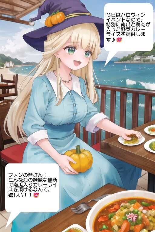 猫屋敷ユキ:今日はハロウィンイベントなので、特別に南瓜と鶏肉が入った野菜カレーライスを提供します♪😍