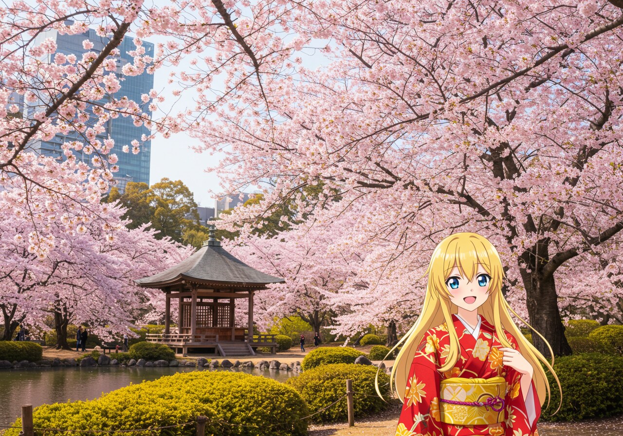 アニメの世界から桜を見に現実世界の観光地にやってきた女の子達♪
