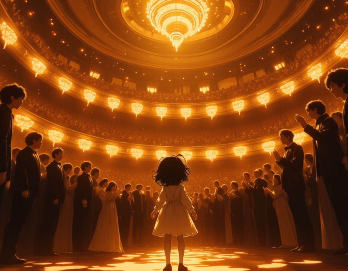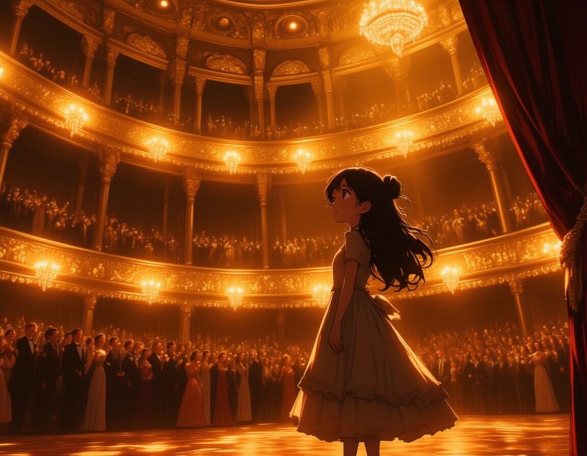 A grand opera house illuminated by golden chandeliers,featuring an 8-year-old girl with large,expressive black eyes and fluffy black hair,standing confidently on stage. She is small and delicate in stature,wearing a classic yet elegant dress that enhances her youthful charm. The girl sings a powerful and emotional aria,her voice resonating beautifully throughout the hall. The audience,dressed in formal evening attire,stands in unison,giving a heartfelt standing ovation. The atmosphere is one of awe and inspiration,capturing the magic of a breathtaking performance. The scene is photorealistic,with intricate details of the stage design,the girl's delicate features,and the grandeur of the opera house,emphasizing the warm lighting and the emotional expressions of the audience.,
